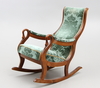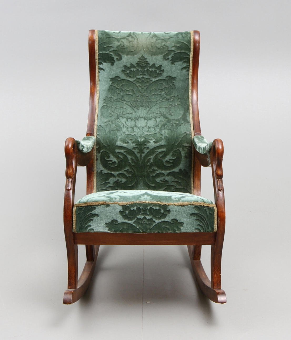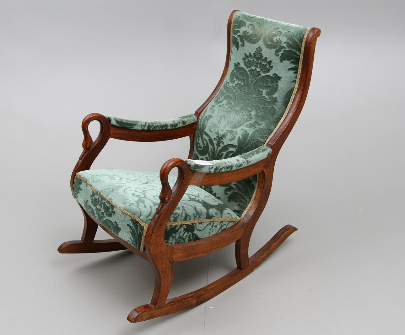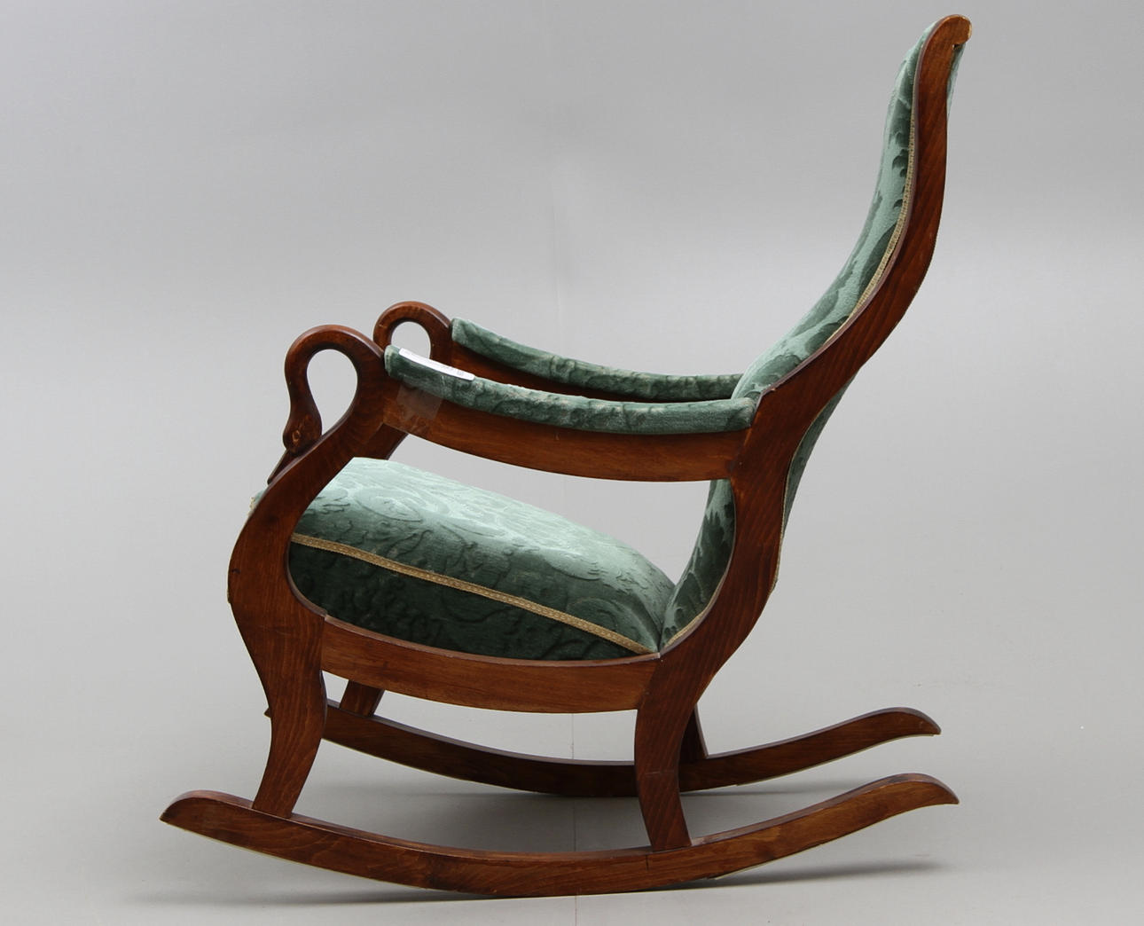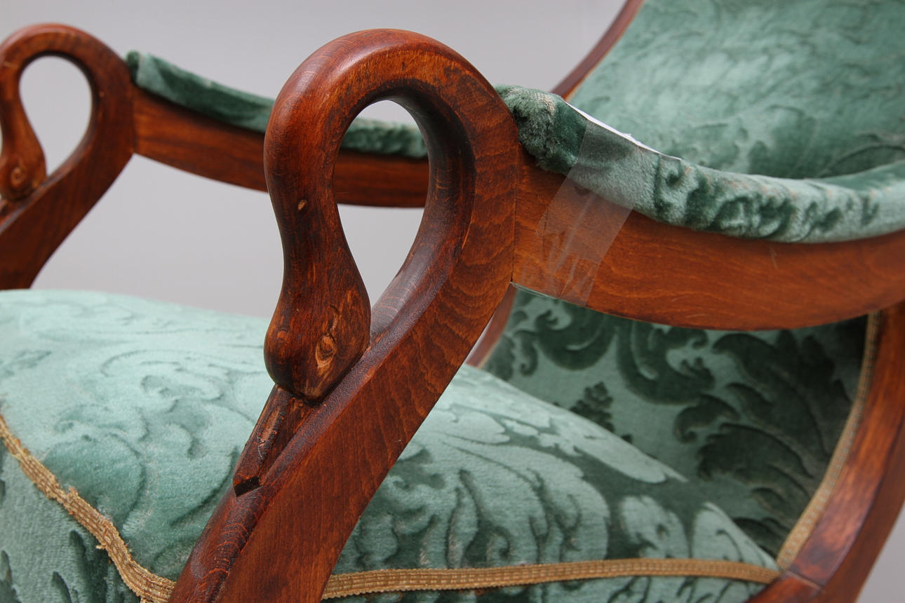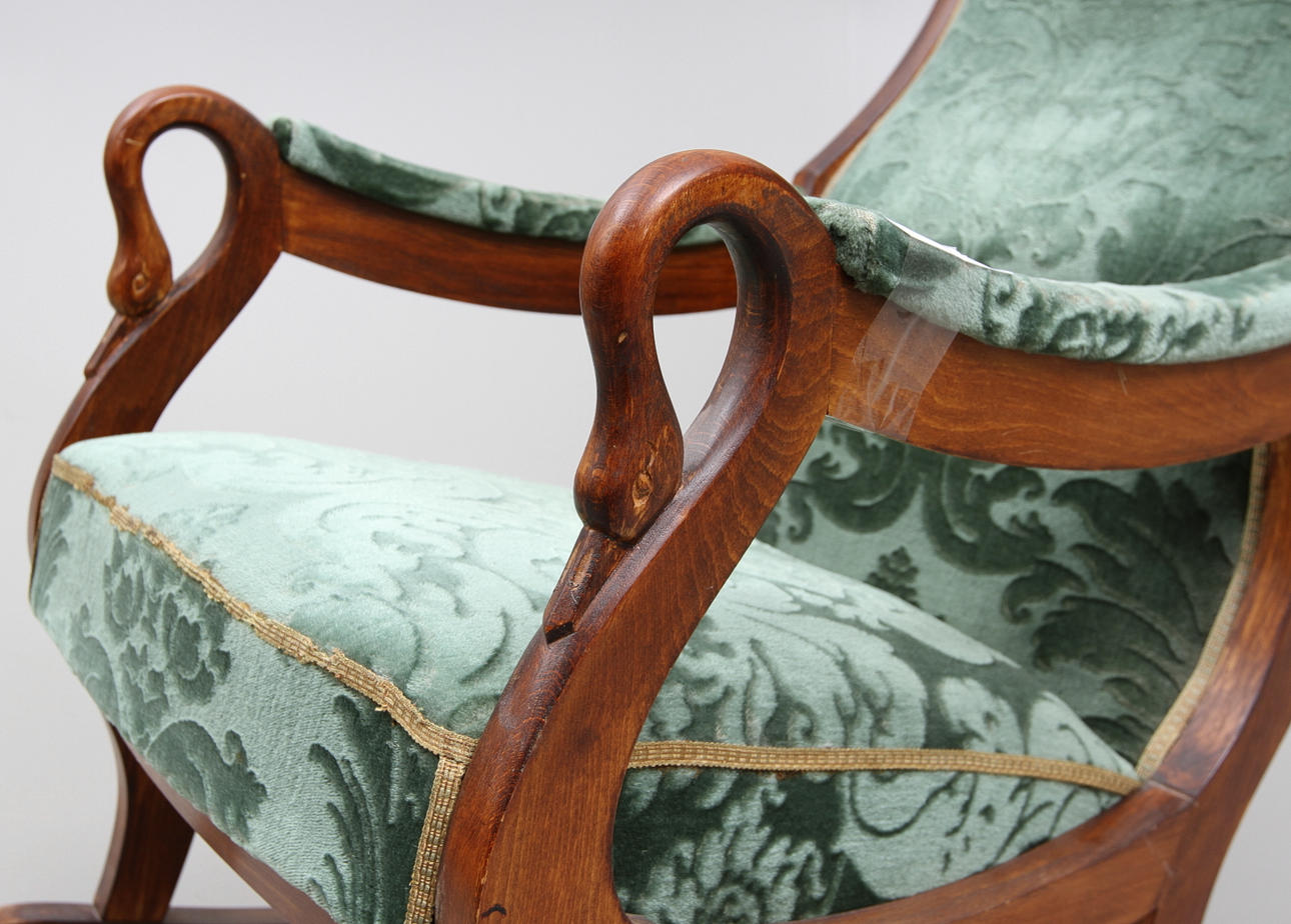 Stomme av betsad björk, skuren dekor med svanar, klädd med grönt tyg.
