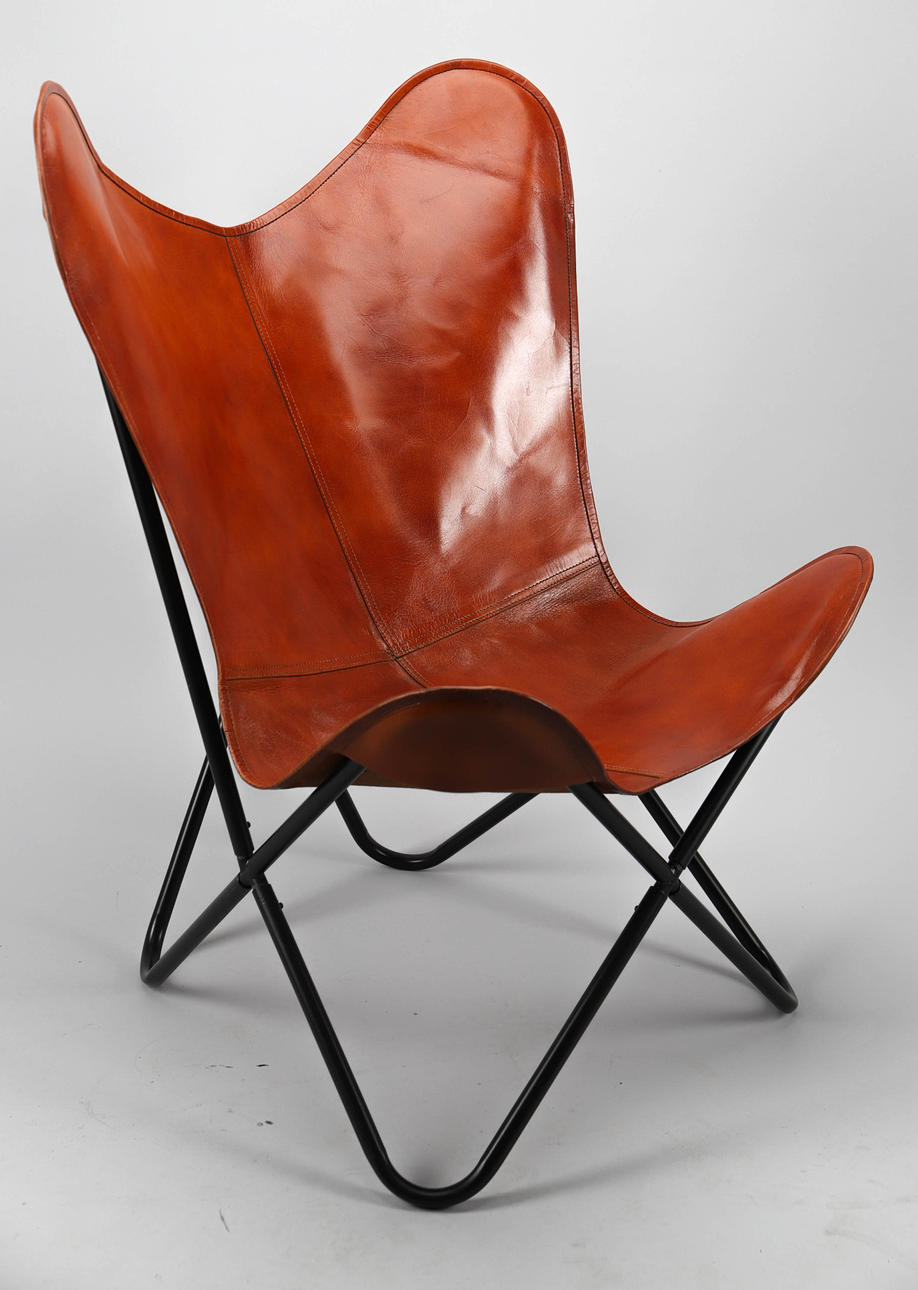 FLADDERMUSFÅTÖLJ, läder och stål, samtida.
