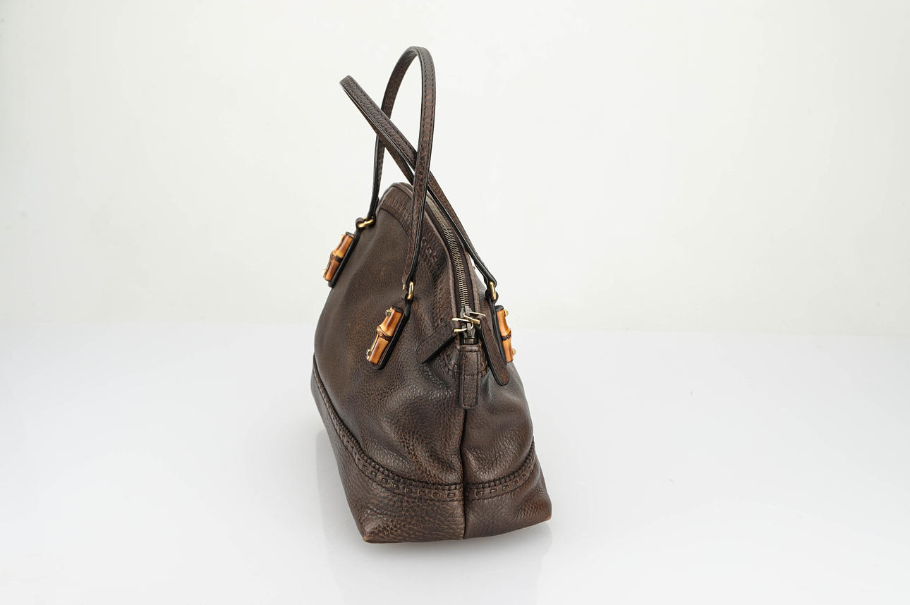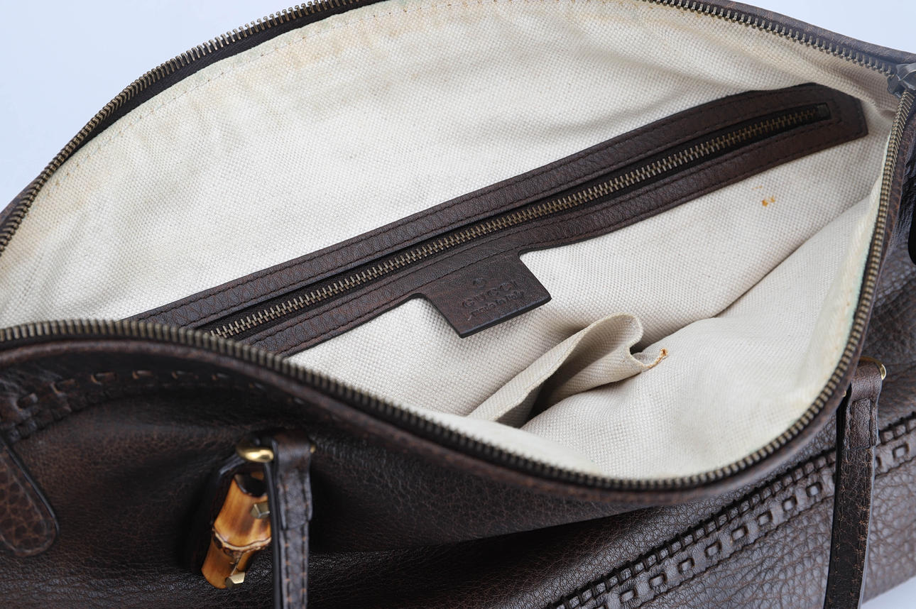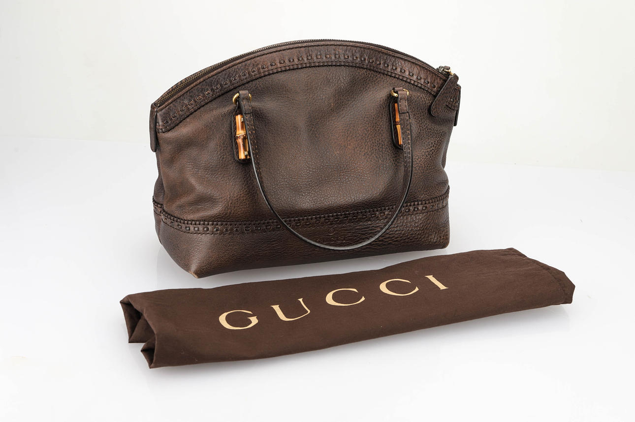 Bambudetaljer, inredd md tre fickor varav en med dragkedja. Textilfodrad. Märkt Gucci made in Italy, numrerad. 25x30x15 cm. Dustbag.