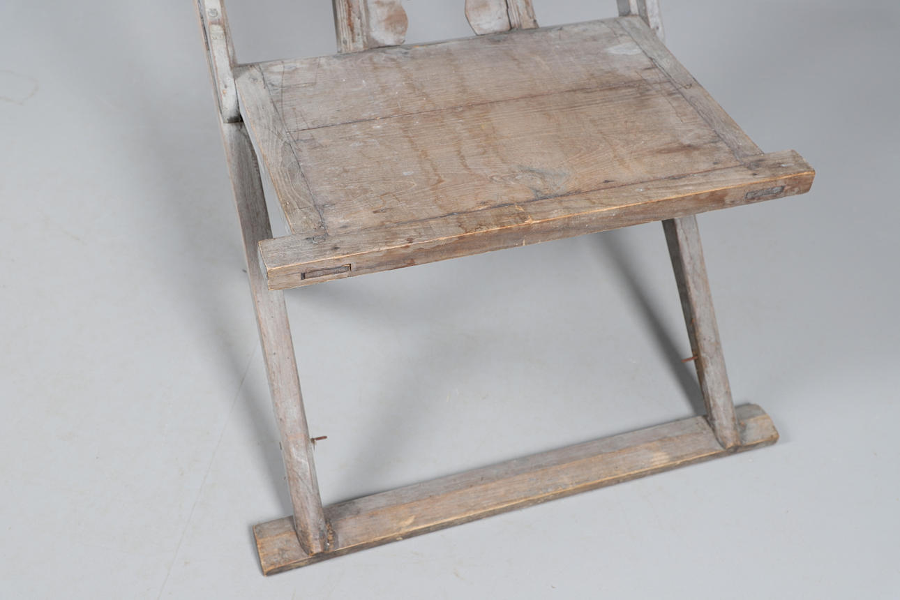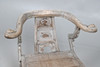 Stolen har tappat färg genom åren och är lite torr, träbit saknas framtill, flis runt fötterna, små sprickor på armarna.