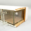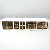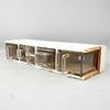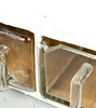 Slitage, en skeppa med skada i ett hörn på framsidan. Hyllan saknar skiva vid ena gaveln.