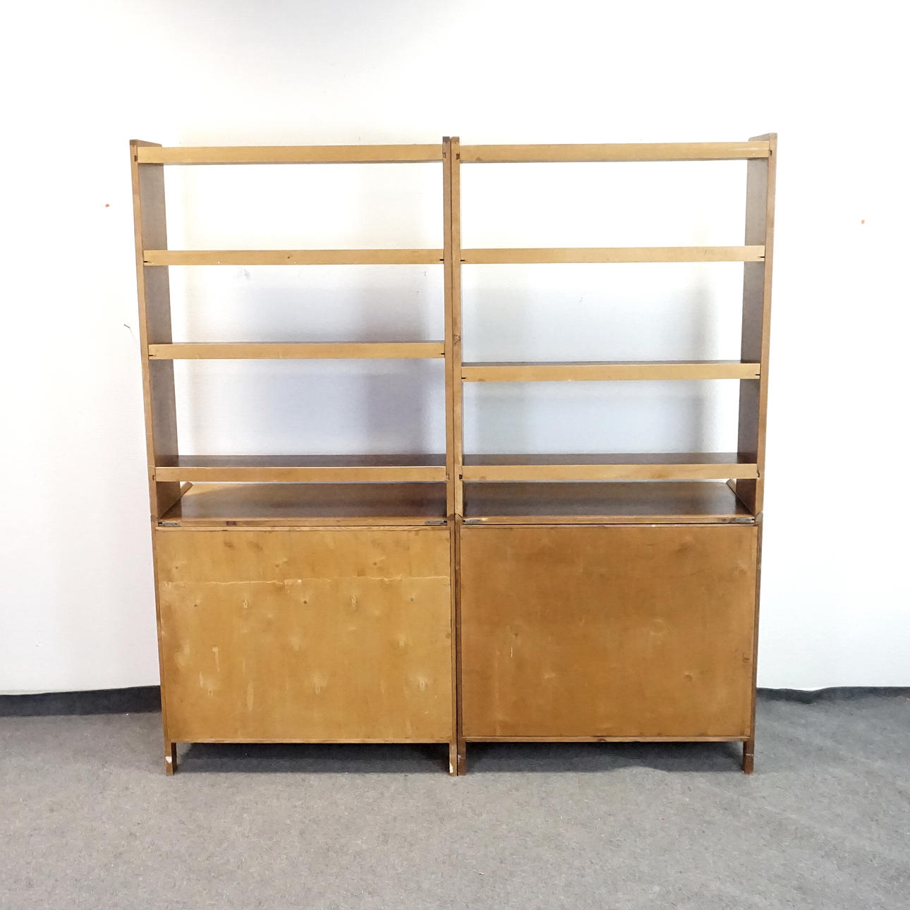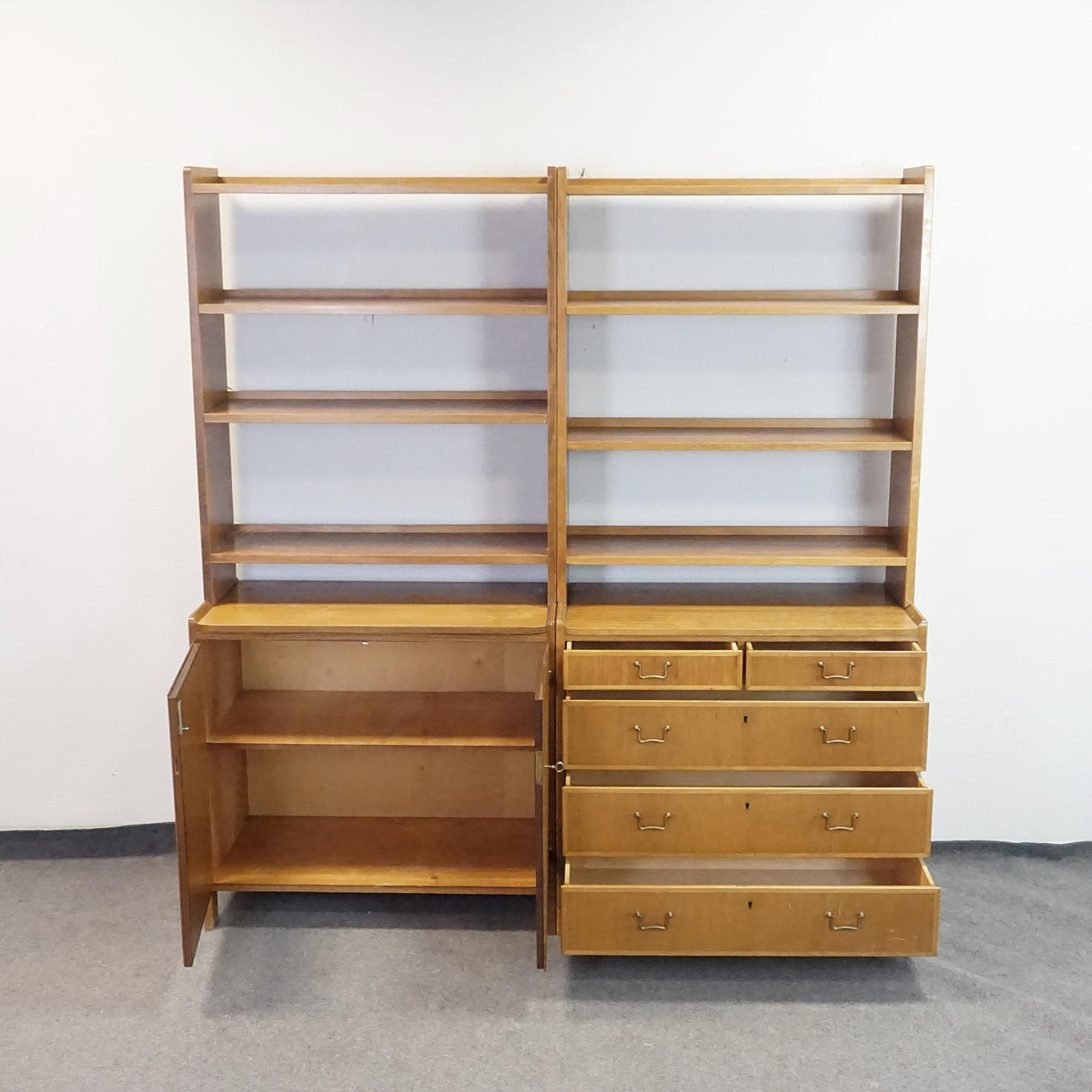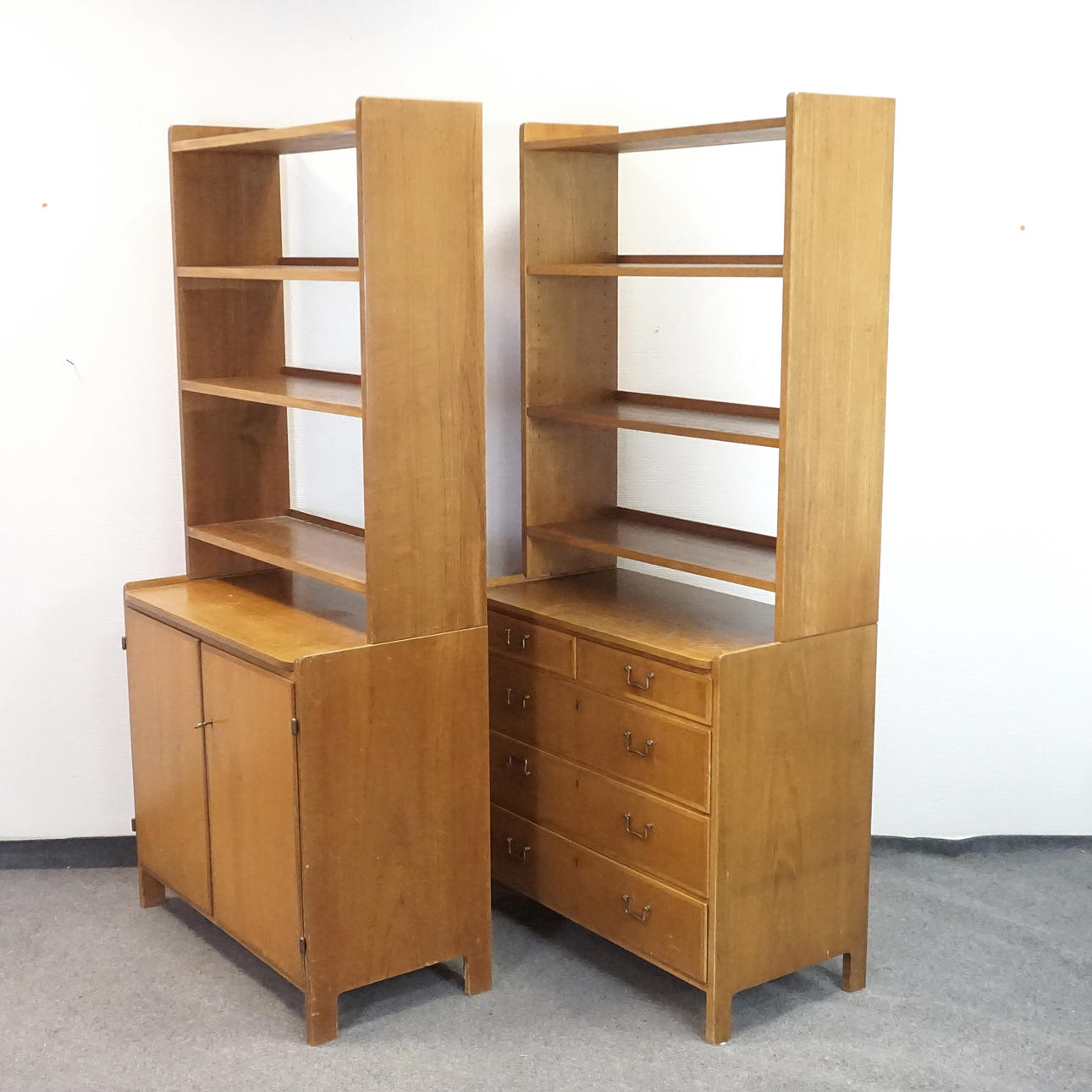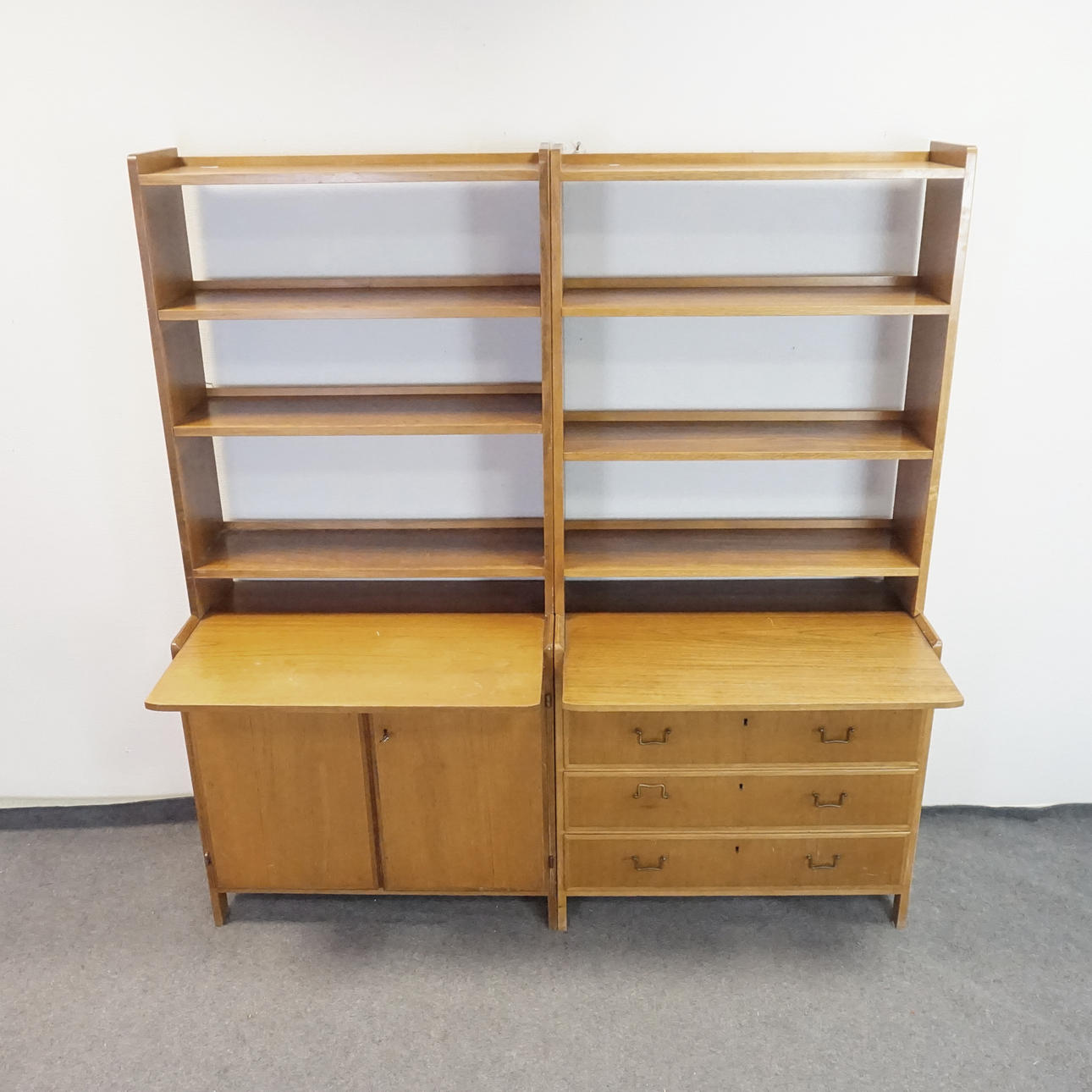 Två stycken tvådelade hyllor, överdelar med 3 hyllplan vardera. Framskjutande underdelar med utdragbara skivor, en med 2 små samt 3 större låsbara lådor, en med ett dörrpar med en bakomliggande hylla.