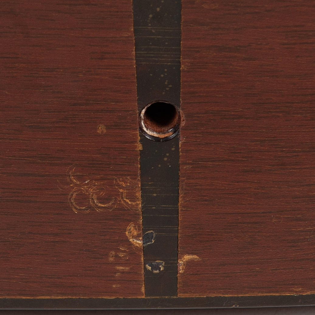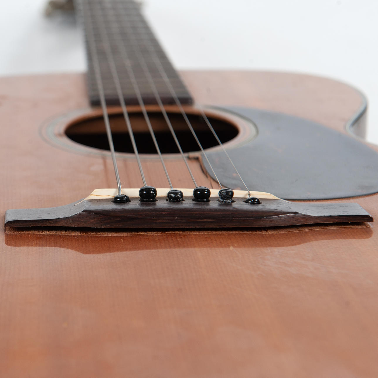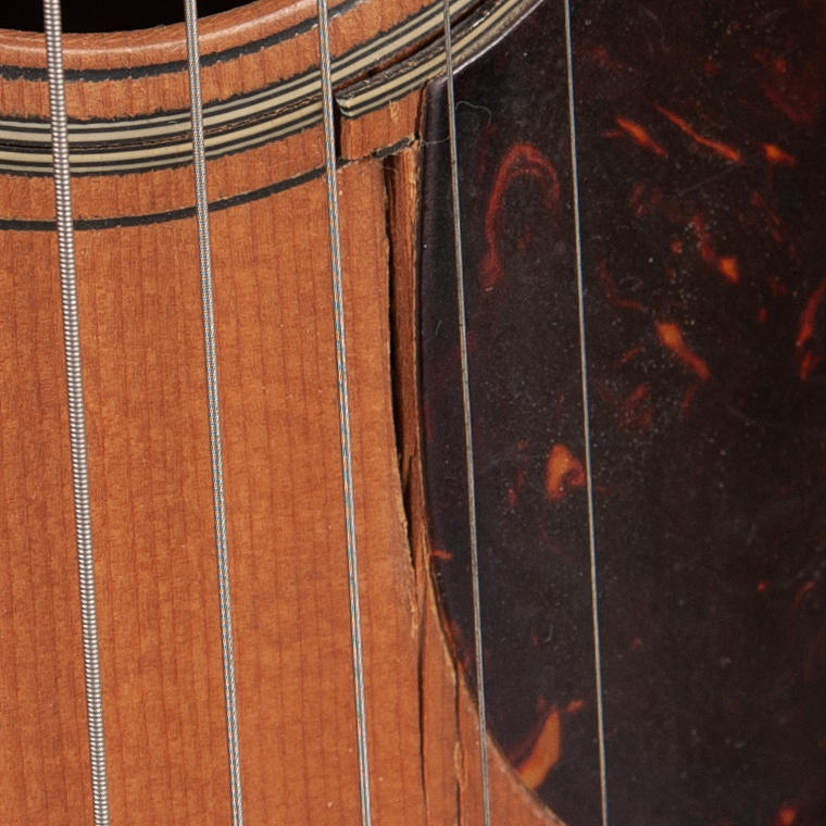 Spricka (ca 5cm) i kanten av plektrumskyddet mellan resonanshålet och stallet.