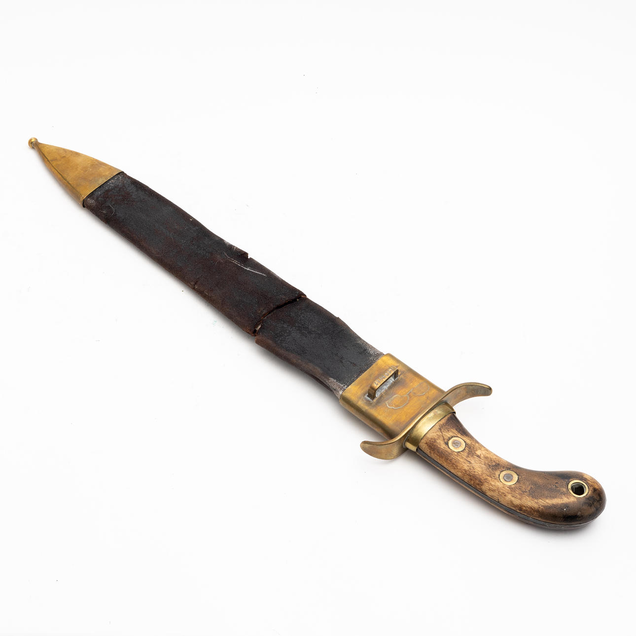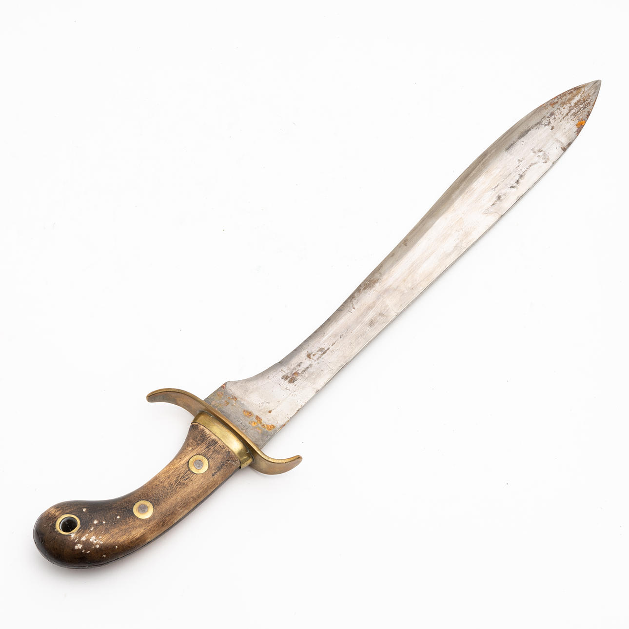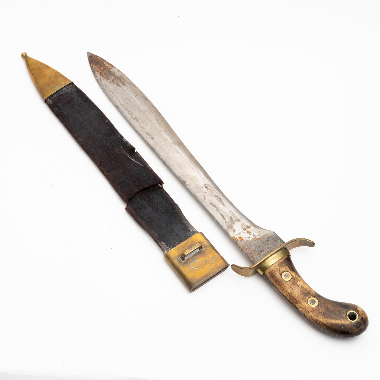 Mässingsfäste med kavelplattor av trä, eneggat blad med flat rygg, längd 43, total längd 58 cm. Balja av svart läder med mässingsbeslag.