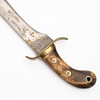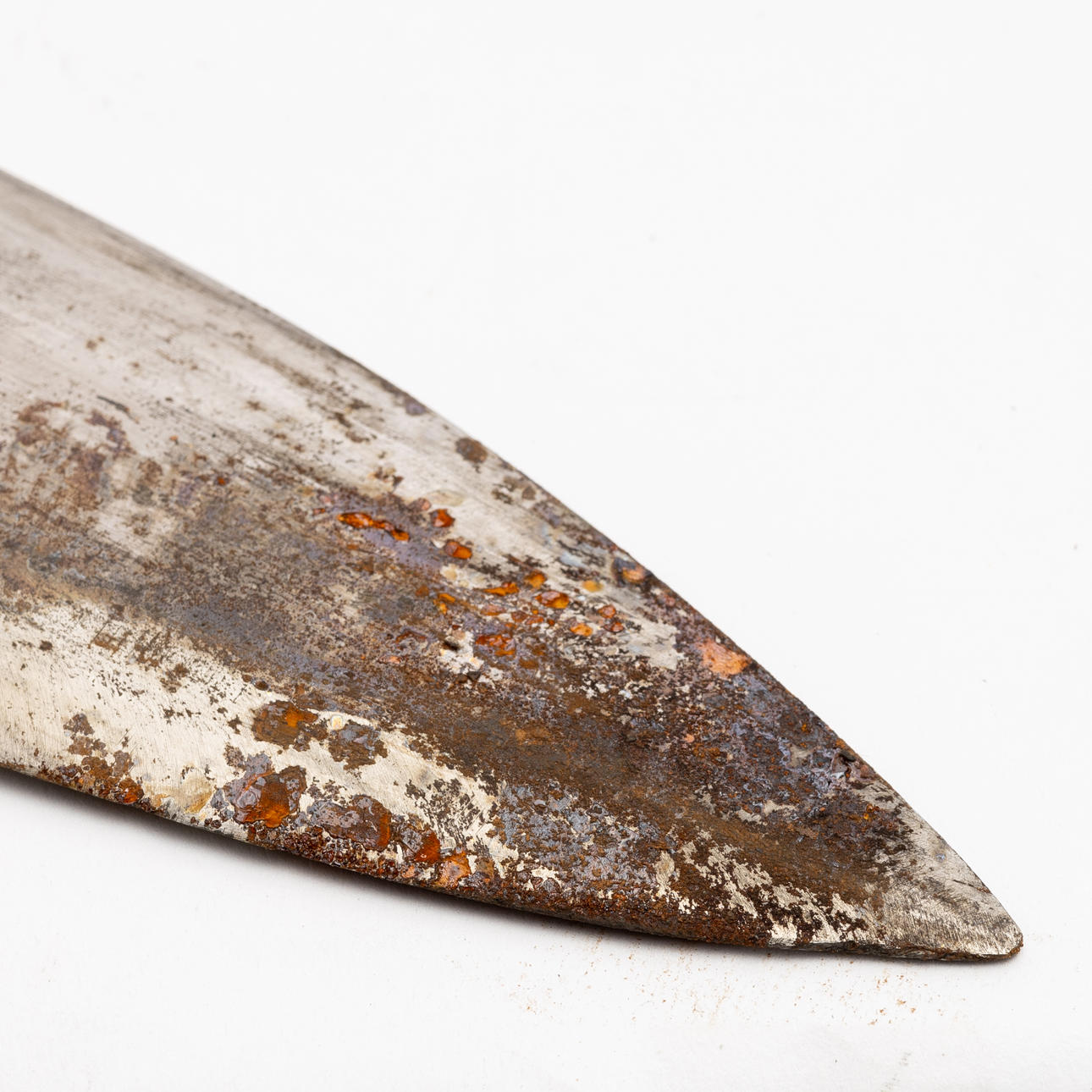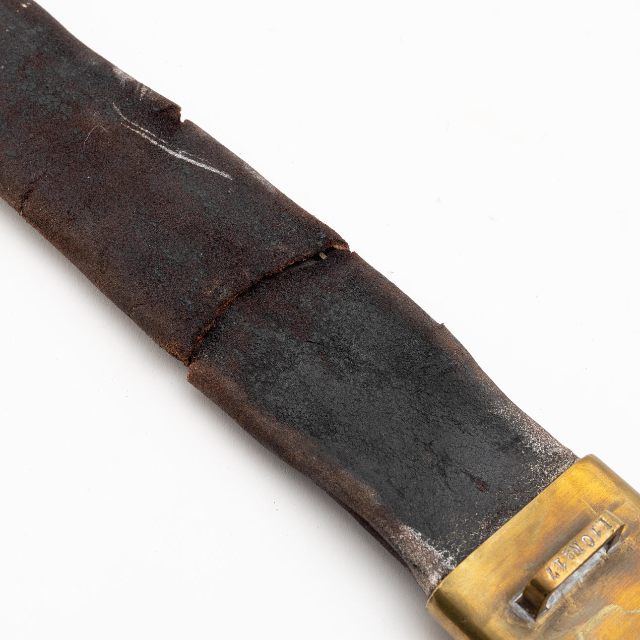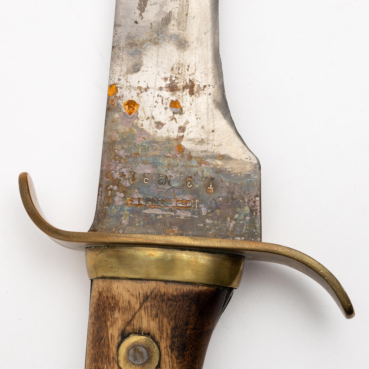 Mässingsfäste med kavelplattor av trä, eneggat blad med flat rygg, längd 43, total längd 58 cm. Balja av svart läder med mässingsbeslag.