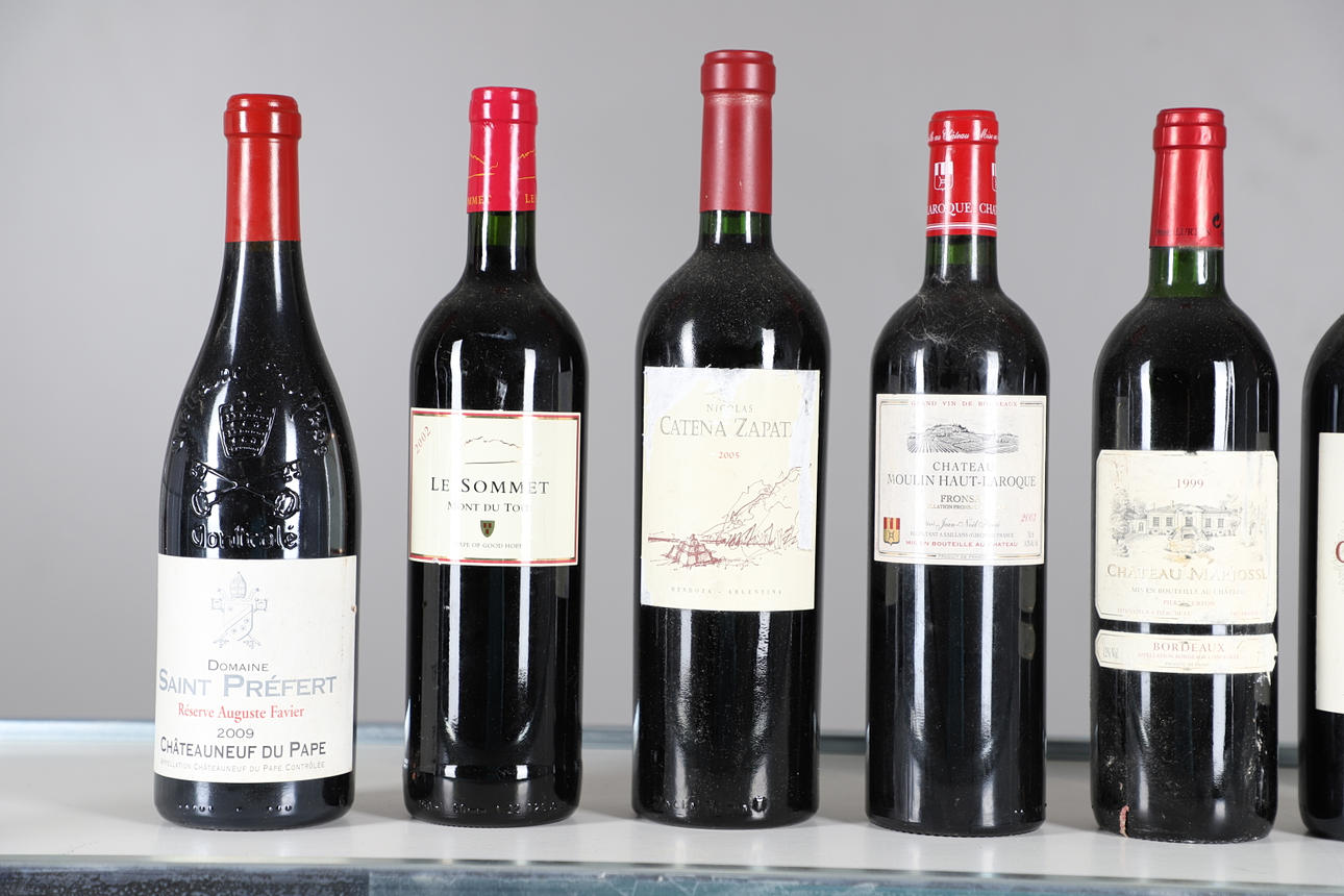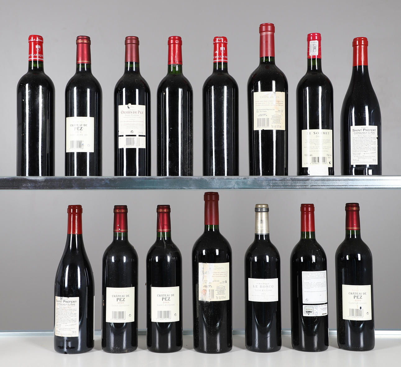 Ett blandat parti inklusive Chateau Moulin Haut Laroque 2003 (x2), Chateau de Pez Saint Estephe 1999 (x3), Domaine Saint Prefert Chateauneuf du Pape 2009 och olika andra flaskor. (15)