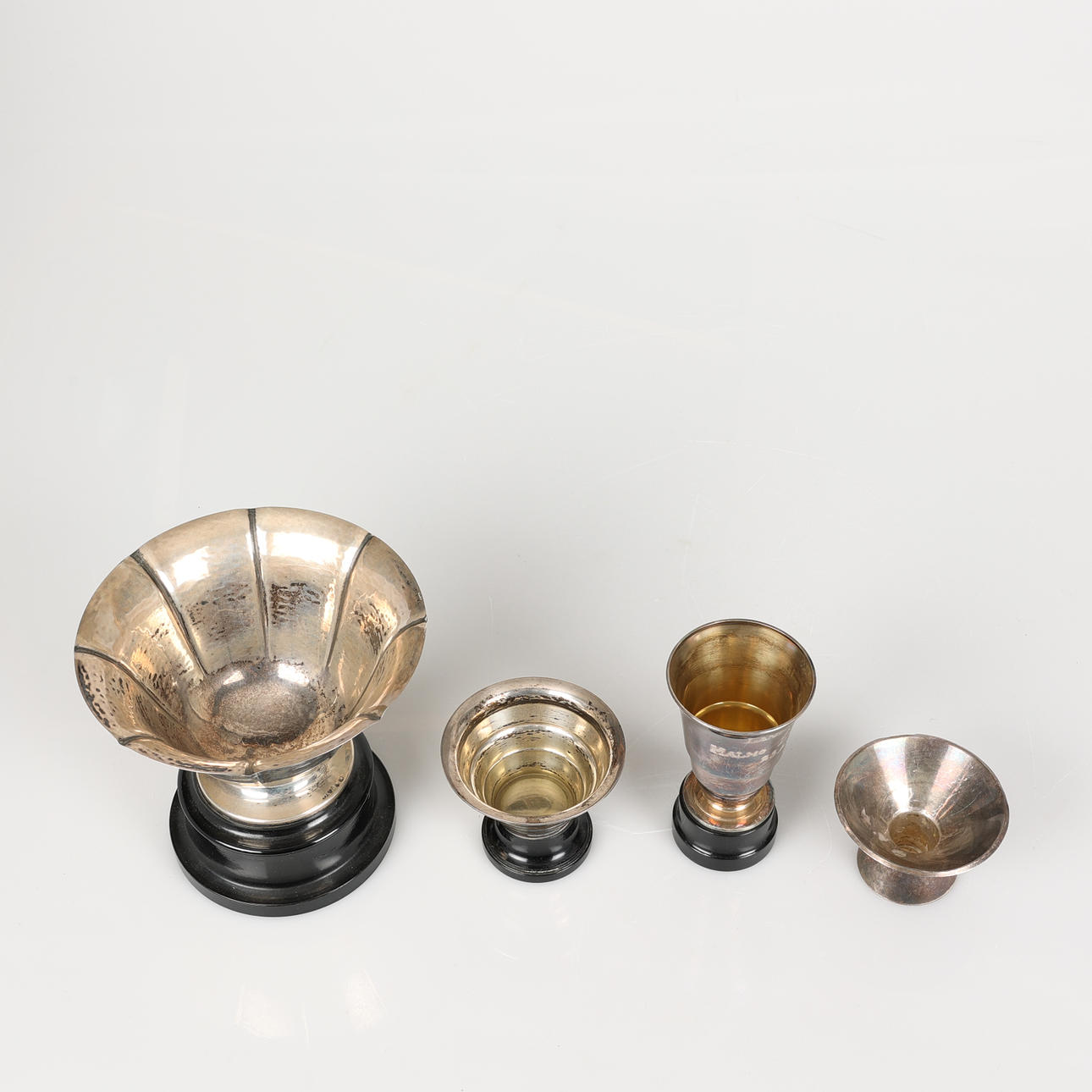 3 pokaler i silver med fot av trä