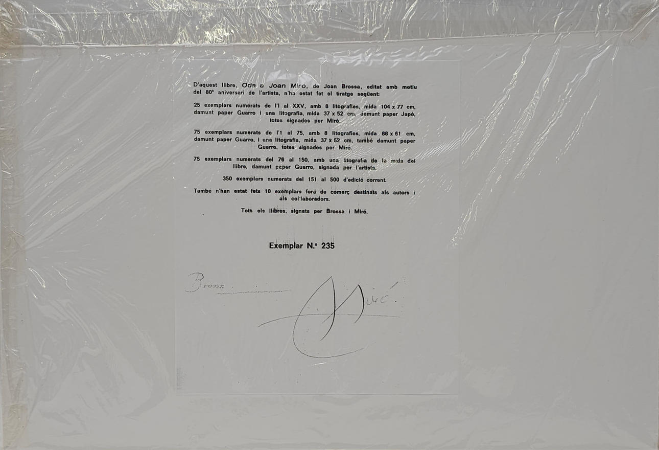 Från boken ”Ode till Joan Miró”, av Joan Brossa, publicerad i anledning av hans 80-årsjubileum, med bilder av Joan Miró. Prov 235/500 33,5x49 cm.