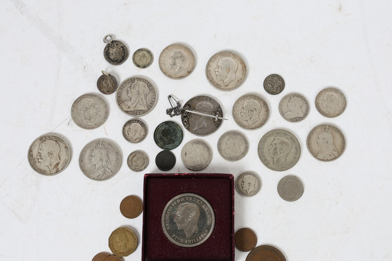 inklusive viktorianska silverhalvkronor, ett tidigt viktoriansk emaljerat broschmynt tillsammans med en samling silverhalvkrona, shilling, floriner och sixpences (antal).