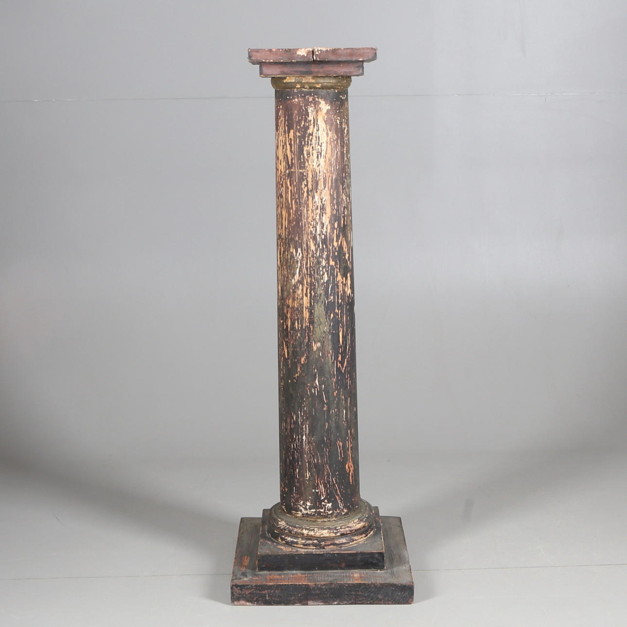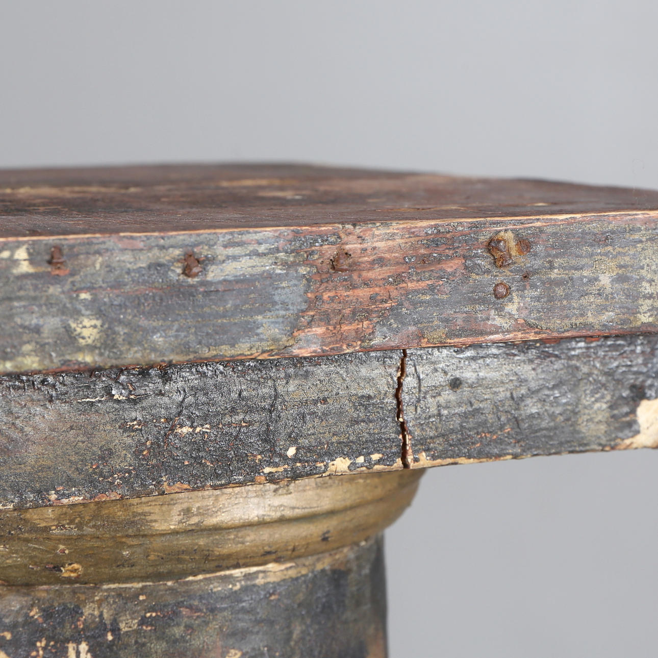 Hårt slitage, rester av äldre bemålning samt spikrester efter gammal klädd fot.