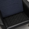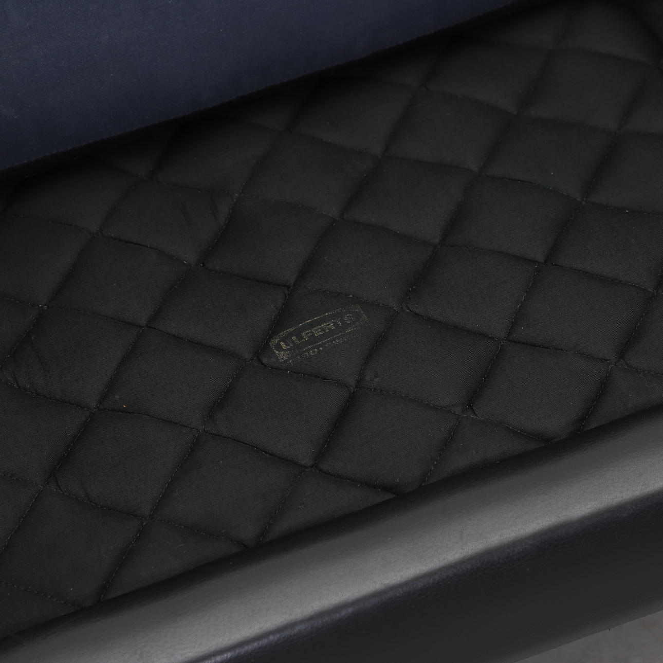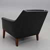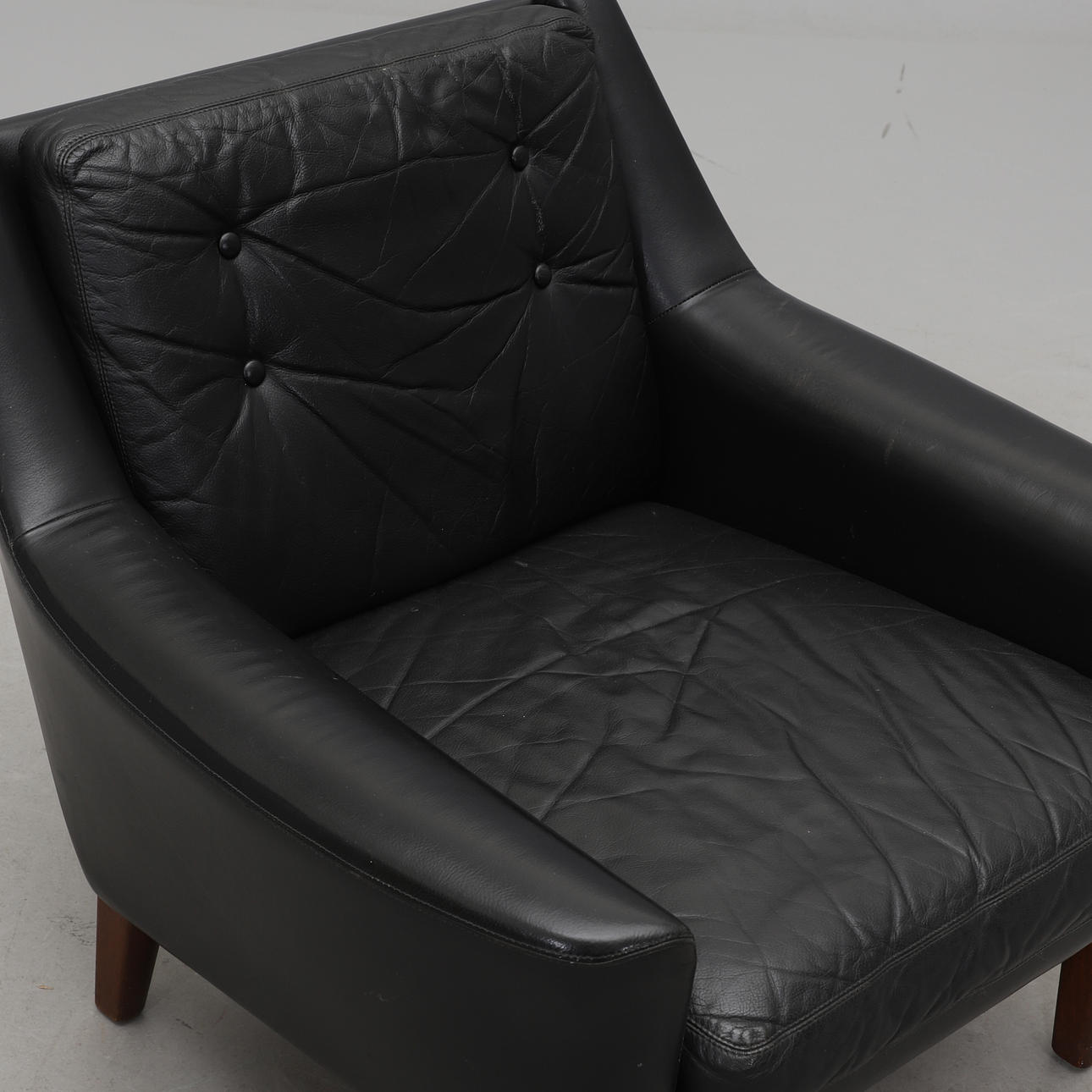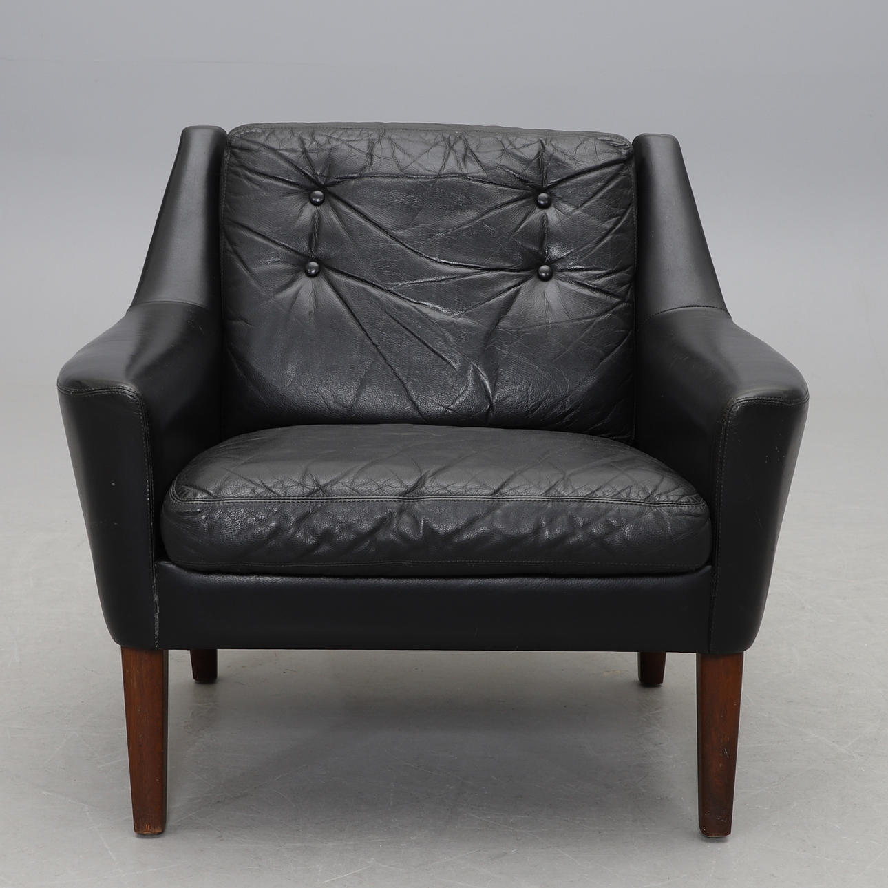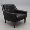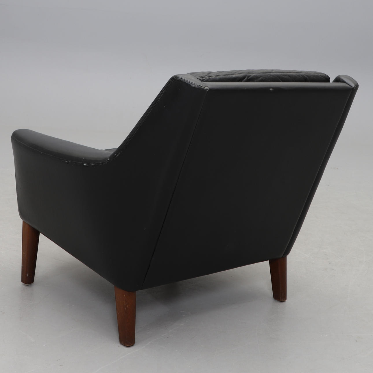 Stoppad, med lösa stoppade dynor i rygg och sits. Klädd i svart läder. Bredd 79, djup 79, höjd 71 cm.
