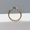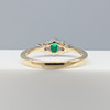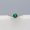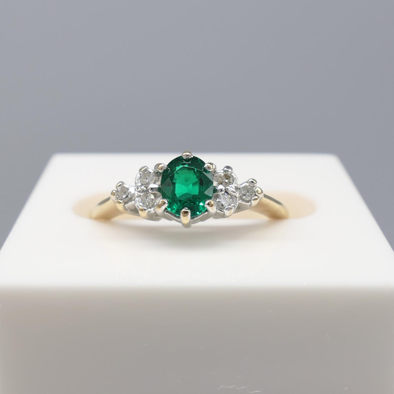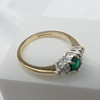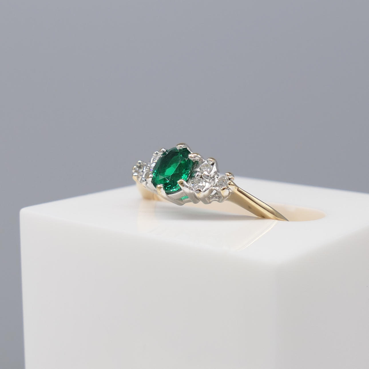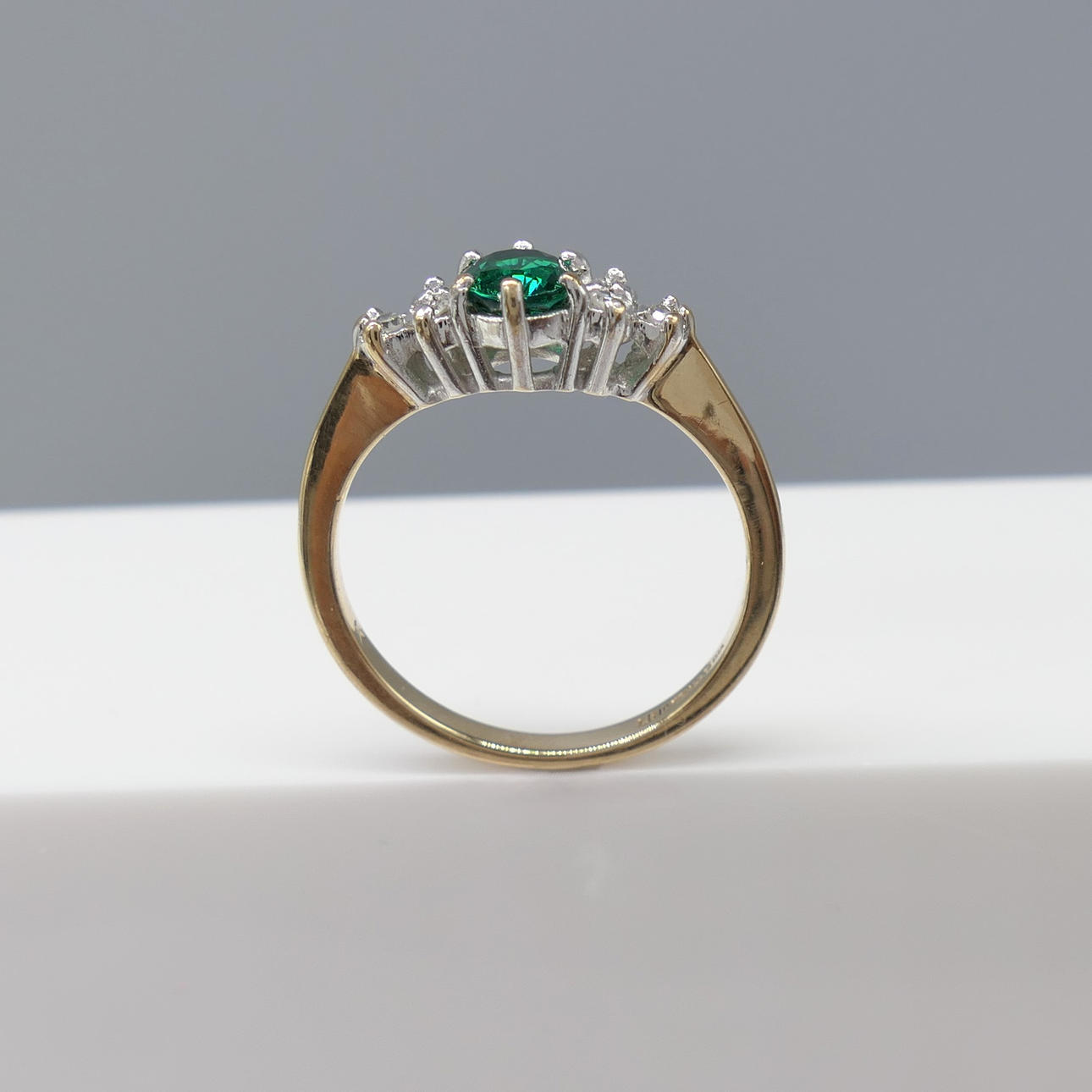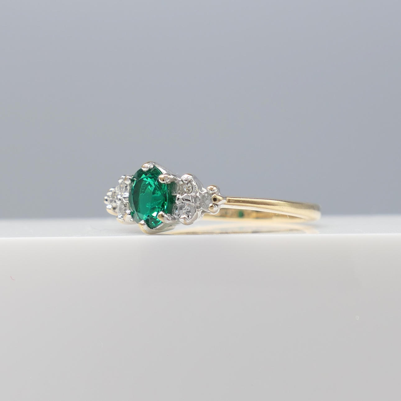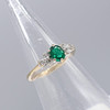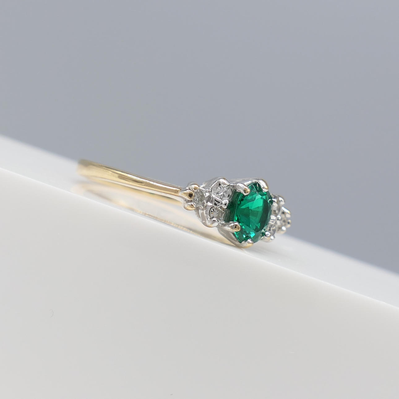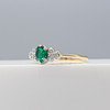 En klänningsring i vitt och gult guld med en skapad smaragd och två naturliga diamanter, i en liten ringstorlek.