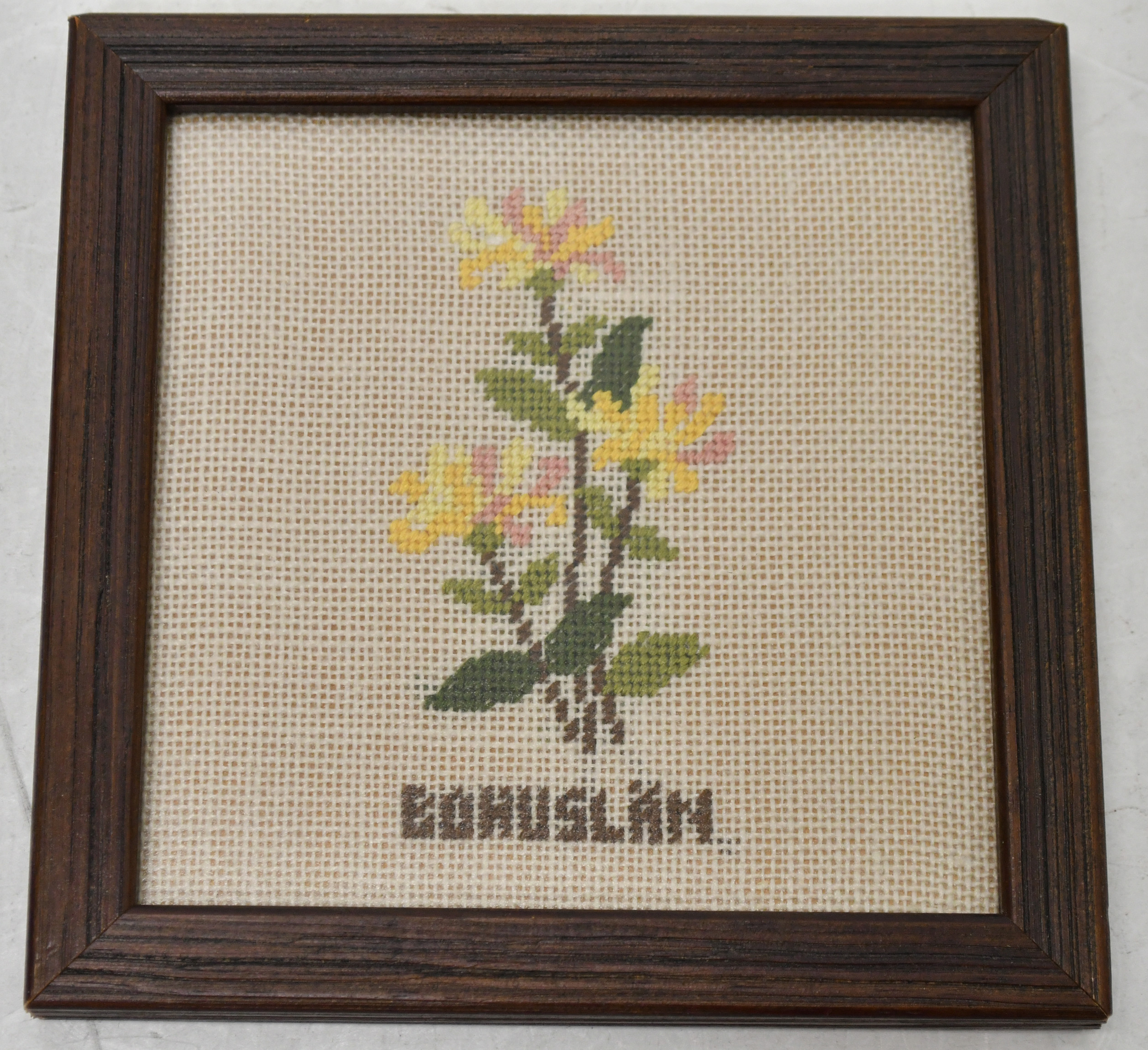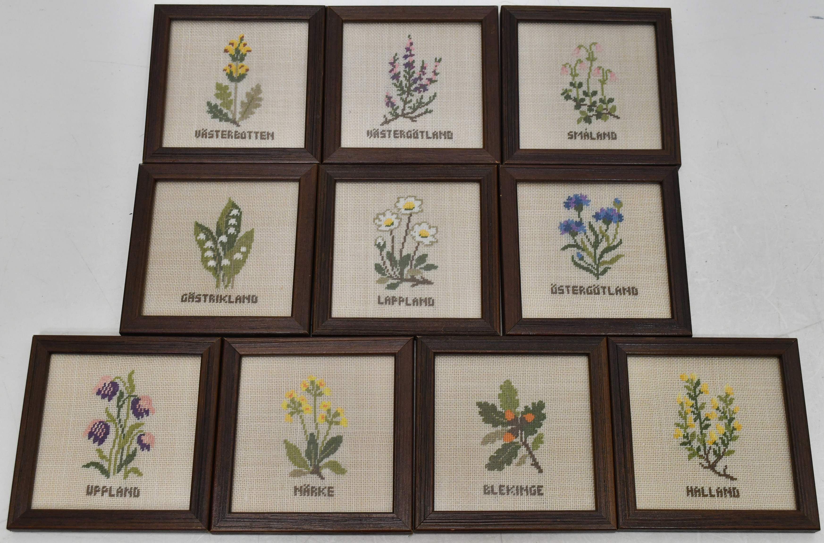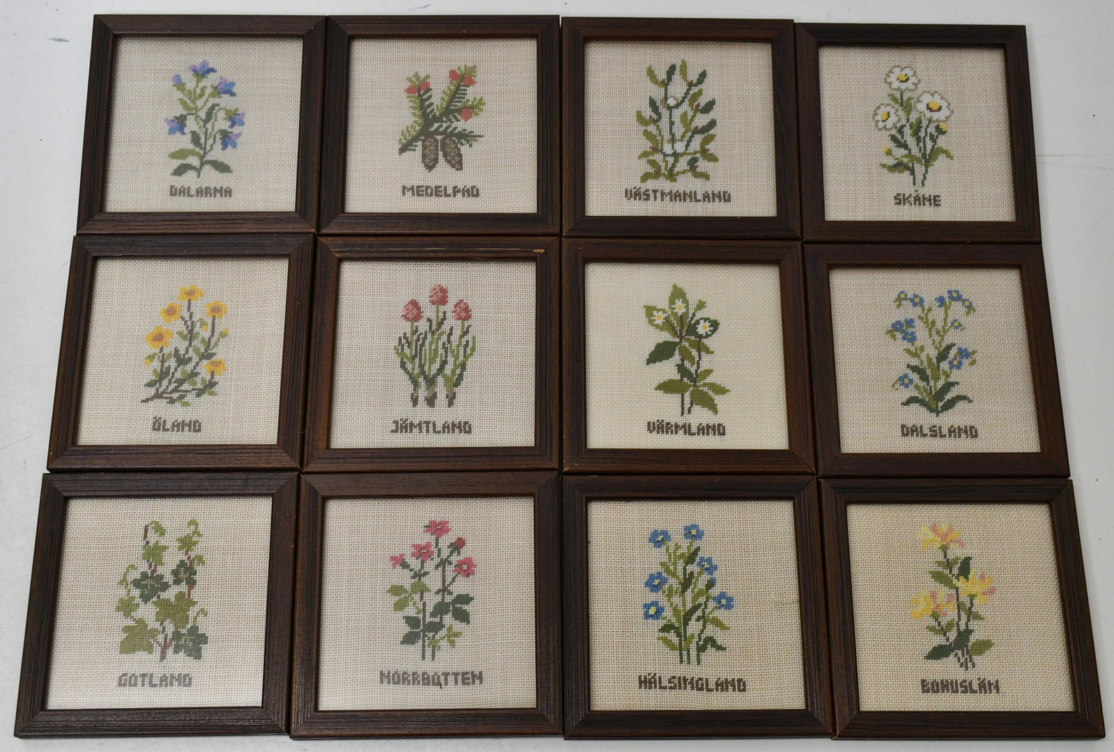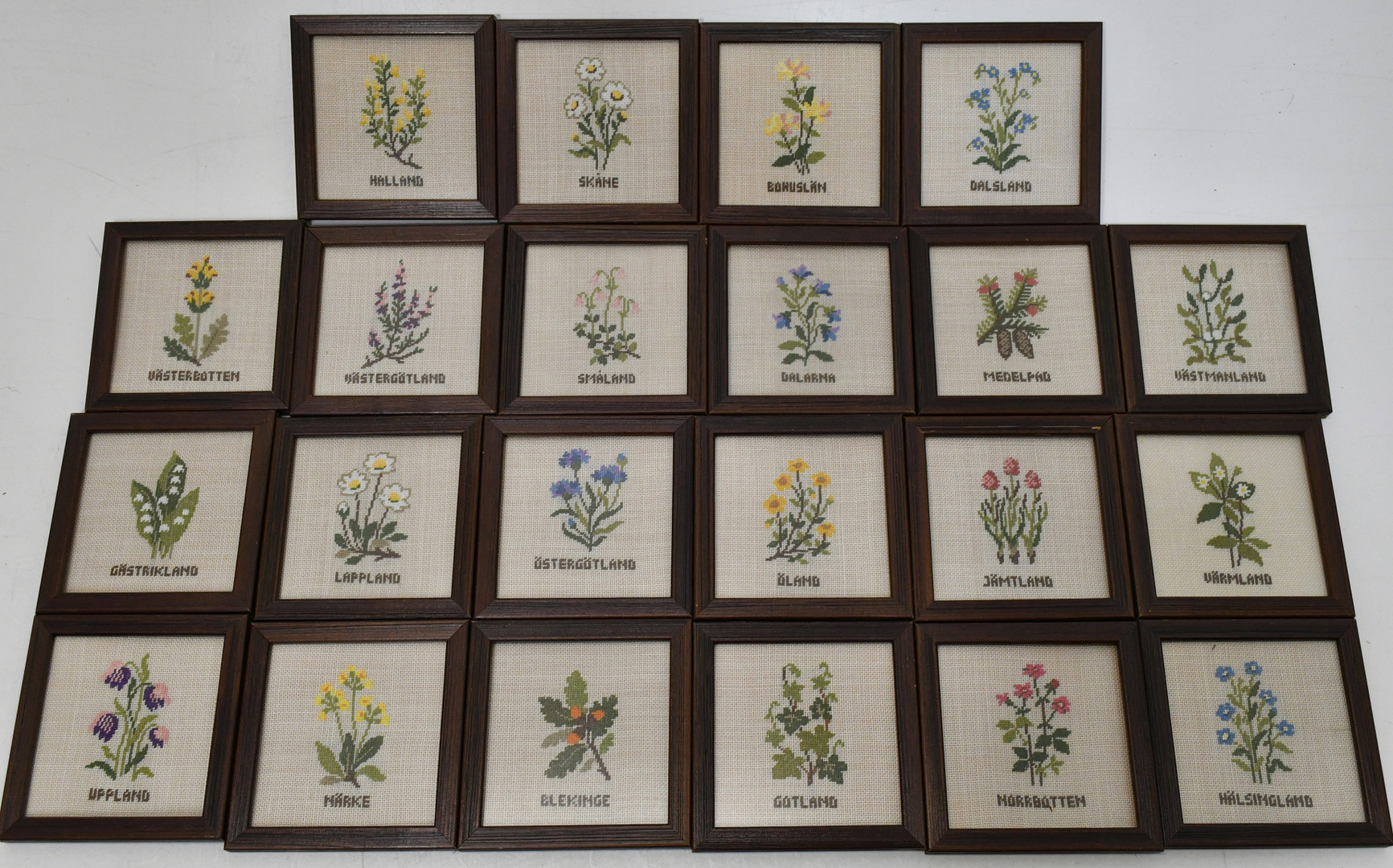 3851622. OIDENTIFIERAD KONSTNÄR. Landskapsblommor 22 st. Broderi.