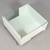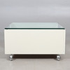 På hjul. Vitlackerad med med bordsskiva av klarglas.