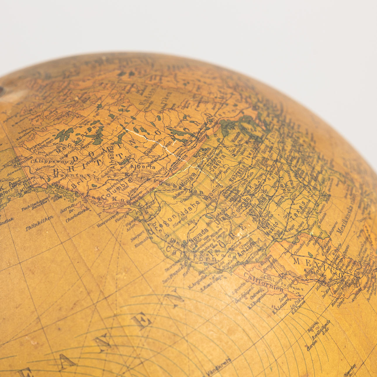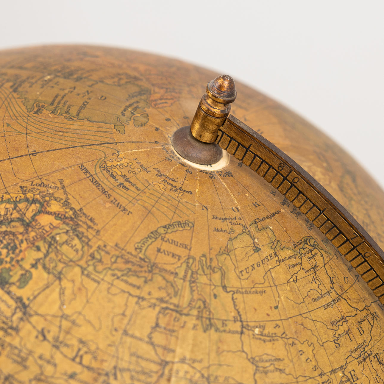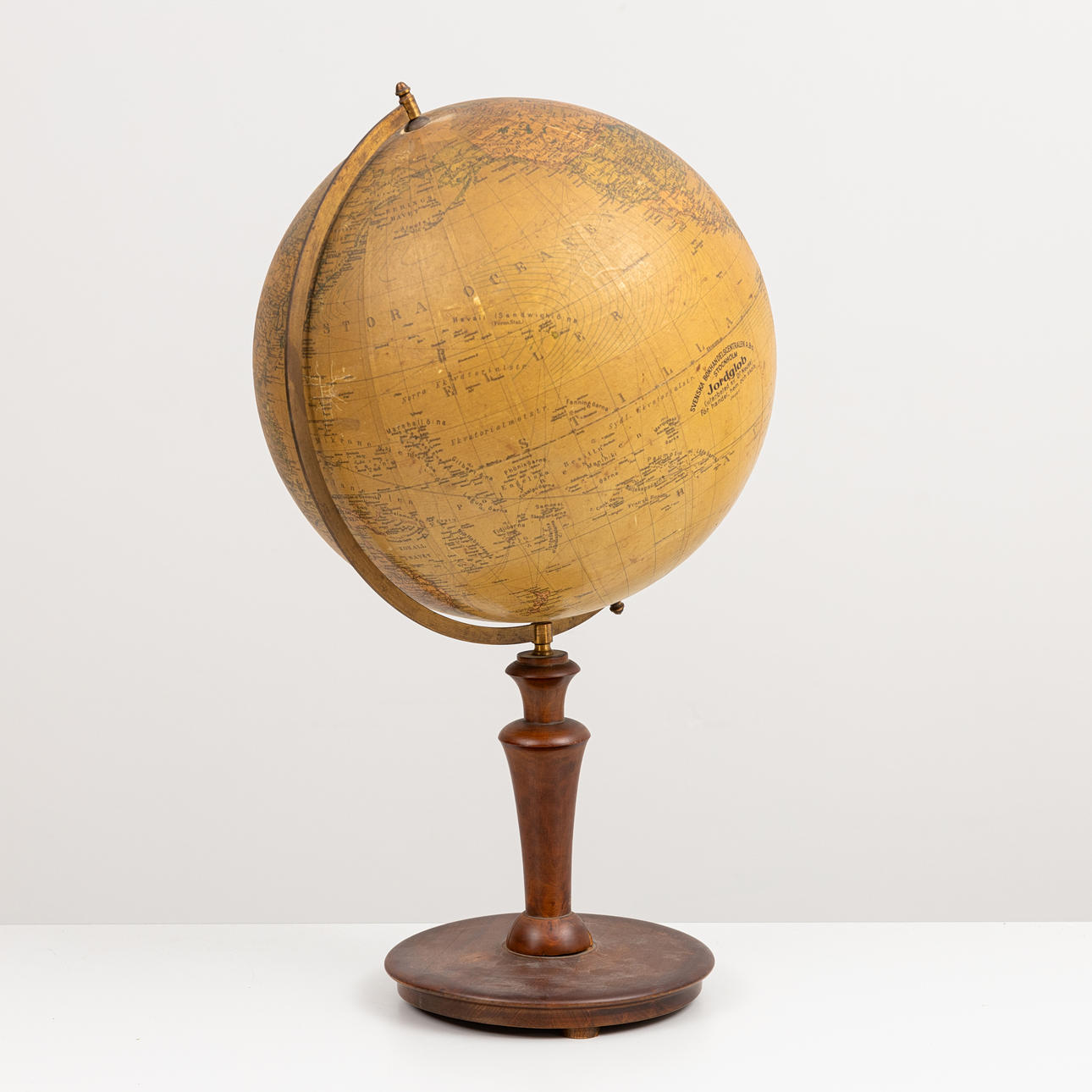 Klot på bonad träfot, "Svenska bokhandelscentralen AB:s Jordglob (Utarbetad av D:r Neuse) för handel, hem och skola.