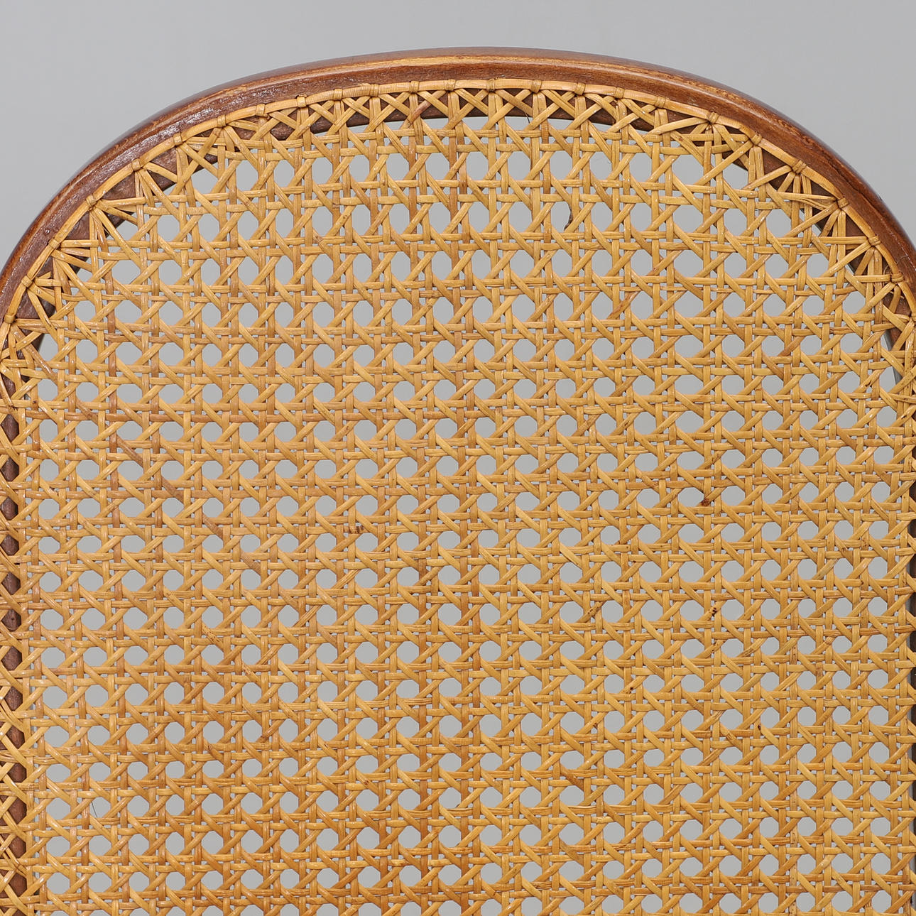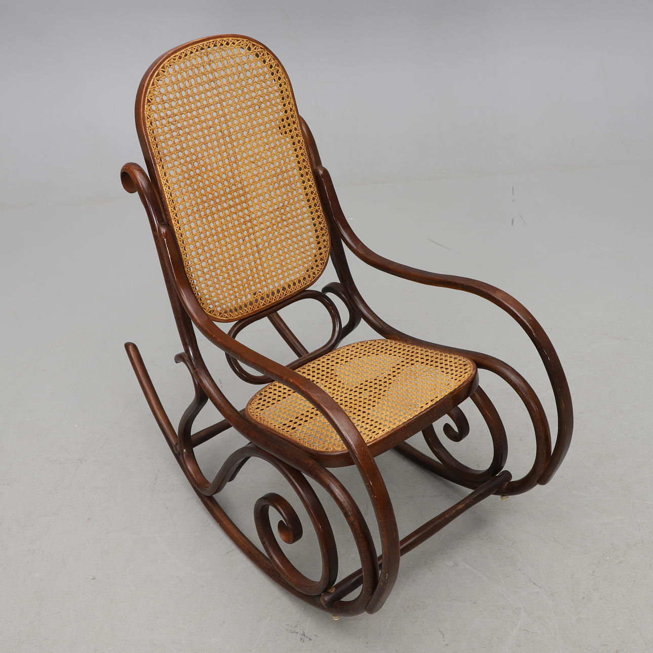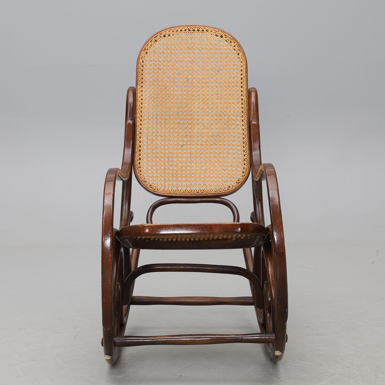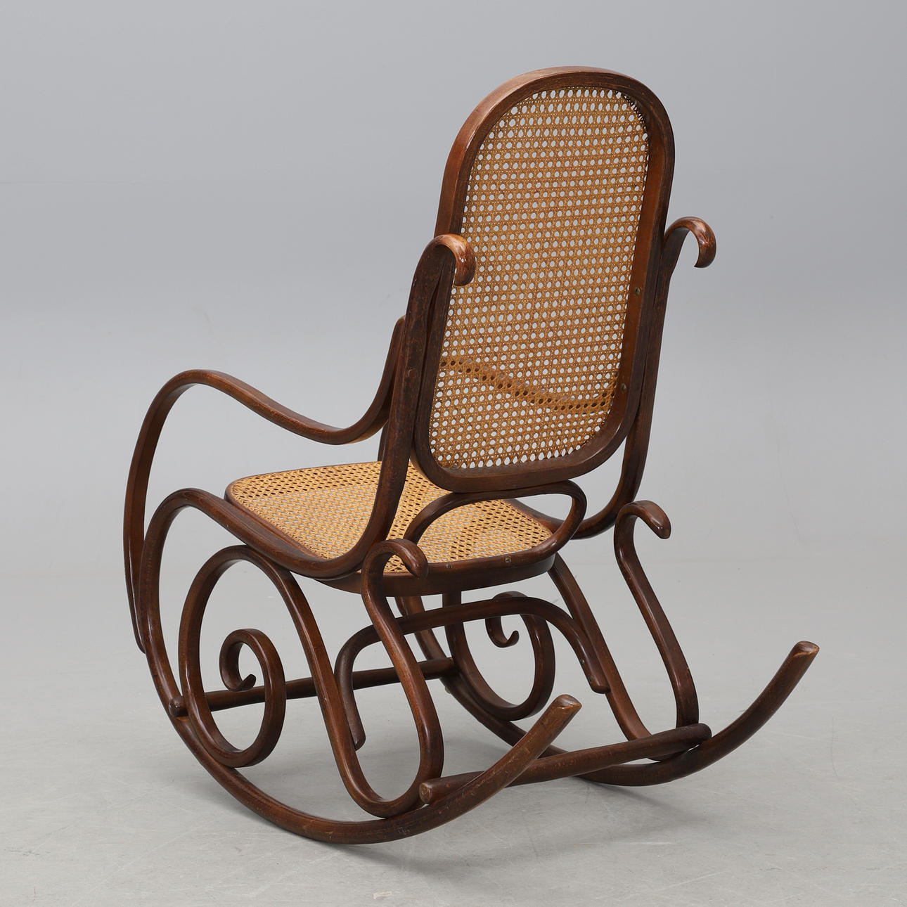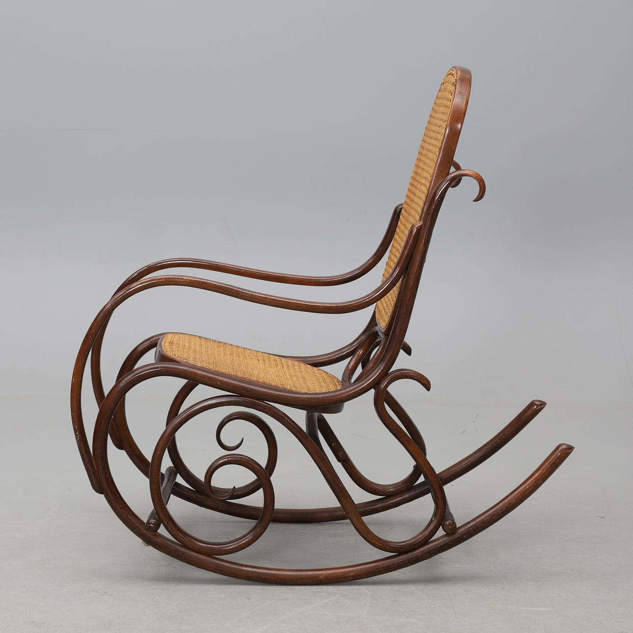 Stomme i böjträ. Rygg och sits i rotting. Sitthöjd 40 cm. Rygghöjd 105 cm.