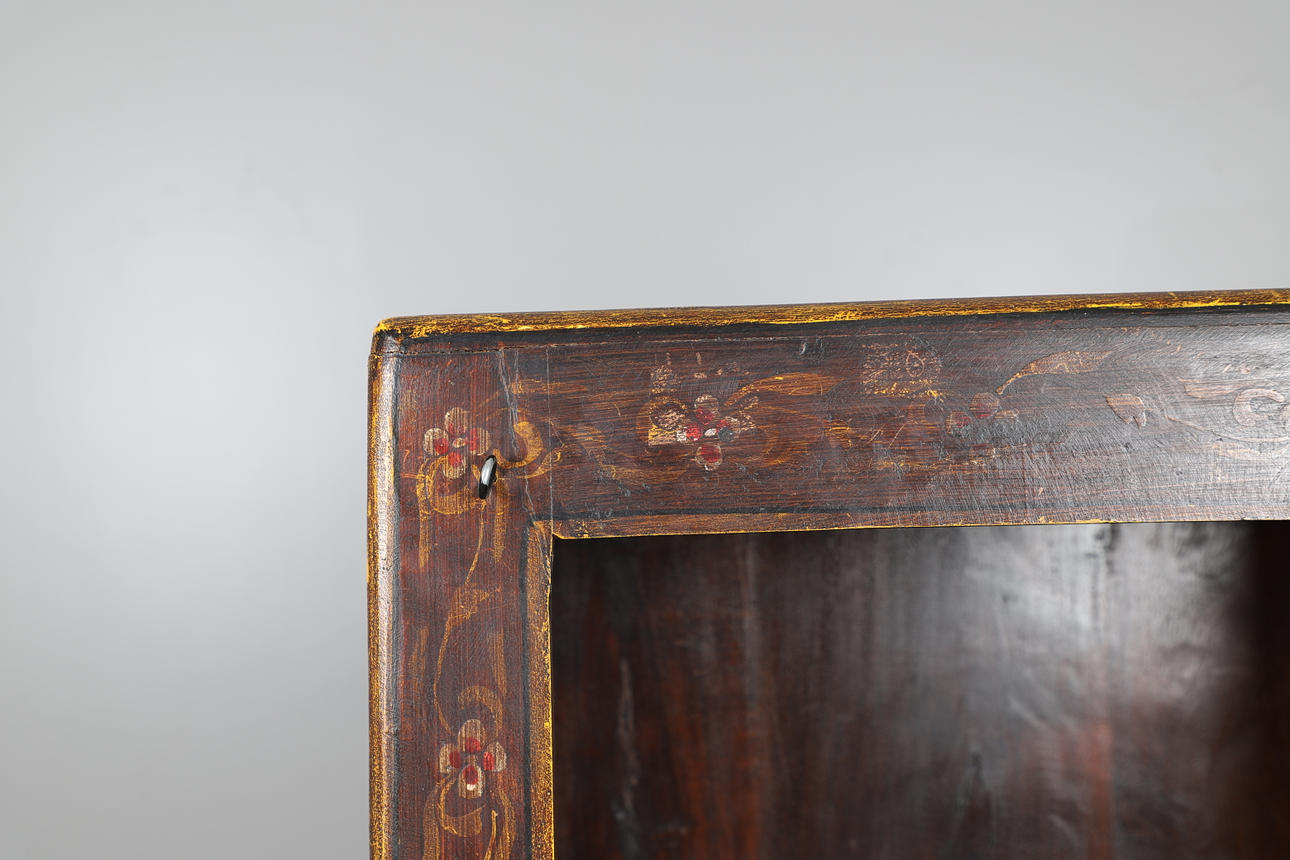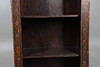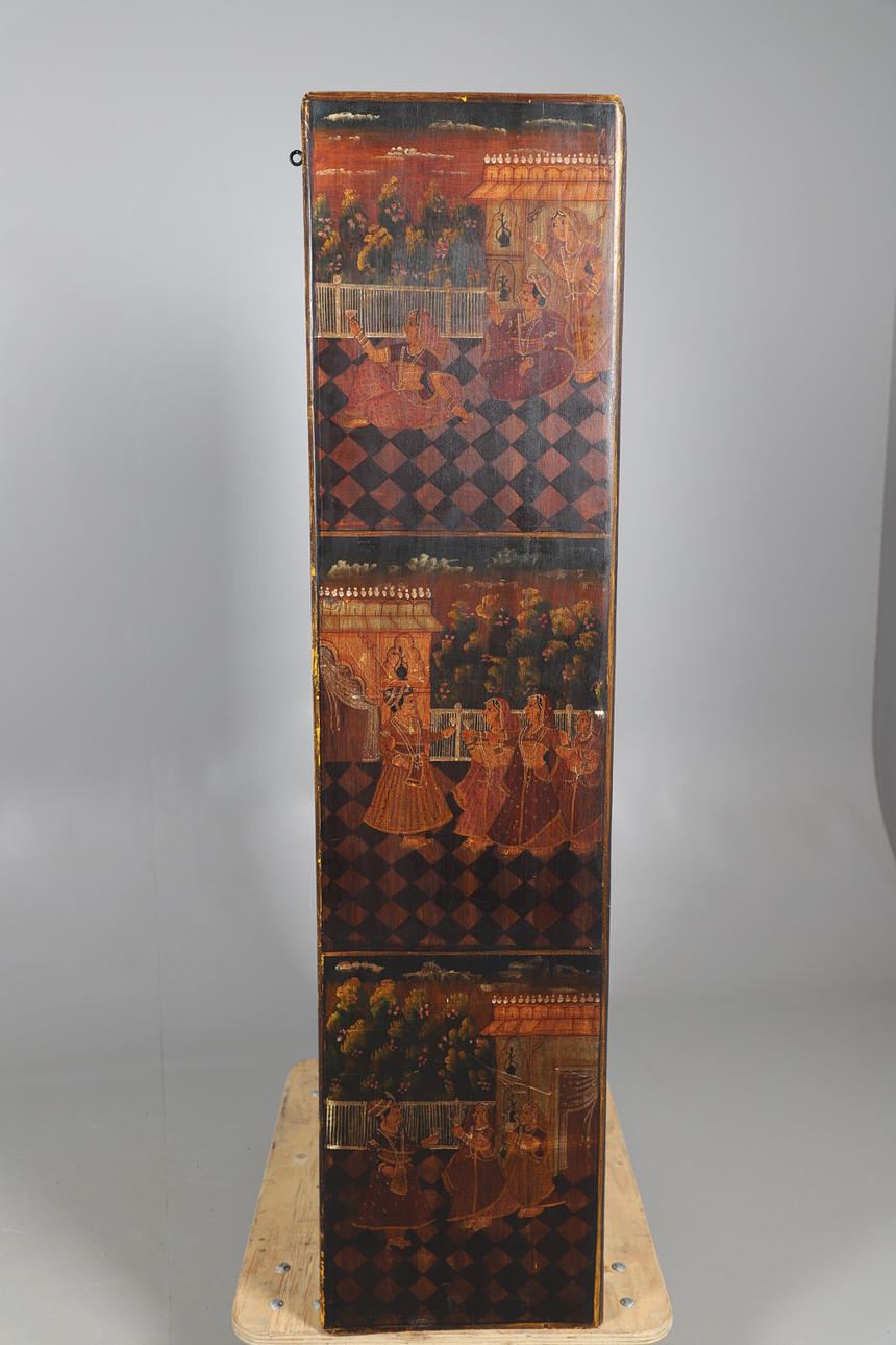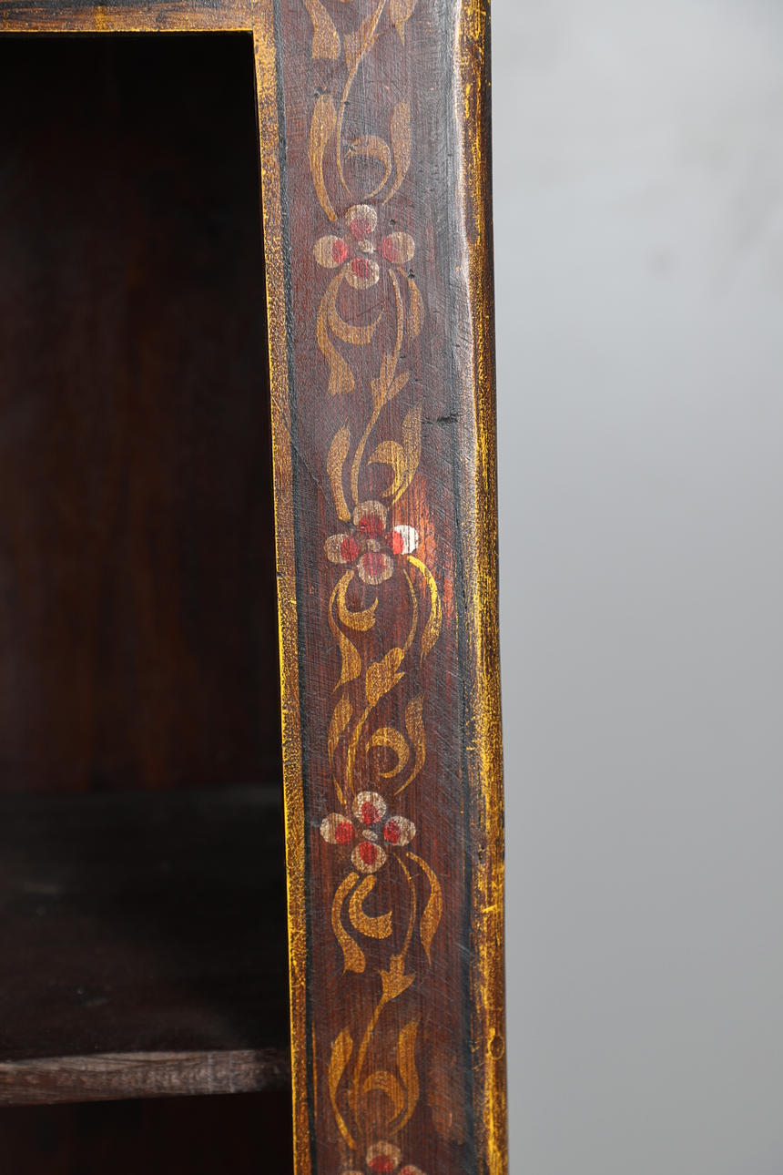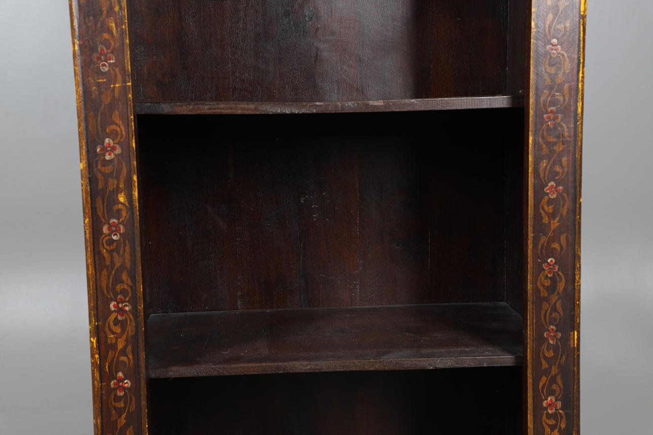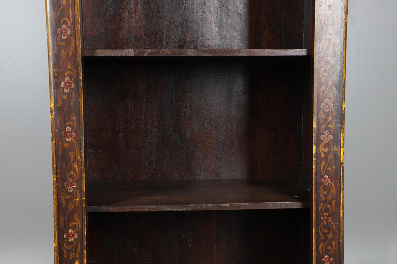 En bokhylla i ek, med framsidan dekorerad med blommotiv, sidorna målade med indiska sociala scener. Med tre justerbara hyllor. Höjd 156cm x längd 65cm x djup 38cm.