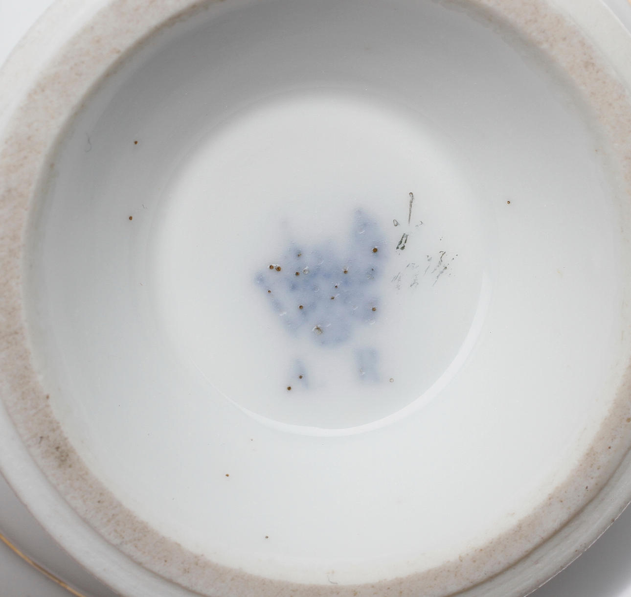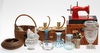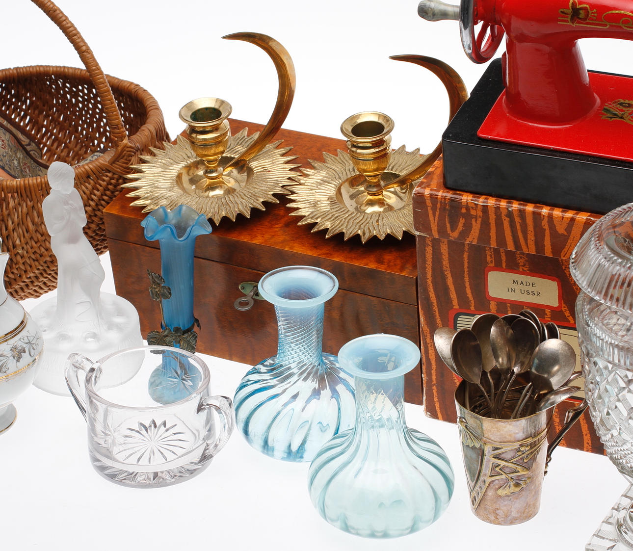 Allmogeskål, glasföremål. Barnsymaskin, Ryssland. Kanna, omkring 1900, mm.