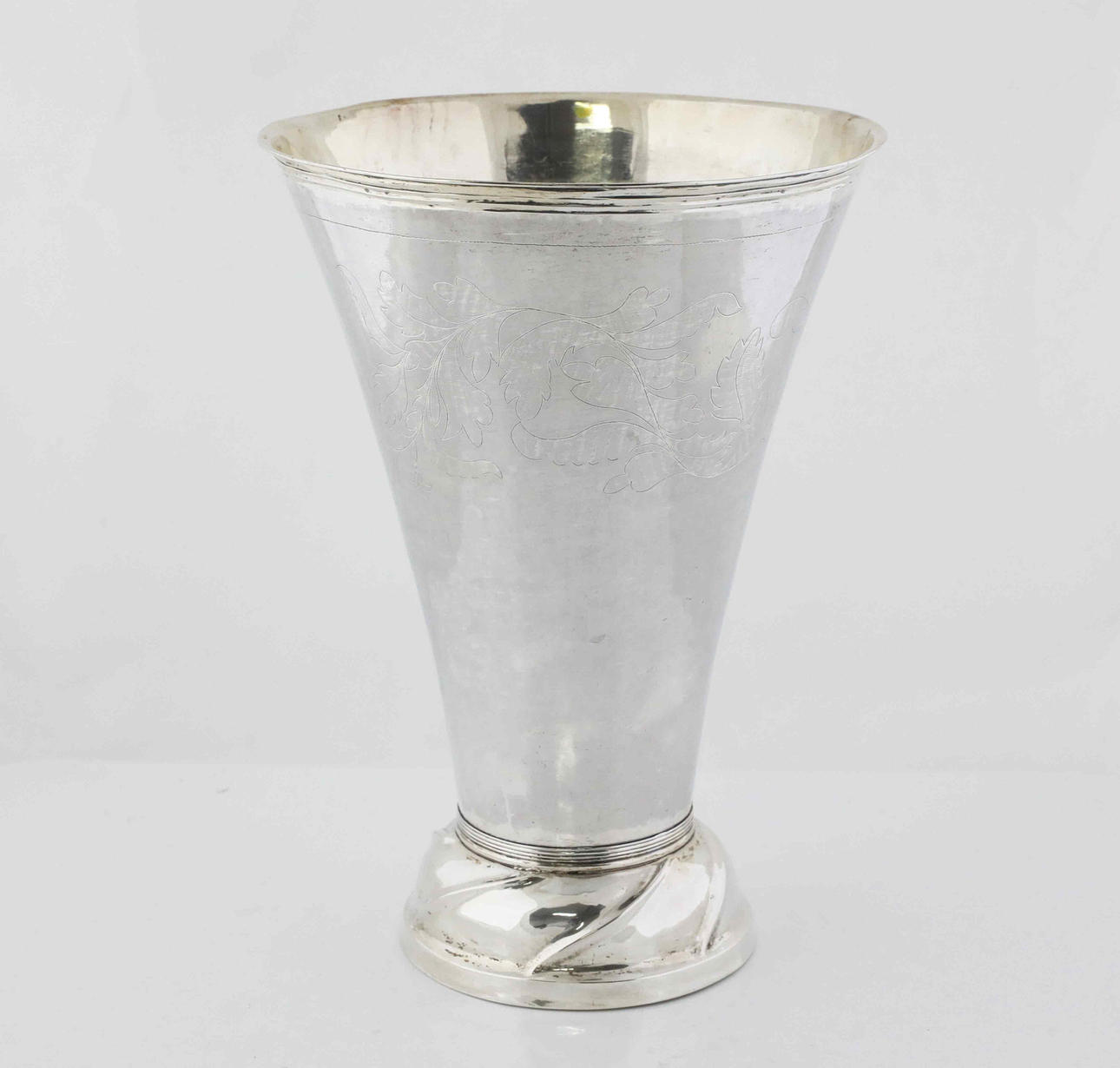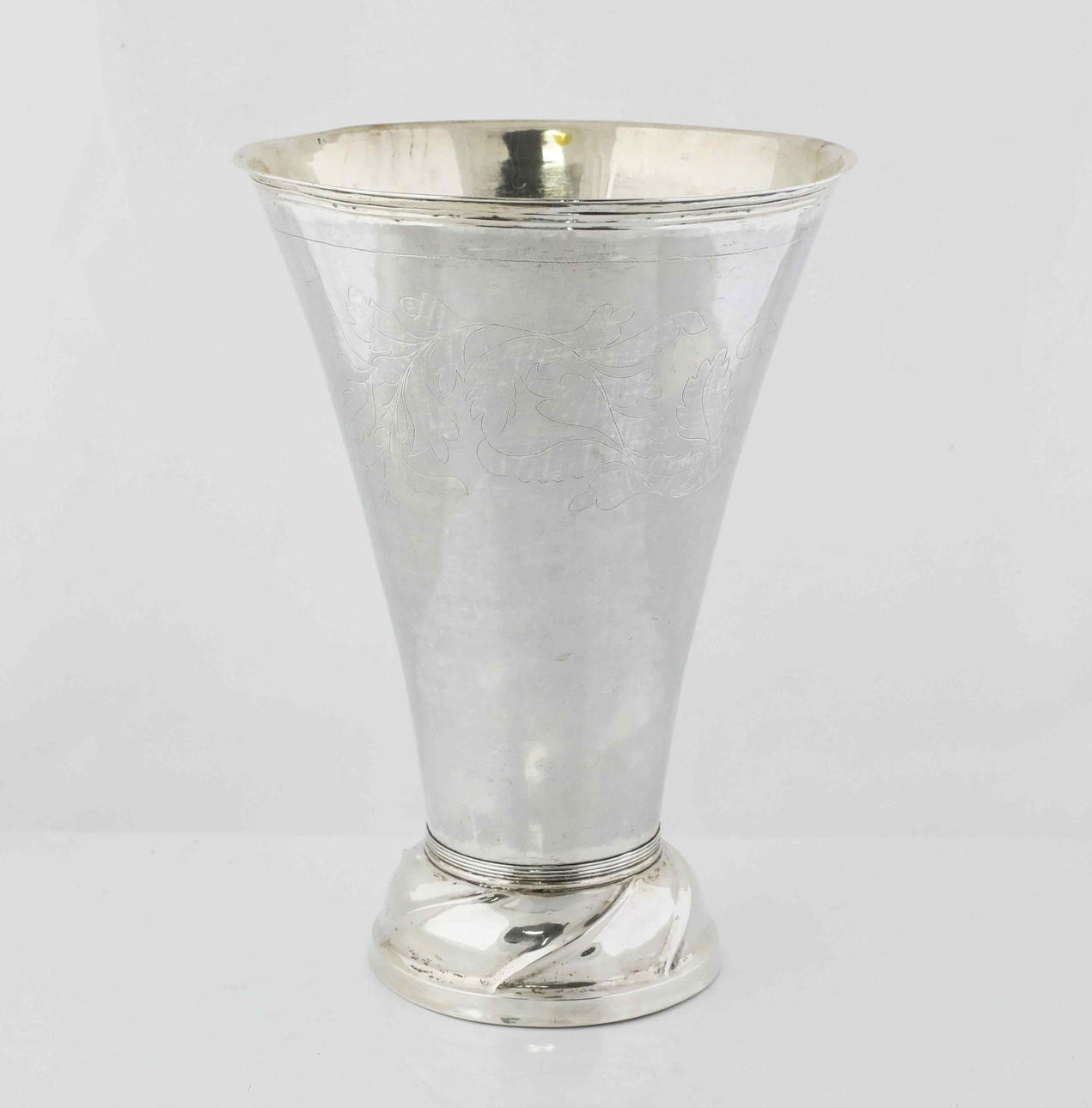 Konformad på hög fot med svängda veck, graverad dekor i form av blad, samt tidigare ägarinitialer.