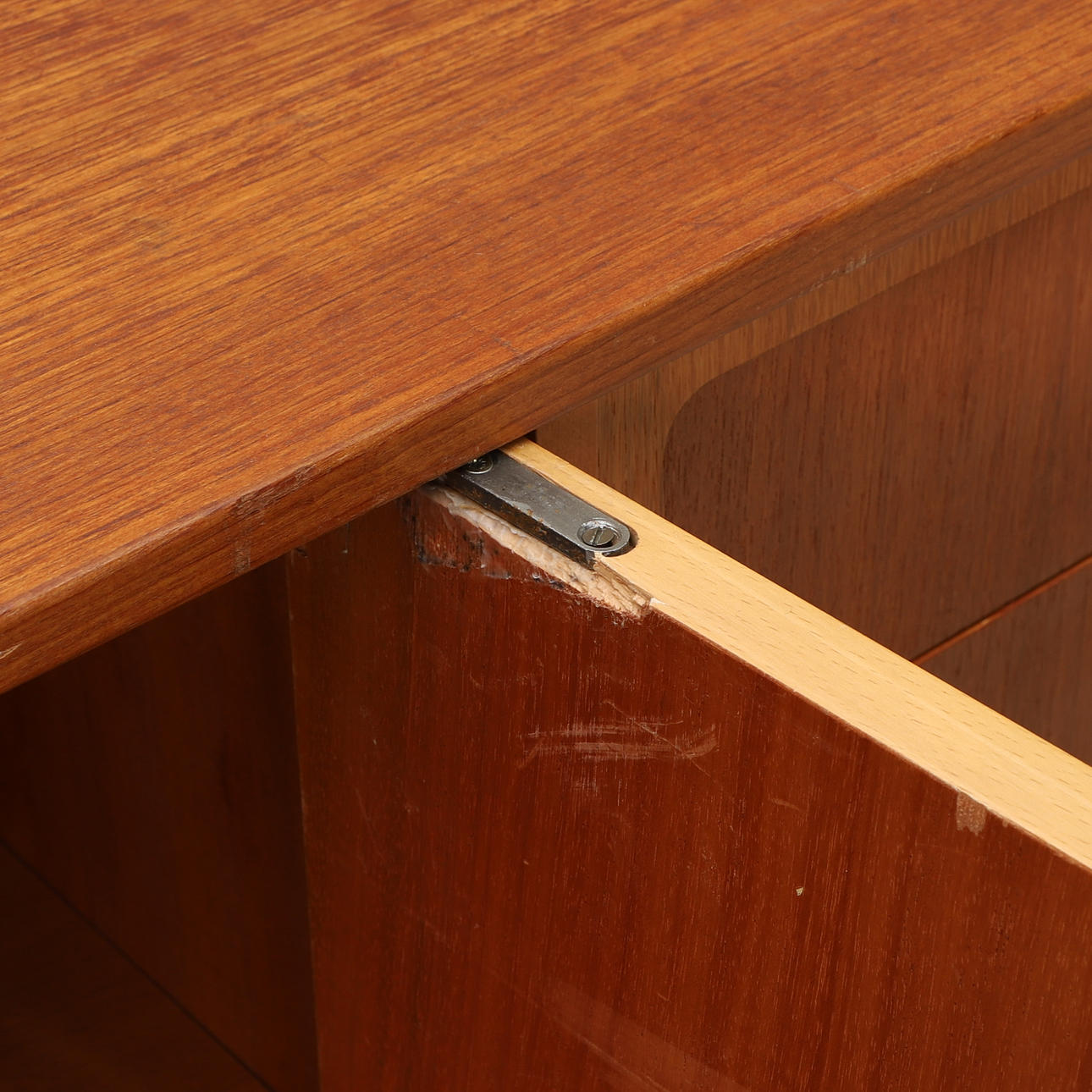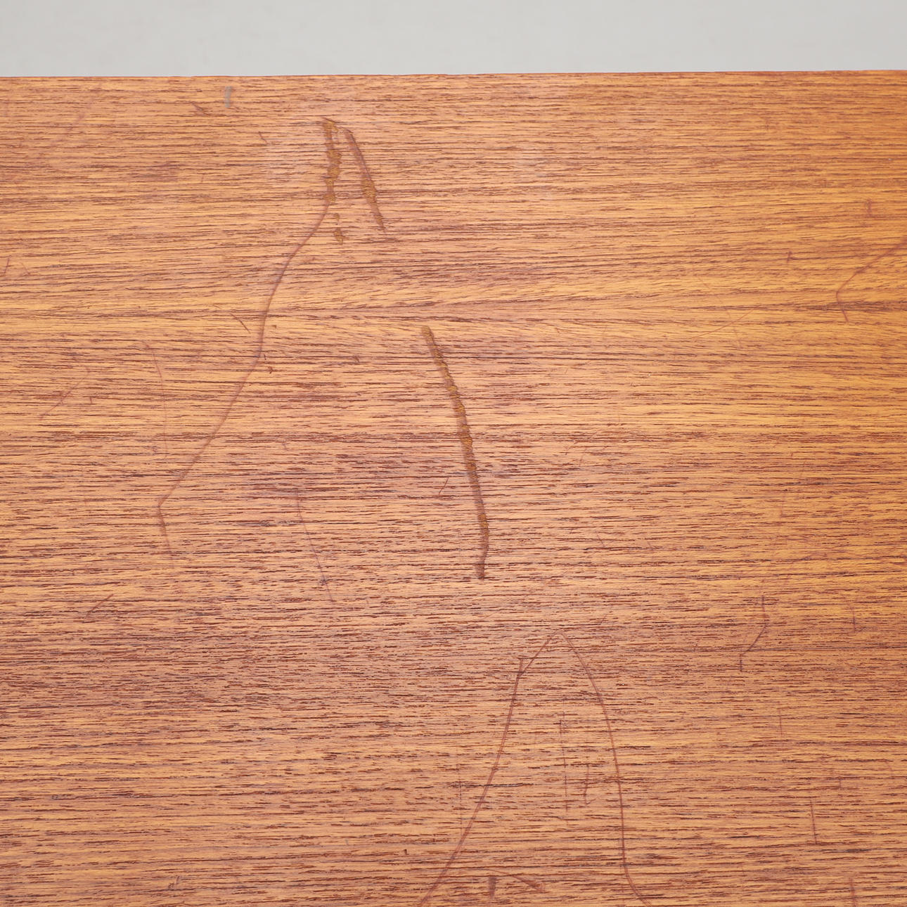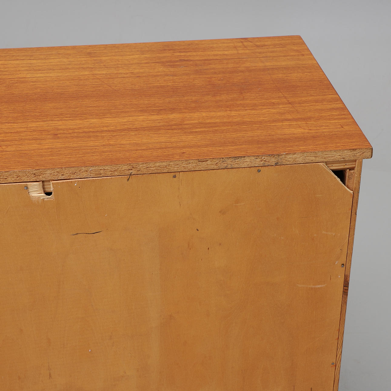 Bruksslitage, fläckar, fanérskador med bitar som saknas.