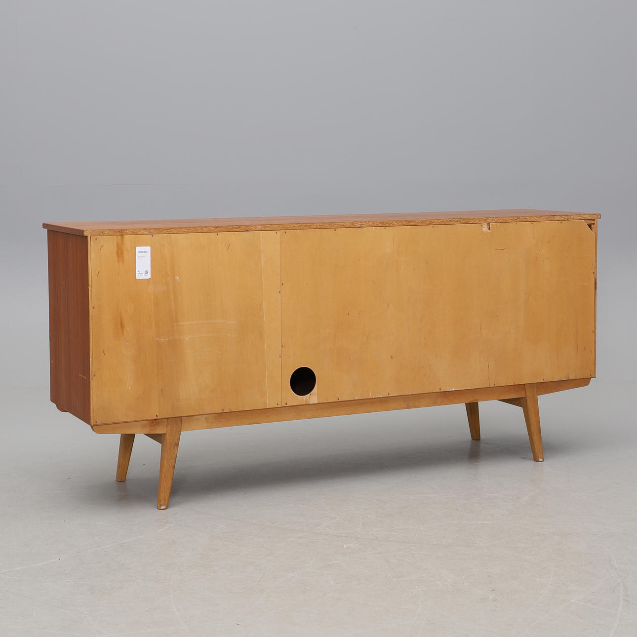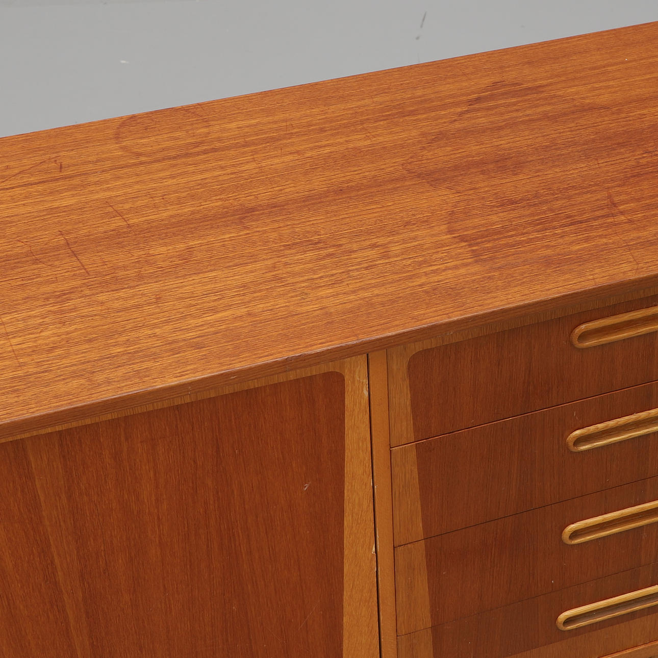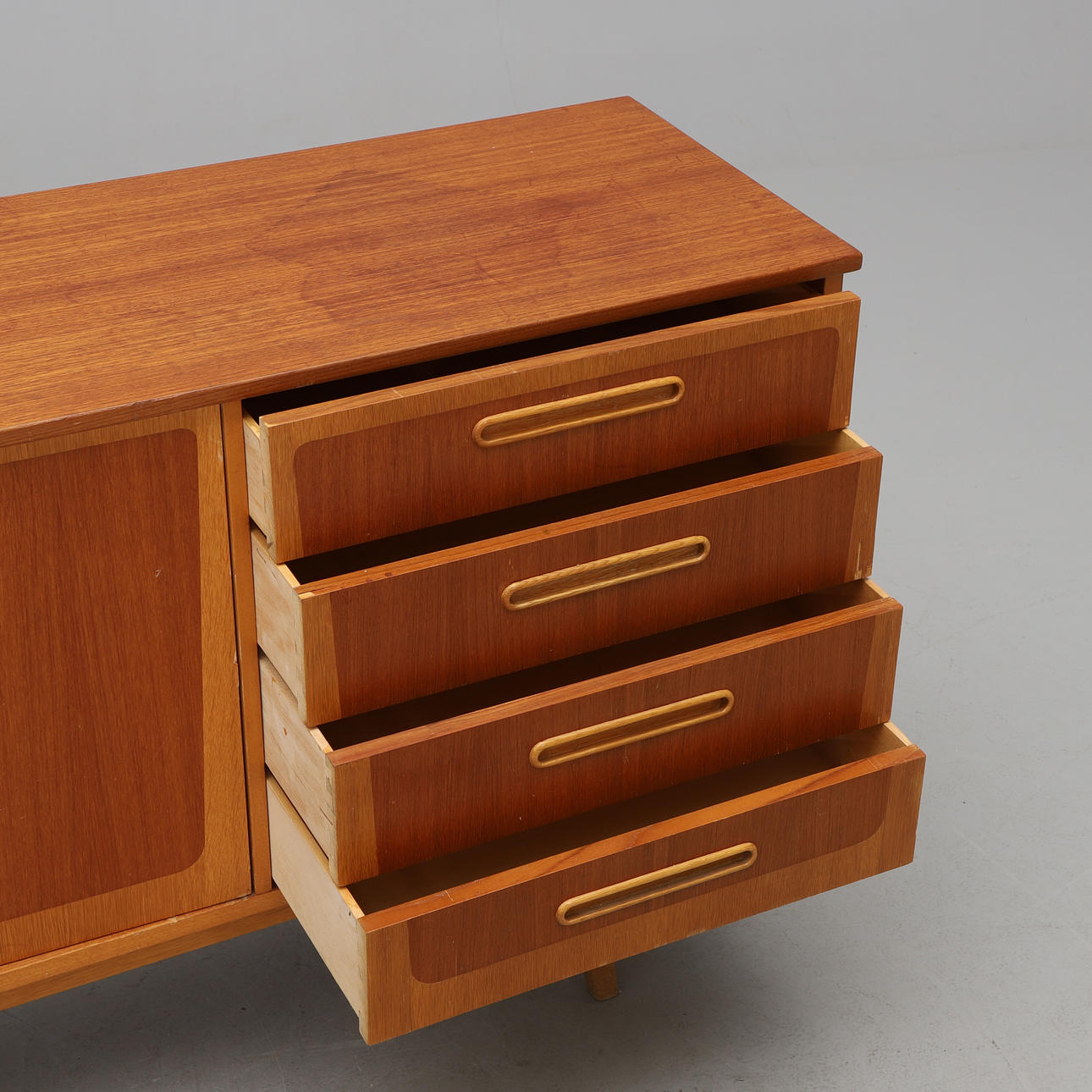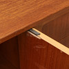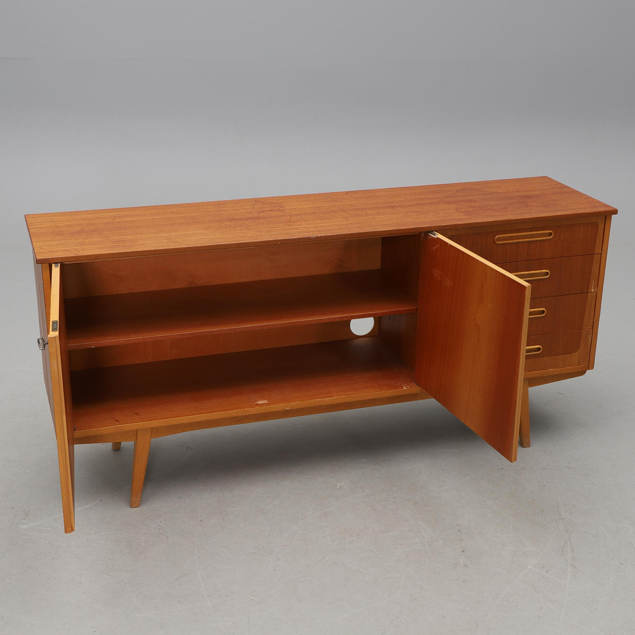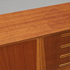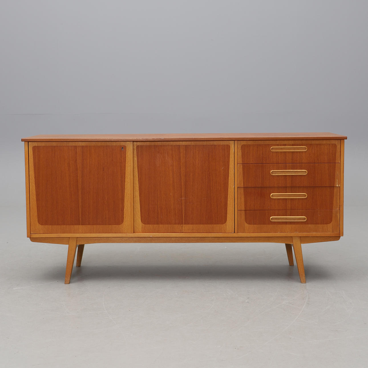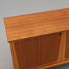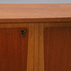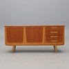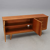 Teak och ek. Två dörrar och fyra lådor. Längd 173, djup 43, höjd 80 cm.