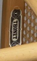 Böjd bok med sits i flätad rotting, etikettmärkta.