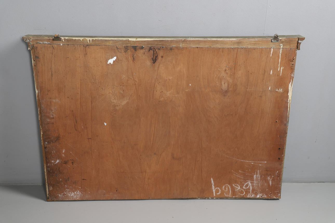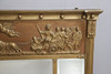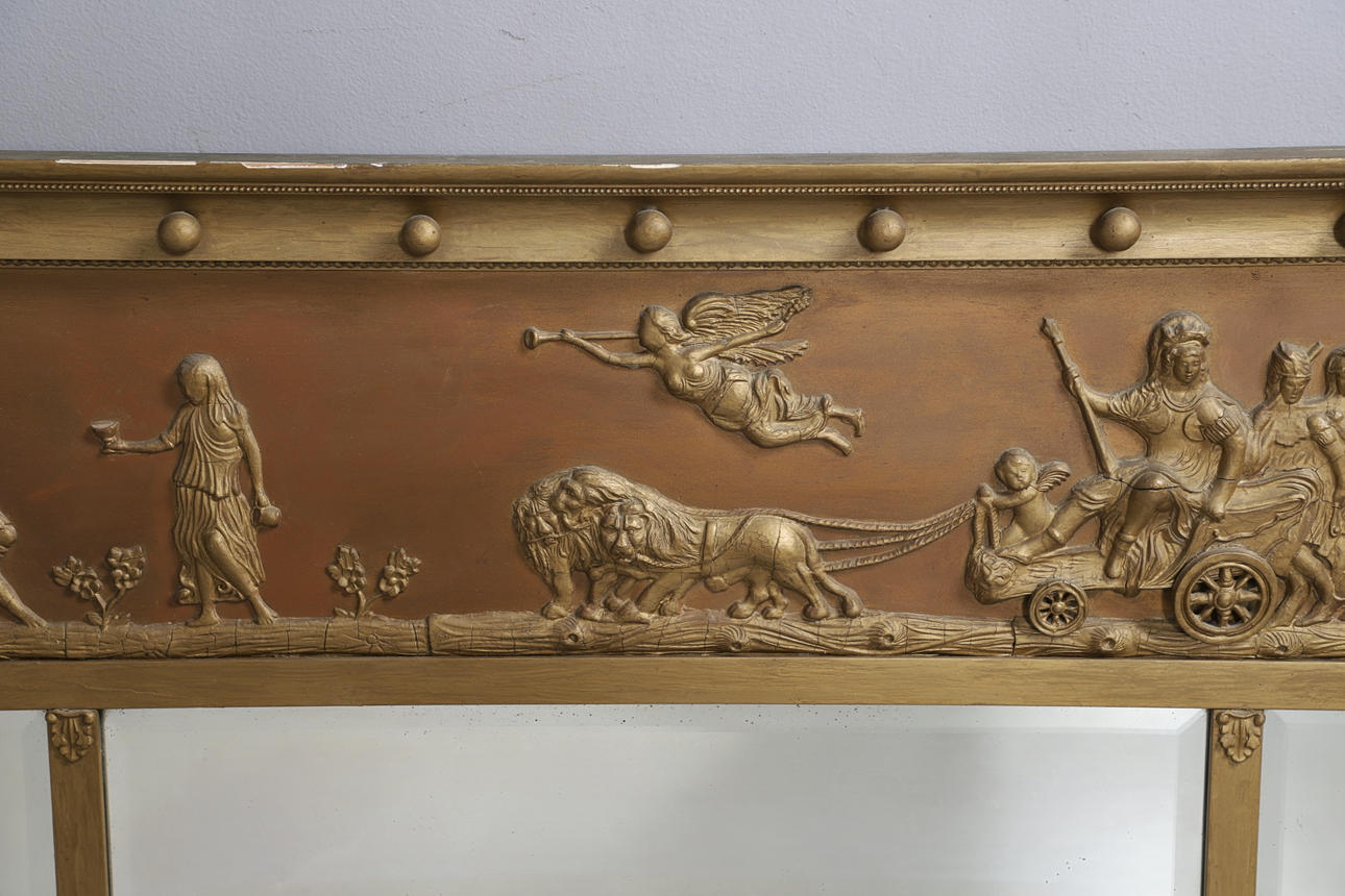 Med kuldubbad ram ovanför en gjuten fris som föreställer antika mytologiska scener, de tre fasade plattorna flankerade av palmettkappade pelare, höjd 73 cm, bredd 110 cm.