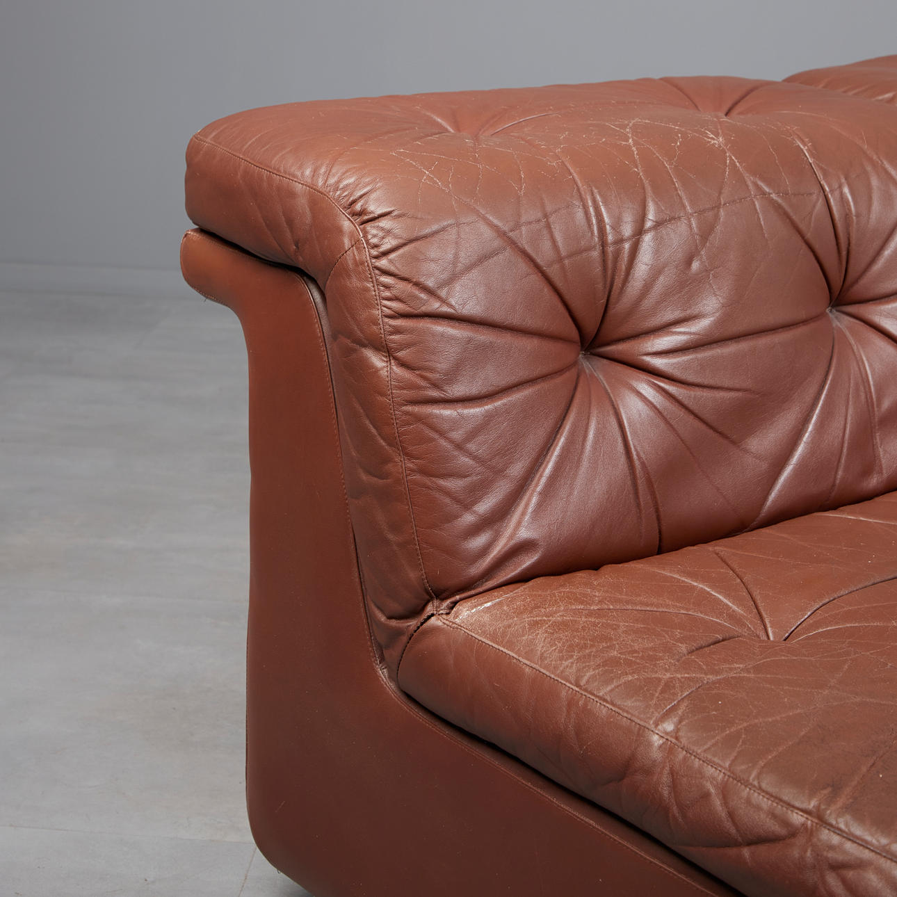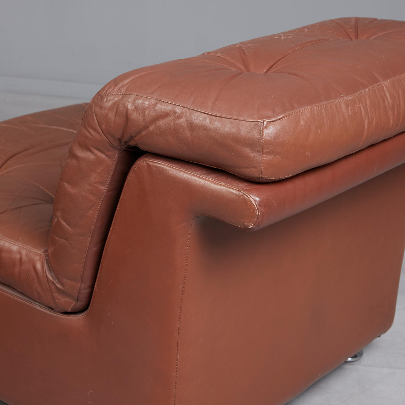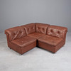Åtta delar modulär soffa bestående av sex enskilda element, en hörnmodul och en fotpall, var och en stoppade bruna konstläderstrukturer med aluminiumfötter, individuella moduler: H.68cm, sitshöjd: 34cm, L.93cm, W.69cm, hörnmodul: H.68cm, sitshöjd: 34cm, L.93cm, W.91cm, fotpall: H.38cm, L.70cm, W.70cm. (8).