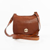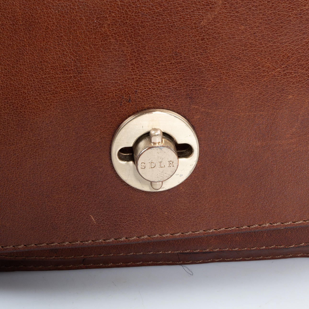 Messengerväska med justerbar axelrem. Lock med vridlås i mässningspläterad metall. Inredning med svart fodertyf, ett huvudfack med ett blixtlåsförsett myntfack samt ett utanpåliggande fack under lock. Märkt SDLR samt etikettmärkt 11192 18972. Ca 24 x 24 x 7 cm. Axelrem max längd ca 72 cm.