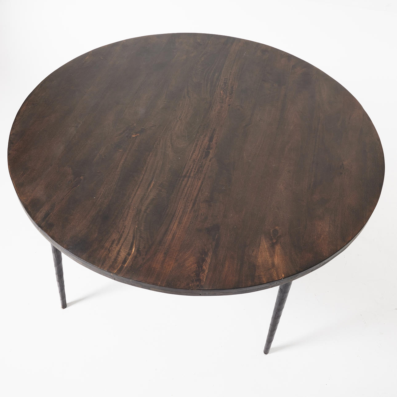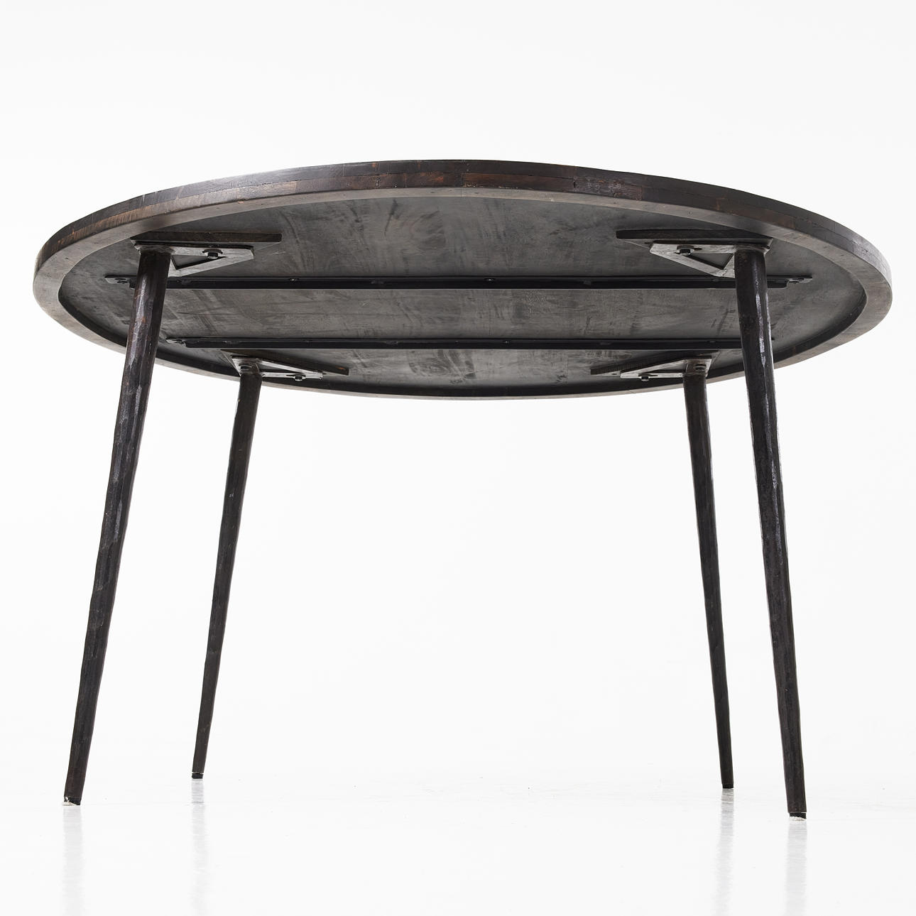 Ben av järn, mörkbetsad träskiva, höjd ca 75, diameter ca 130 cm.