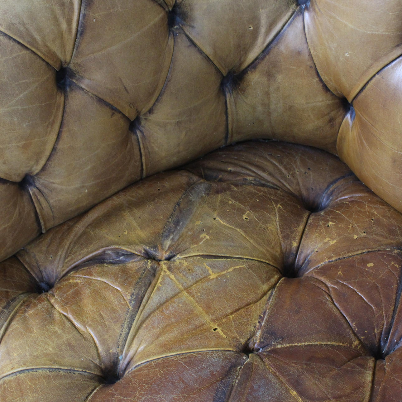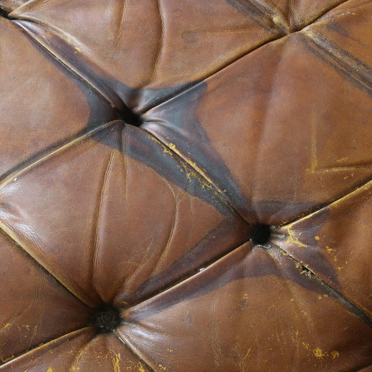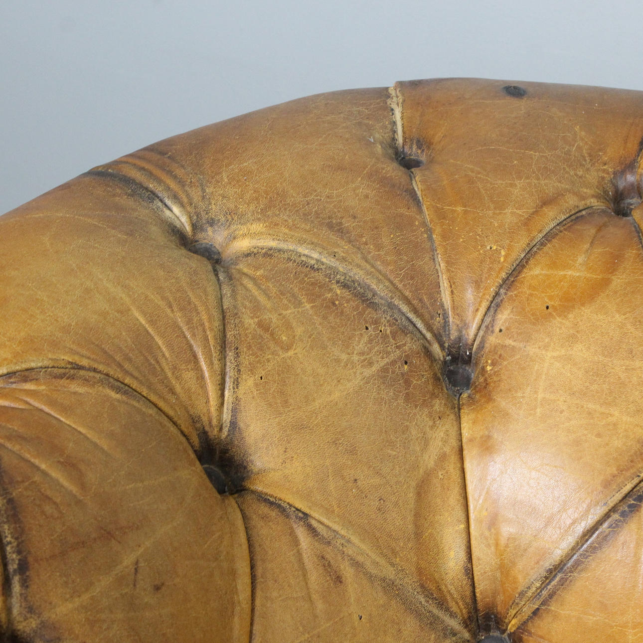 tecken på användning och gnidning, en del av lädret är kraftigt gnuggad, fläckad, missfärgad/bleknad och repad, öppna sömmar och hål på platser, saknade knappar, patina.