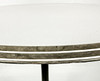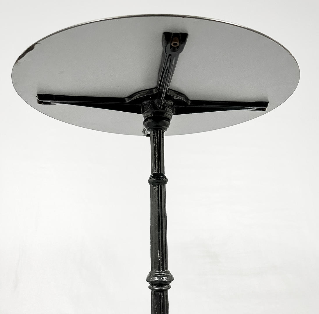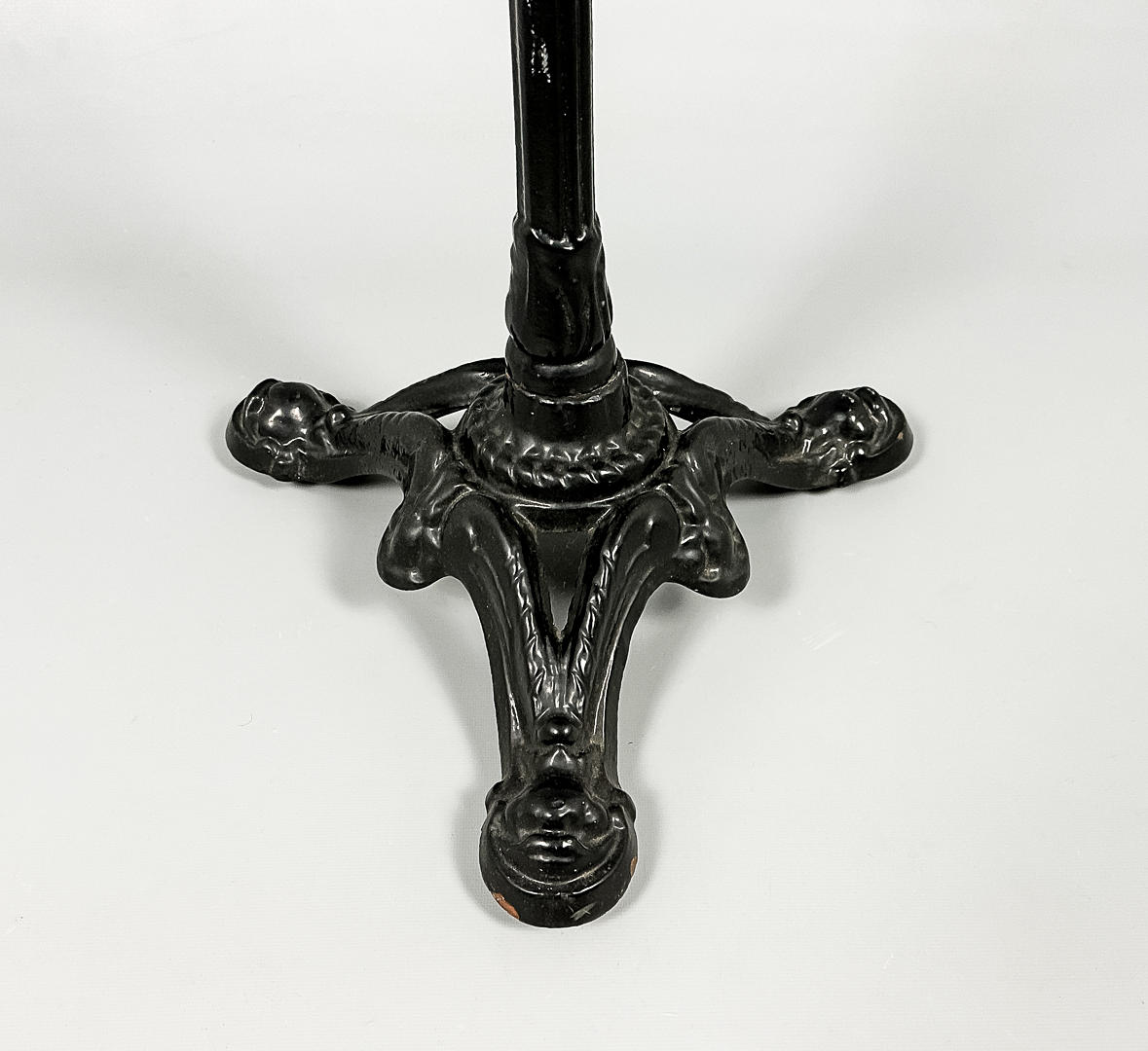 Stomme i svartmålad gjutjärn, bordsskiva i plåt.