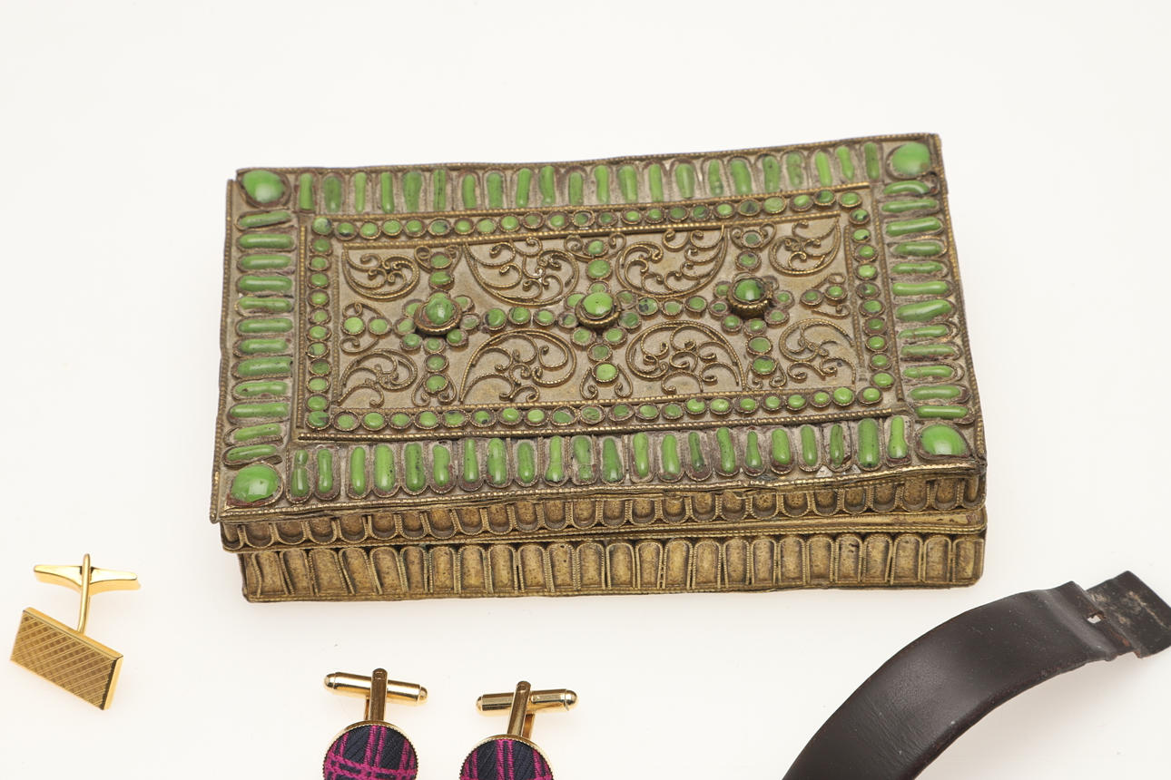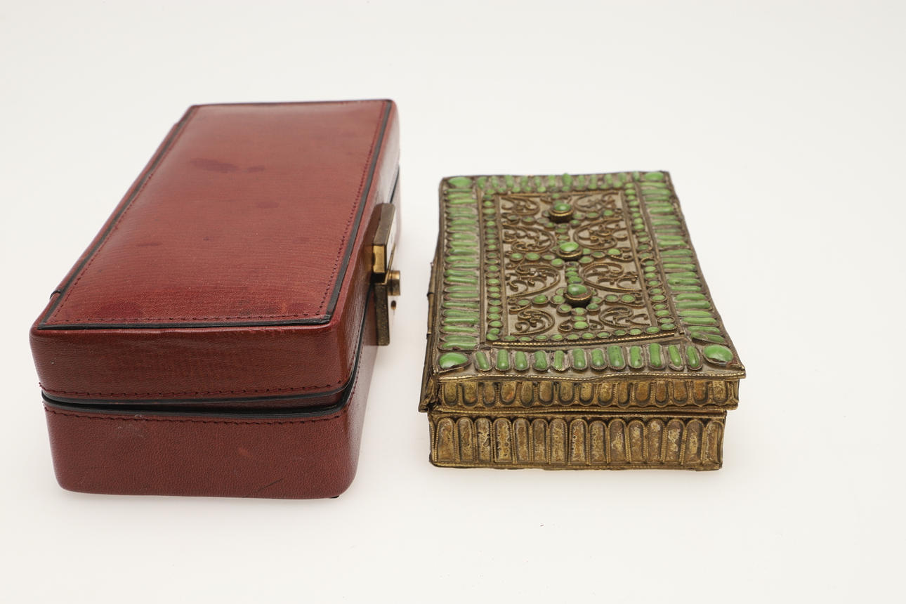 en liten trådarbete och glasemaljerad låda med lock,