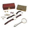 en skinndocka, förstoringsglas, papperskniv, en toalettbordslåda i trä,