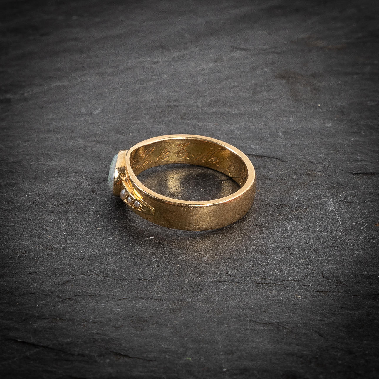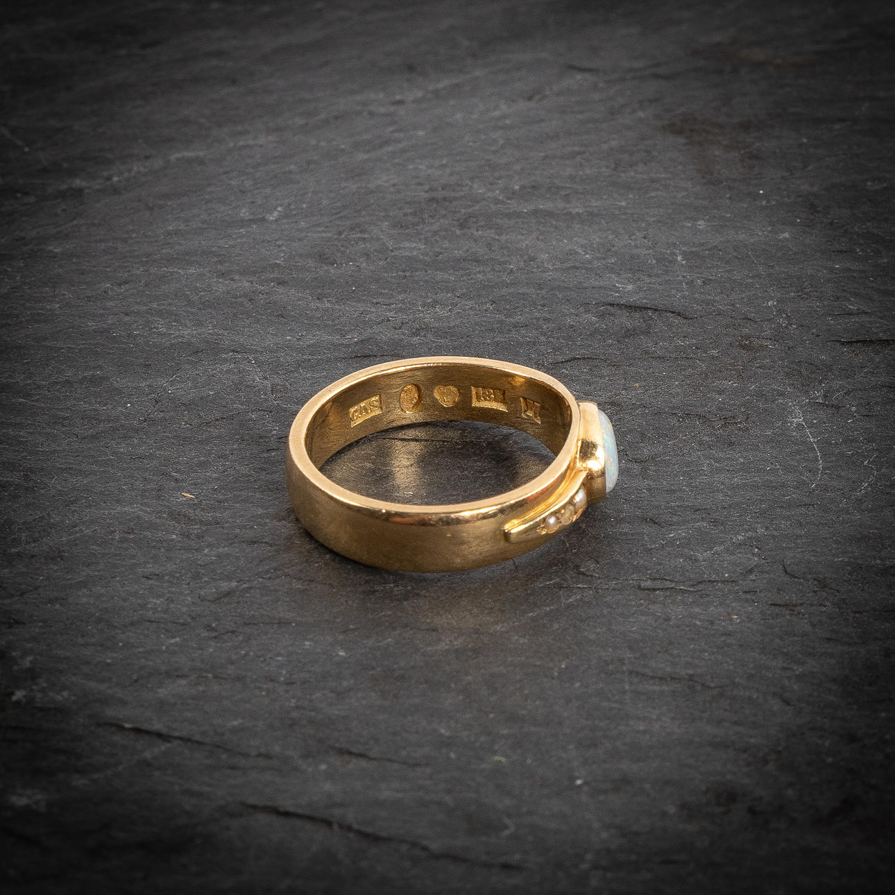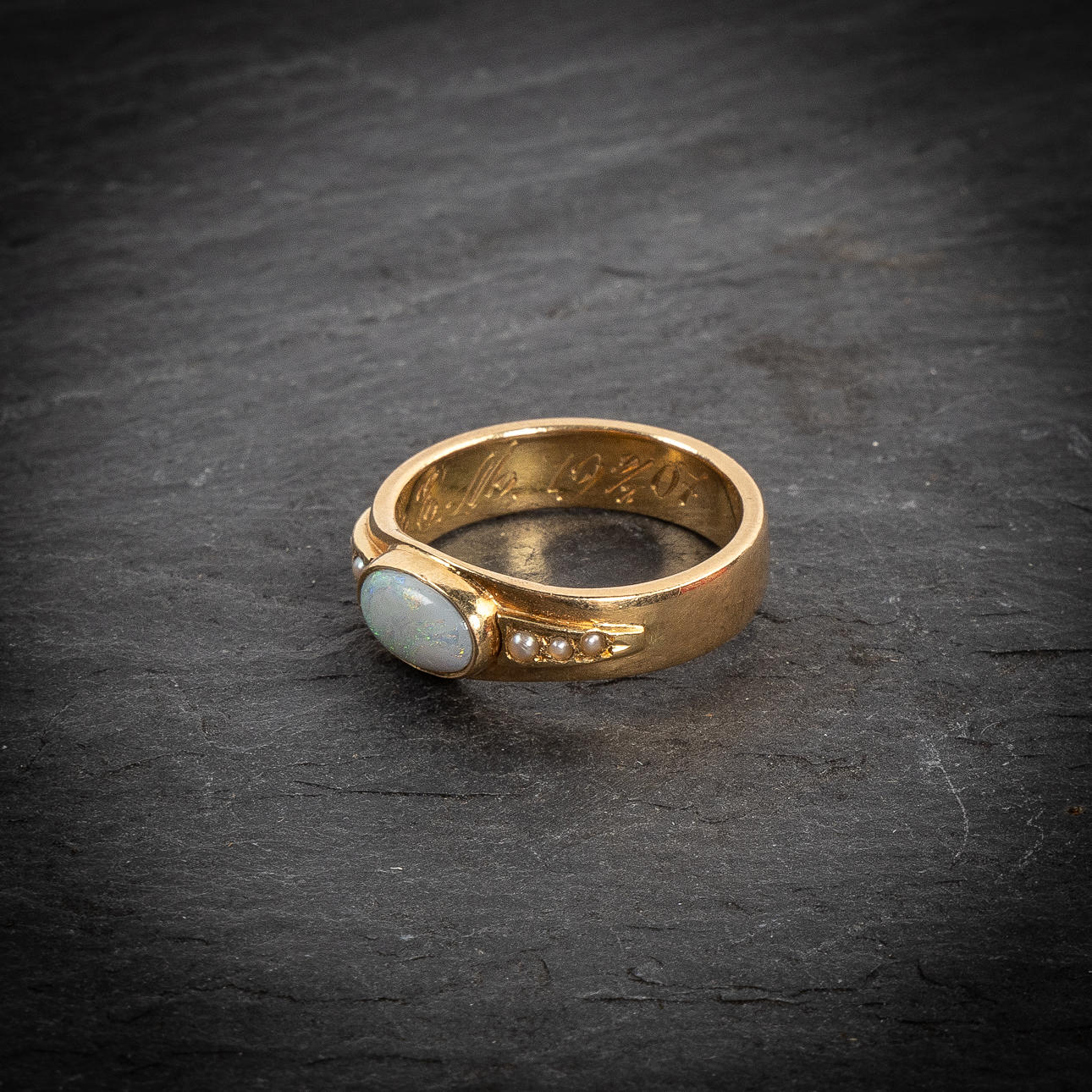 Infattad med cabochonslipad opal samt små orientpärlor. Ringstrl. ca 55/17,5 mm. Vikt ca 6,2 gram.
