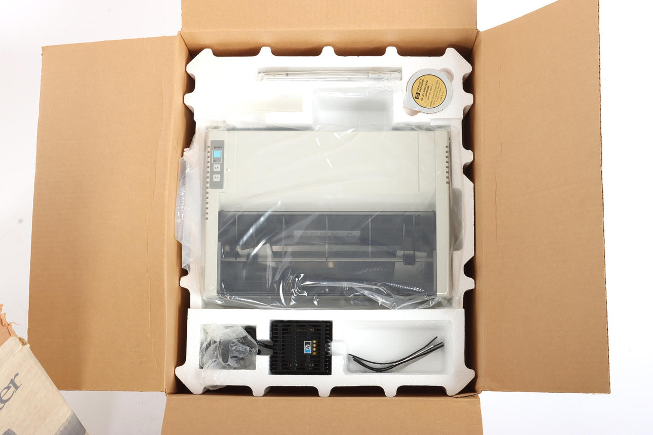HP-skrivare, "Thinkjet Printer"** och HP-pappershållare, "Thinkjet Printer Pack". Skrivare i originalförpackning med tillbehör. MODEL NO. 2225B. 1980-tal.