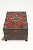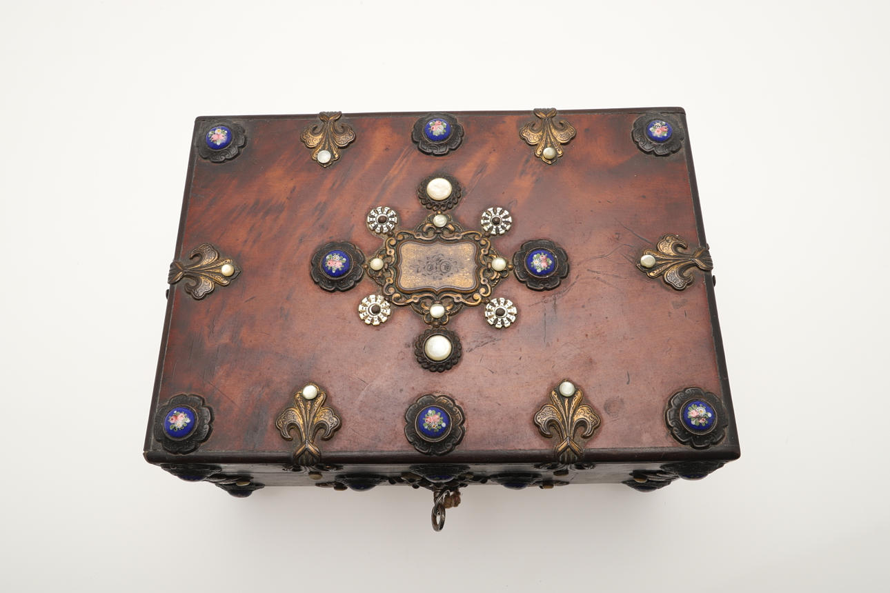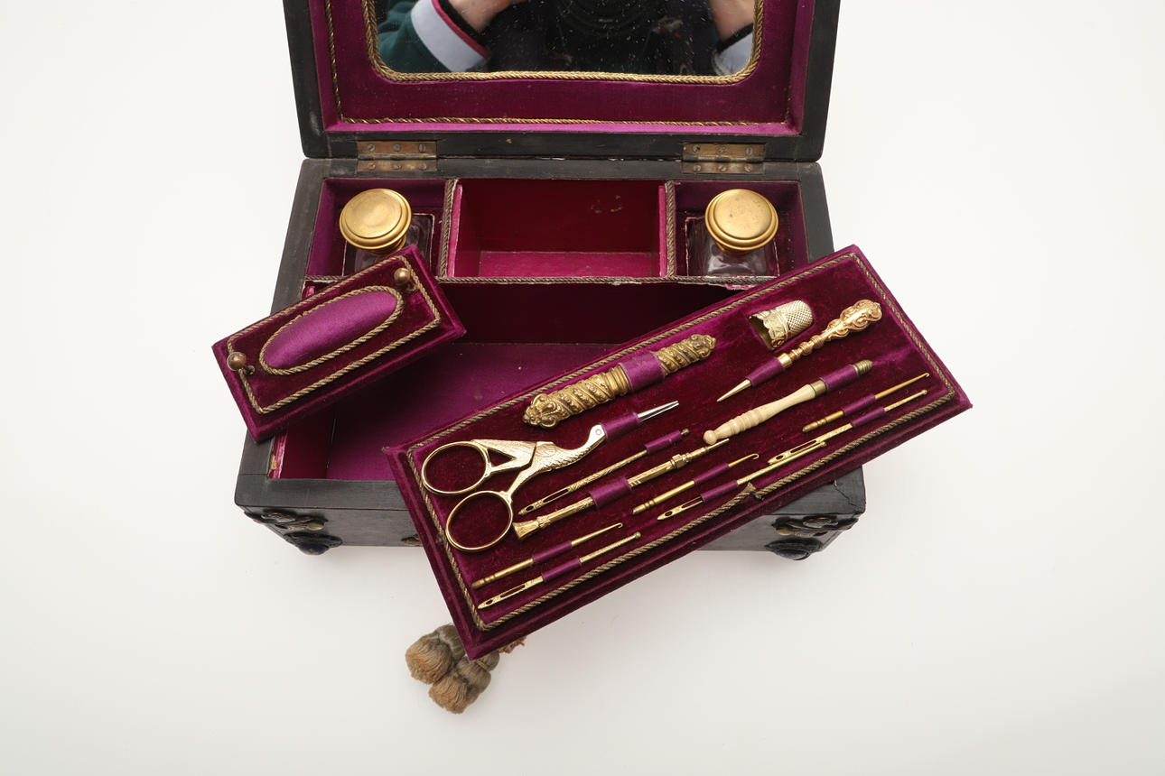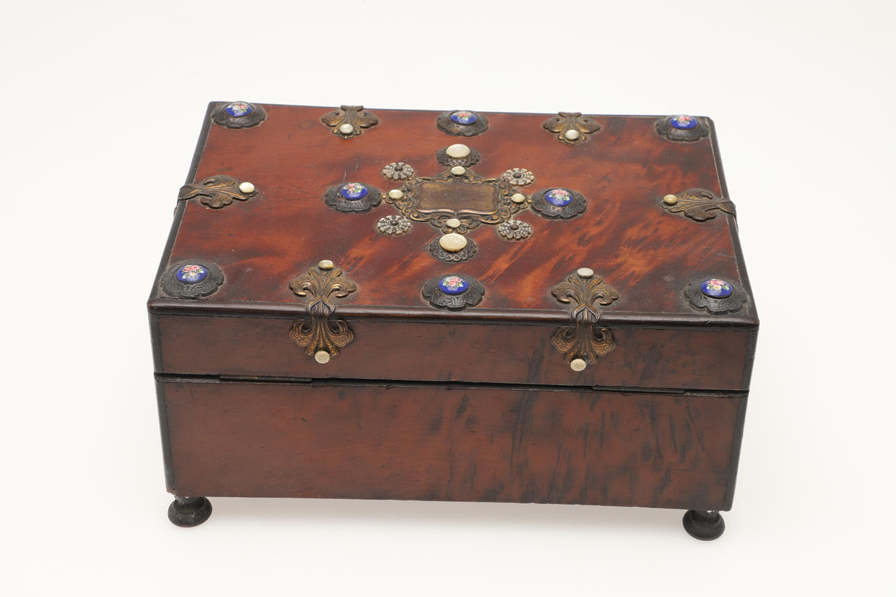 En sylåda i trä från 1800-talet, med applicerad emalj, mässing och pärlemordekoration, med en silke- och sammetlila fodrad interiör utrustad med sömnadsföremål och ett par glasflaskor. Box 22,5 cm x 16 cm.