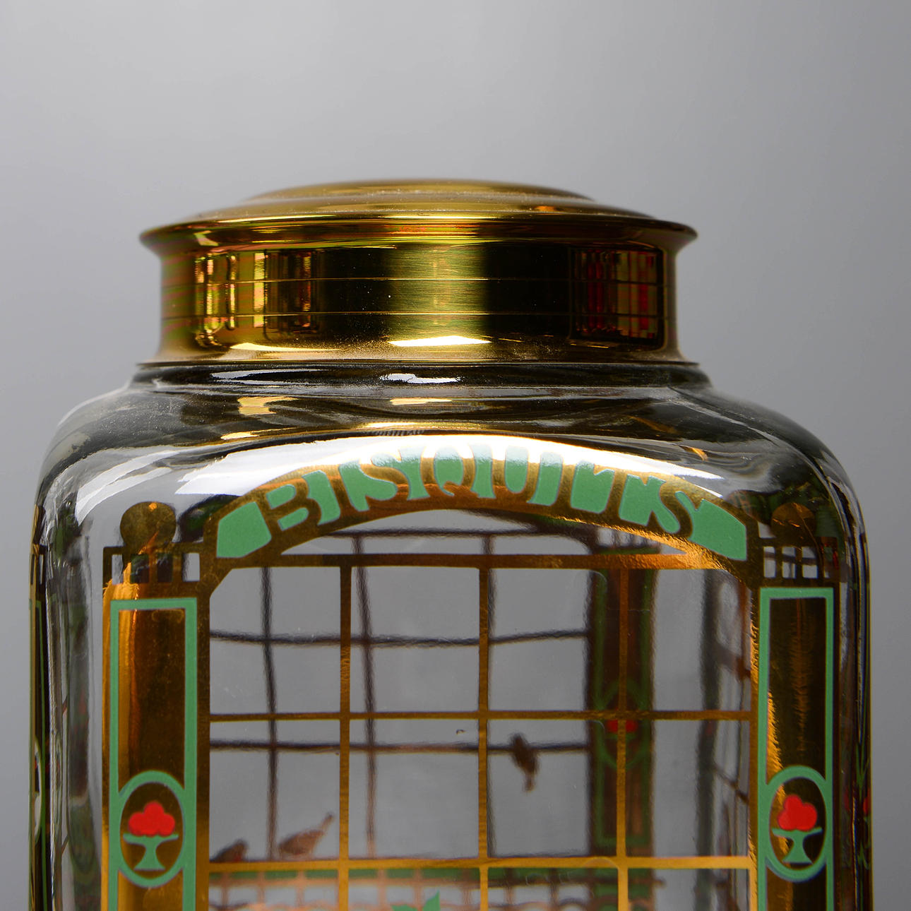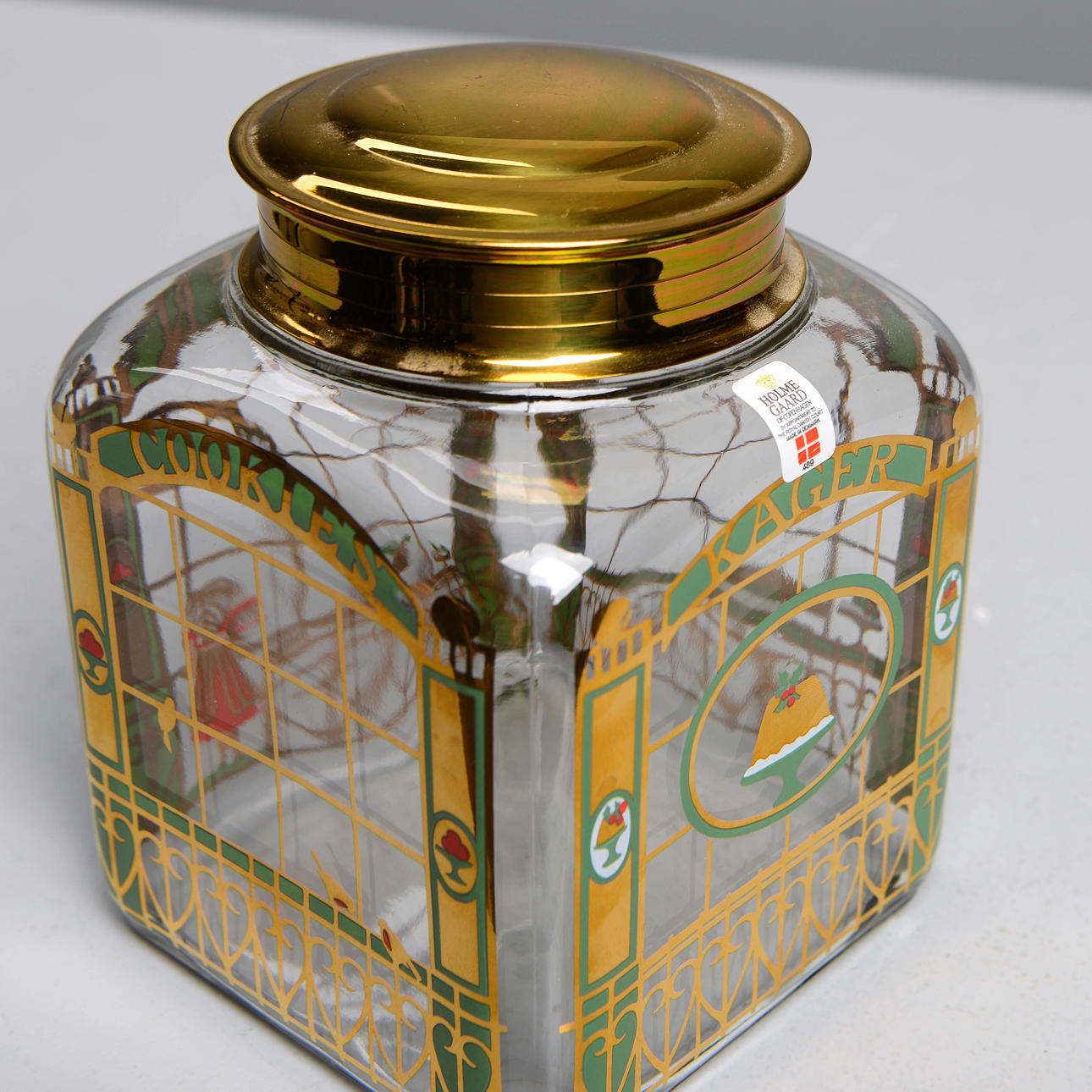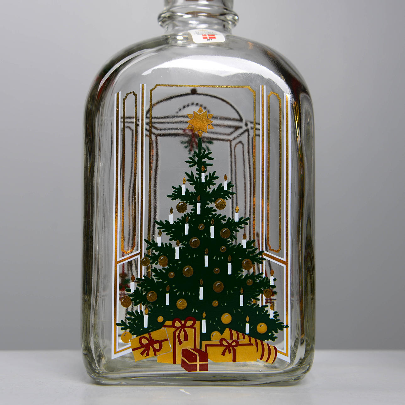 Karaff med julmotiv. Kakburk med dekor av skyltfönster från bageri.