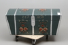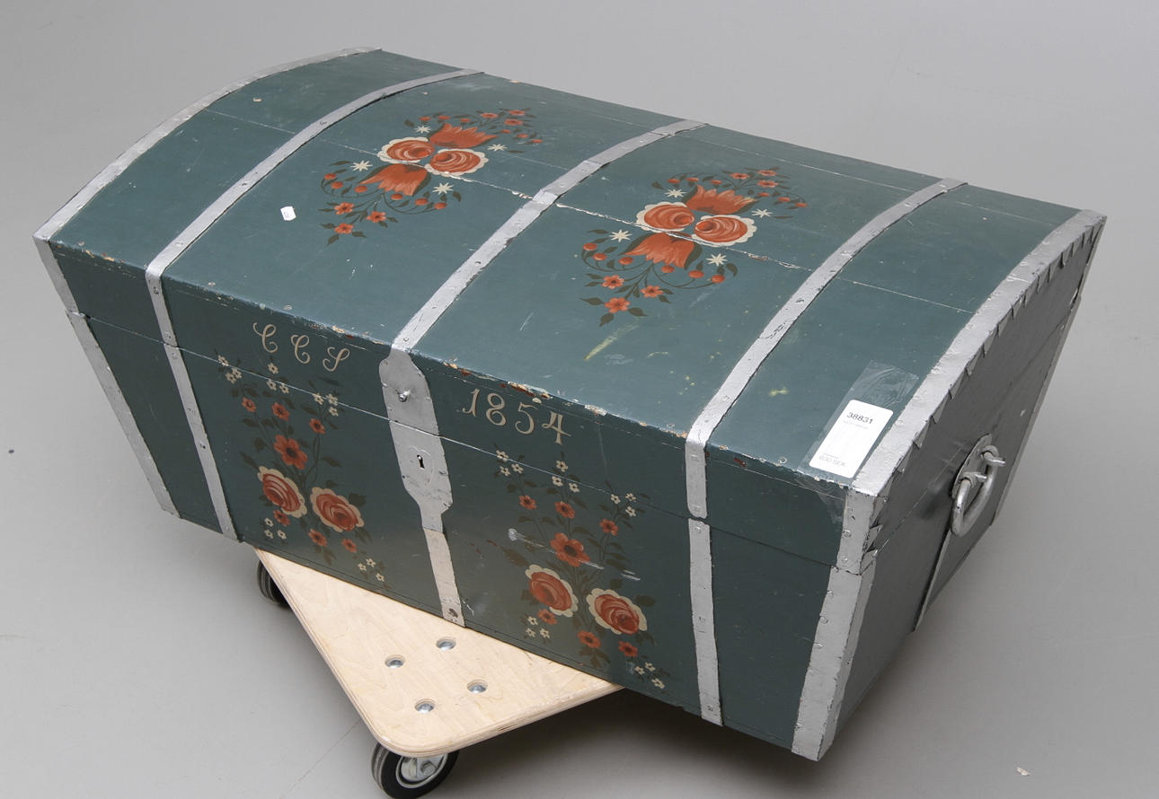 Grönmålad kista med blomsterdekor, beslag och handtag av järn, välvt lock, daterad 1854. Längd 100, bredd 60 cm.