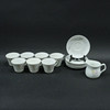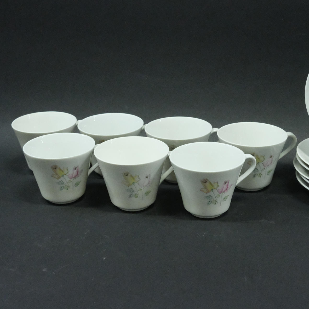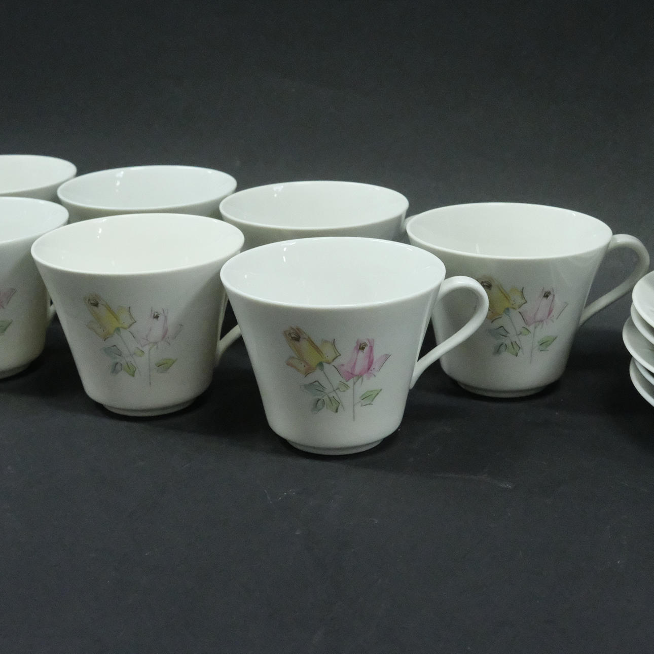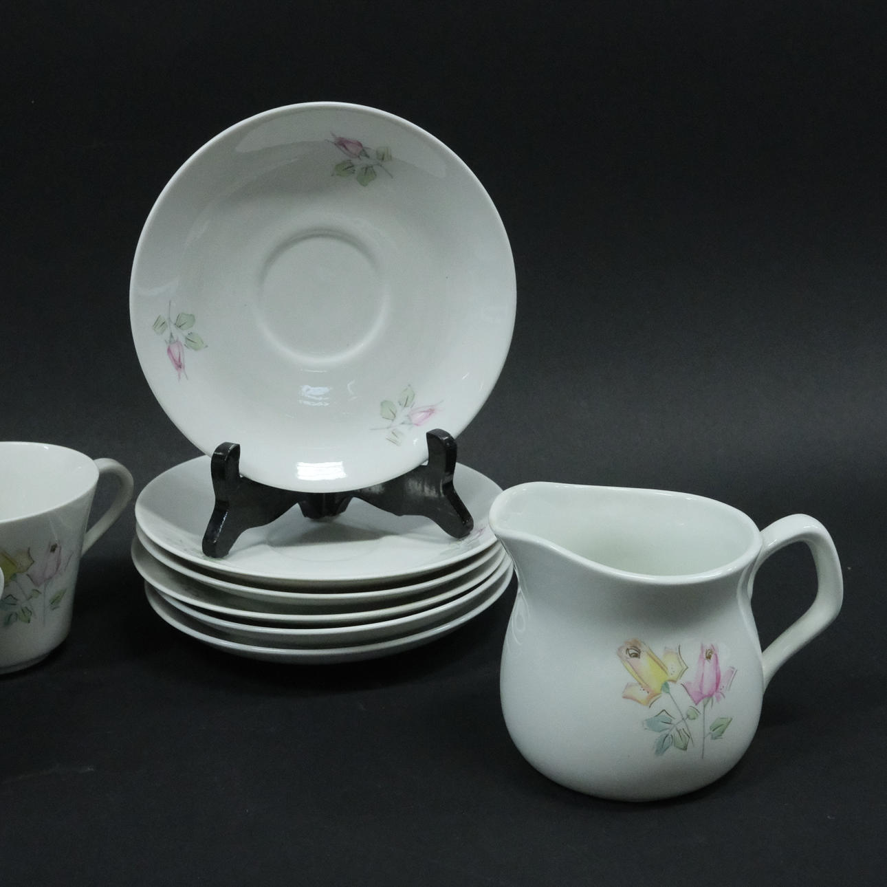 Sju koppar, höjd 8cm, diam. 9,5cm. Sex fat, diam. 15,5cm. Mjölkkanna, höjd 9,5cm.