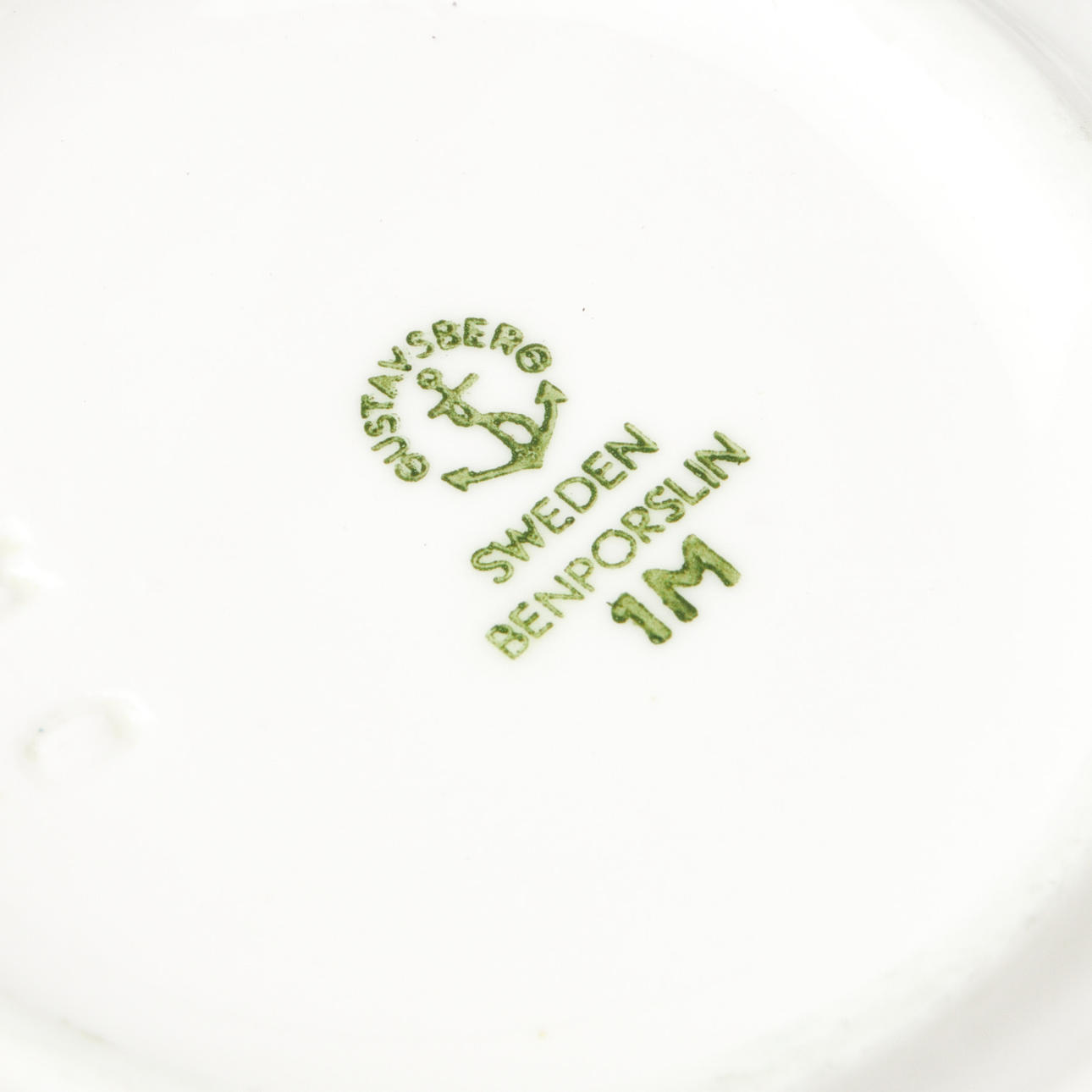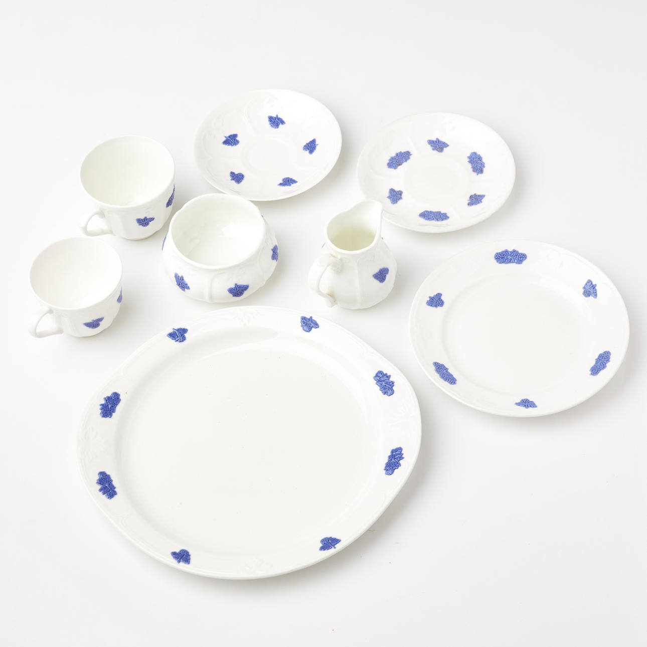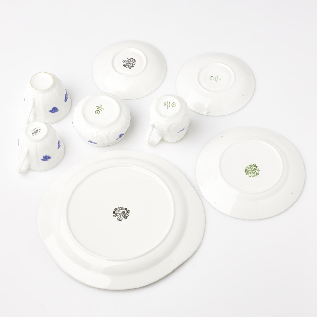 Bestående av: Kaffekoppar med fat, 4 st, höjd ca 7 cm Kaffekoppar med fat, 5 st, höjd ca 6,5 cm Assietter ca 9 st Kakfat Sockerskål Mjölkkanna.