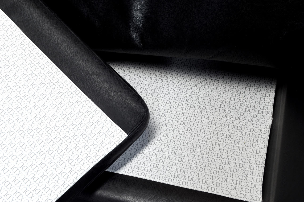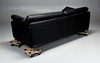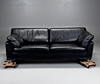 Helstoppad tresitssoffa klädd i svart läder. Lösa sitt- rygg-, och armlänsplymåer.