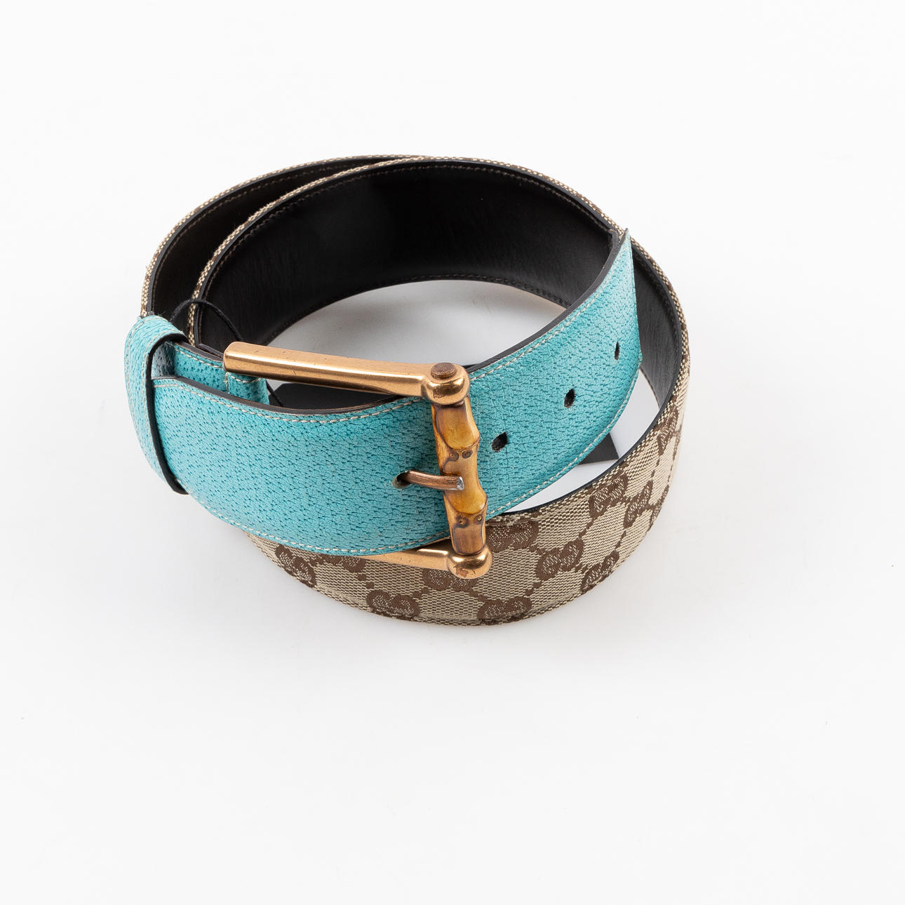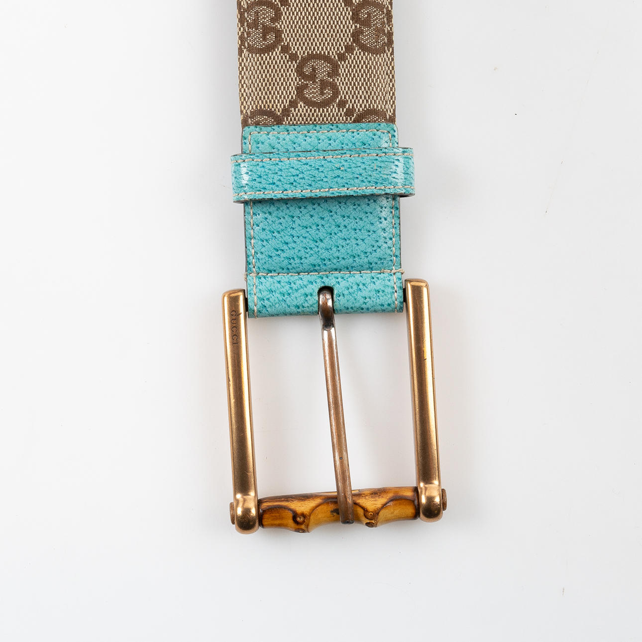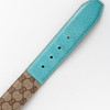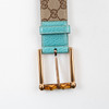 Rem i monogram canvas med detalje i turkosefärgat läder, spänne i mässingsfärgad metall med bambu. Märkt ® GUCCI, MADE IN ITALY, 121285 1766 85 34, storlek 85/34, omkrets ca 75-85 cm. Påse medföljer.