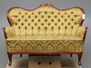 Stomme av mahogny, skuren dekor på krön med ros och blad, klädd i gul klädsel. Längd 140 cm.