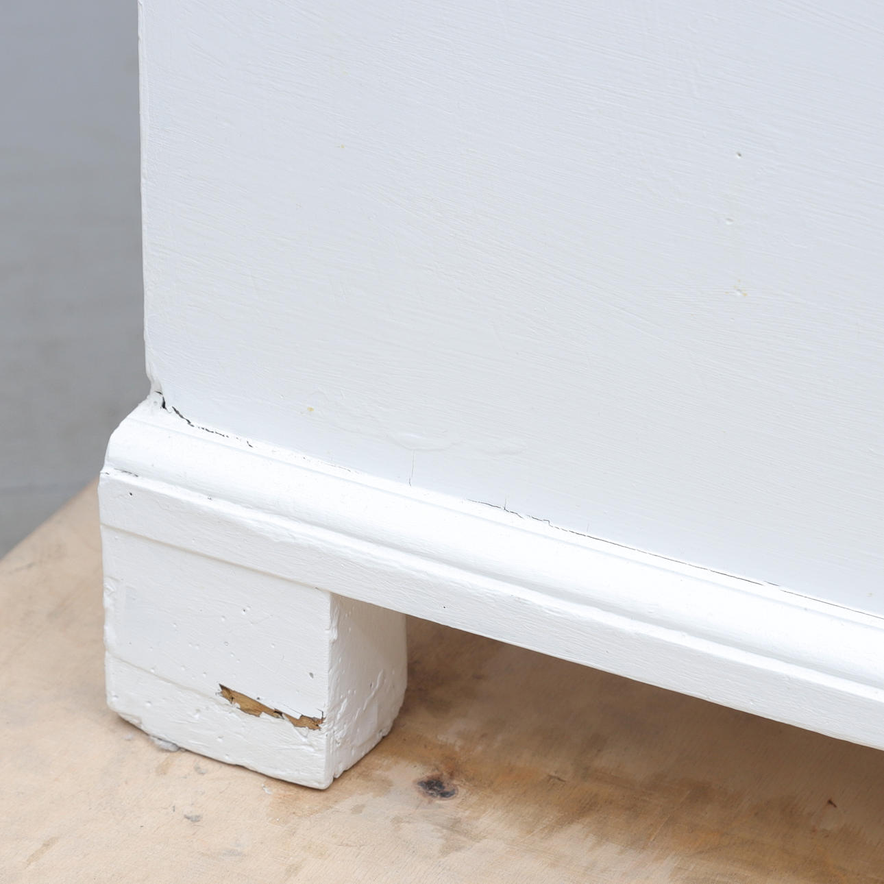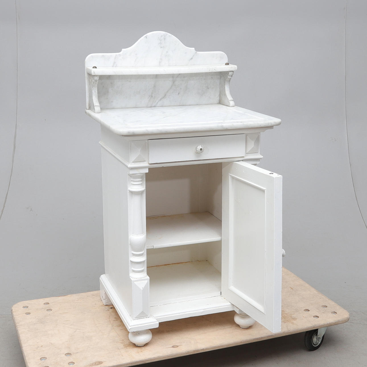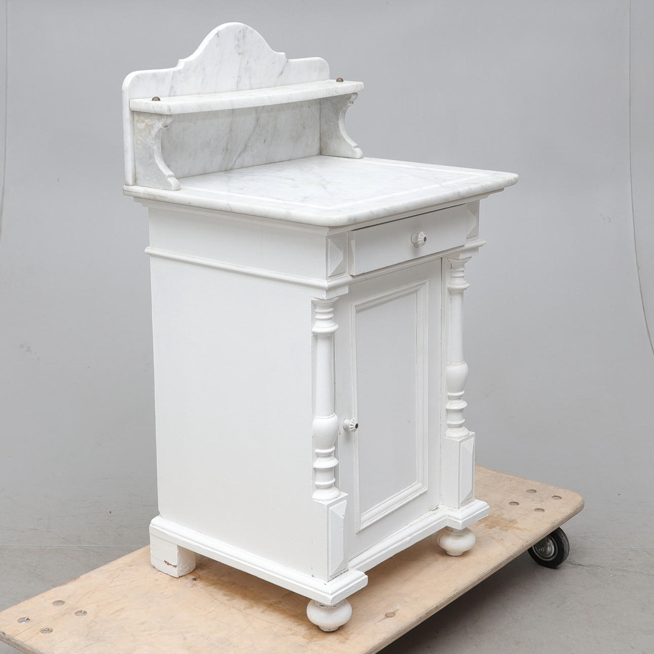 Bruksslitage. Report och märken. Lös fot samt marmordelar. Senare bemålad. Sprickor. Kärvande låda. MIndre nagg på skiva.