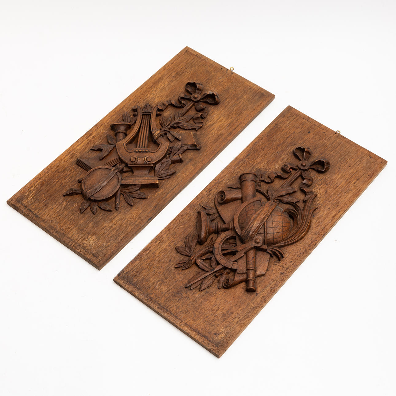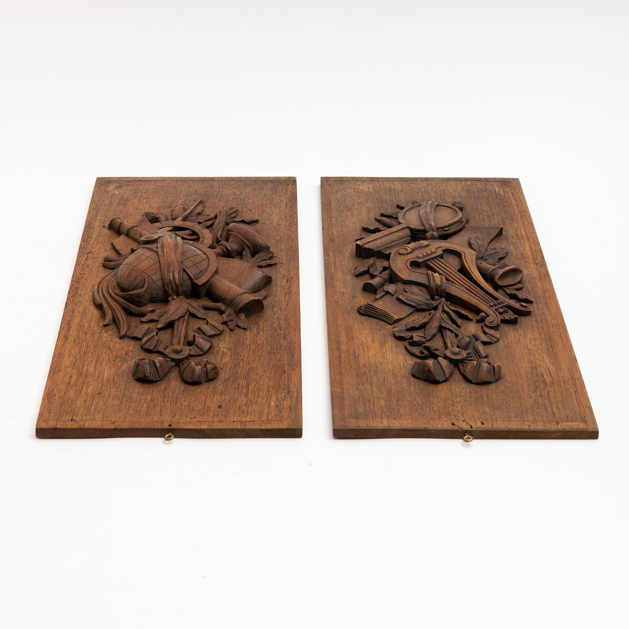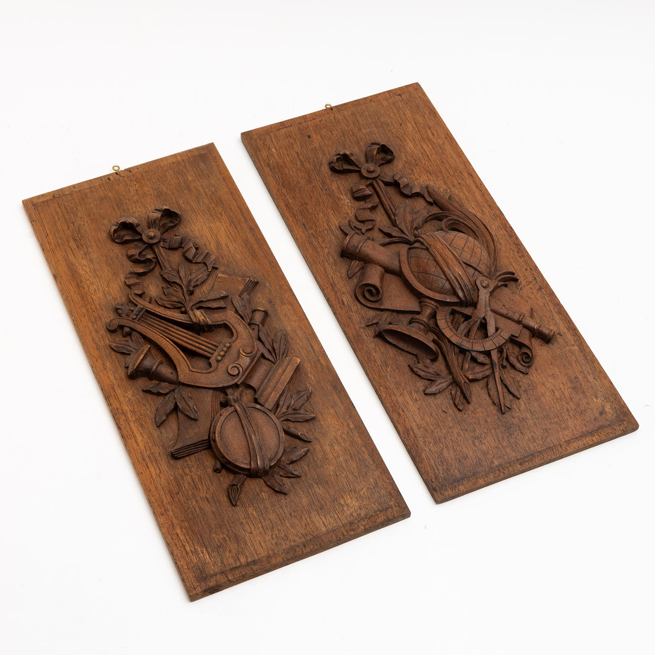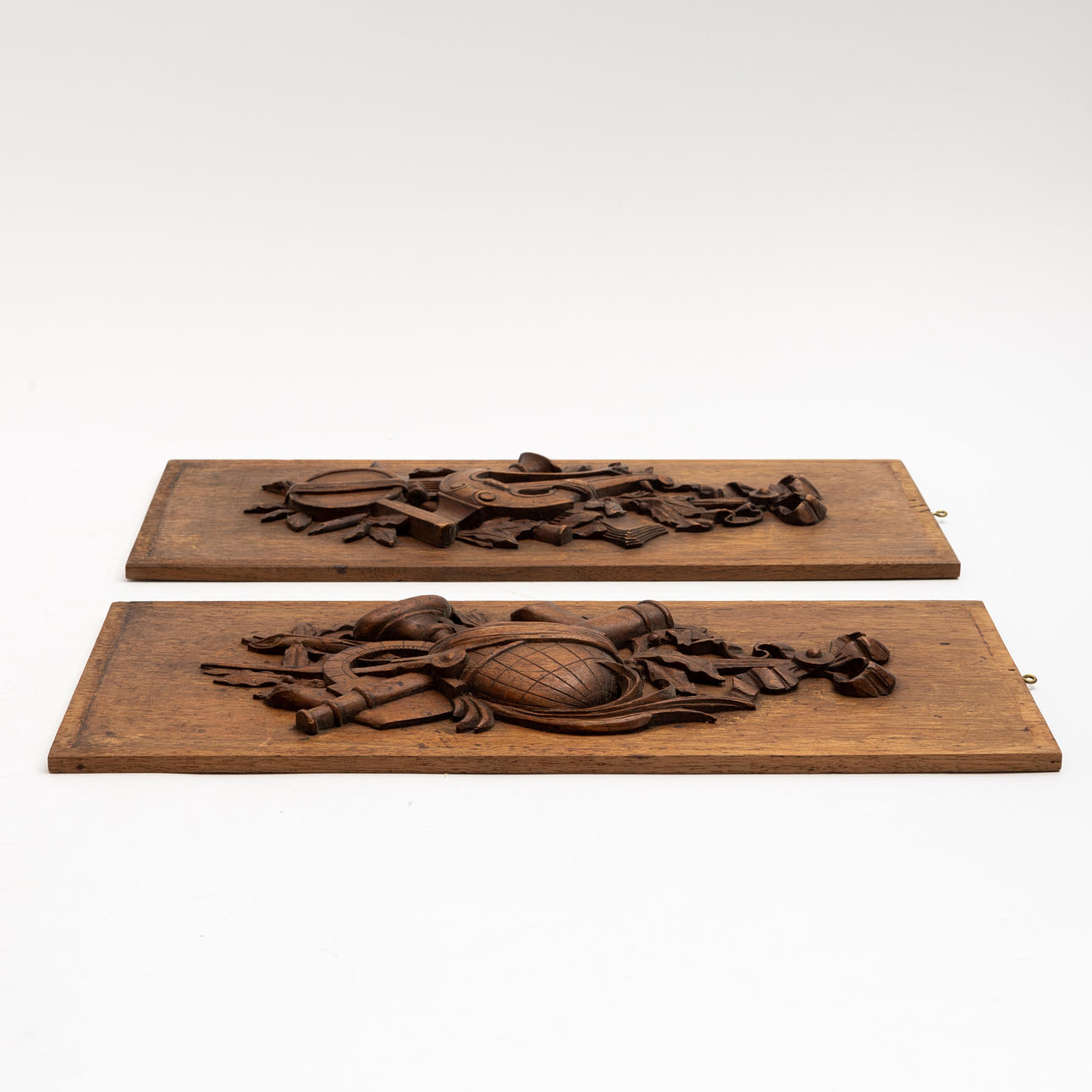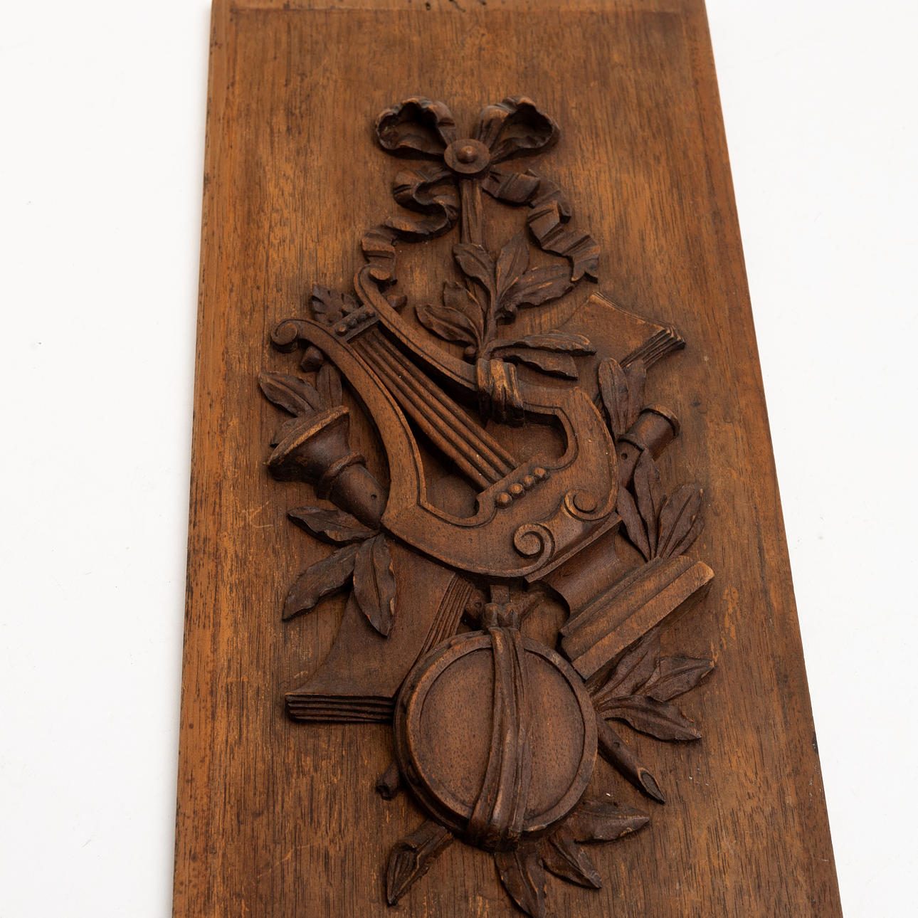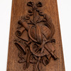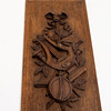 Rektangulär form, skuren dekor i form av trofégrupper bla rosetter, jordglob och lyra, längd ca 40,5 och bredd 17,5 cm.