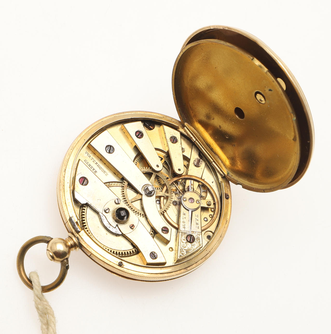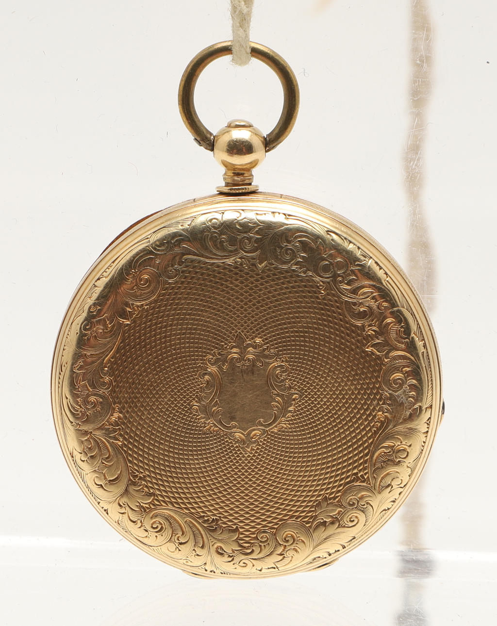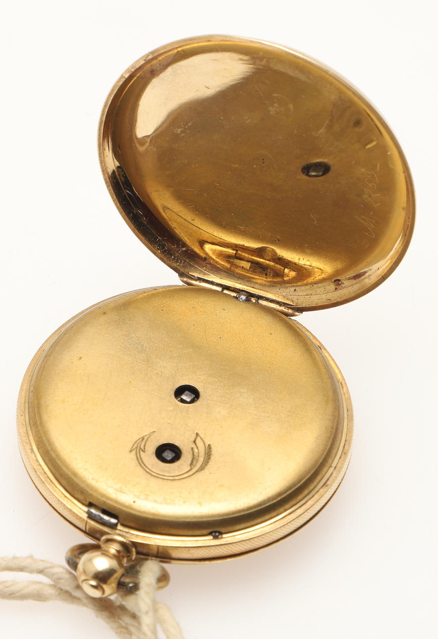 Nyckellindningsklockan i graverat fodral, utan märken (testas som 18kt guld) total vikt 35g.