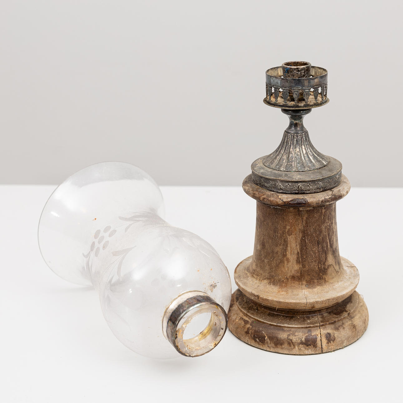 Socklar i trä, nysilver. Kupor i glas. Höjd ca 46 cm.