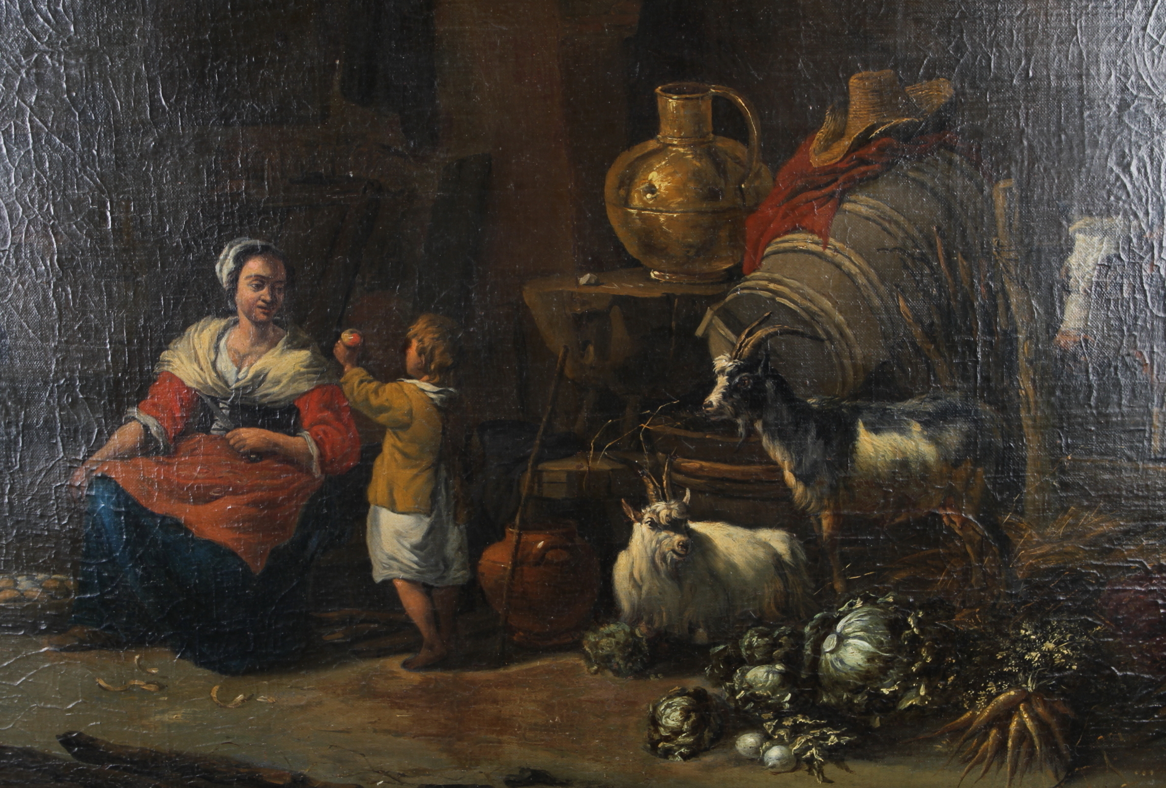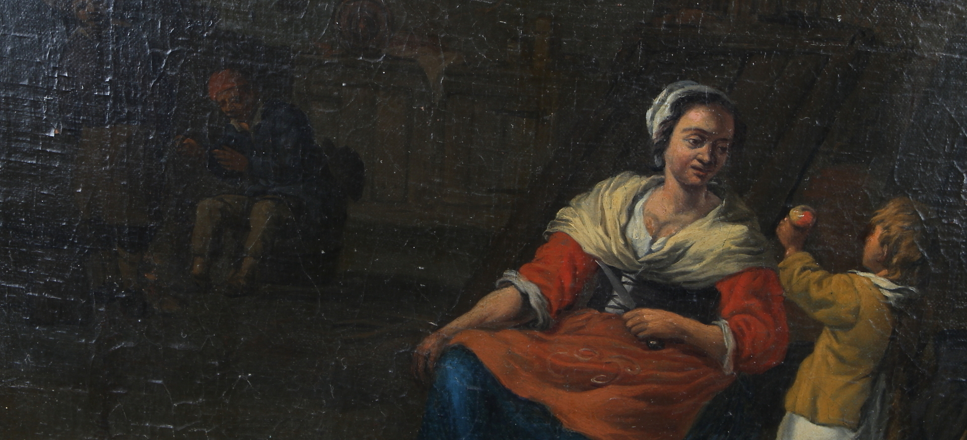 389088. CORNELIS SAFTLEVEN. TILLSKRIVEN. Interiör med mor och barn, olja på duk.