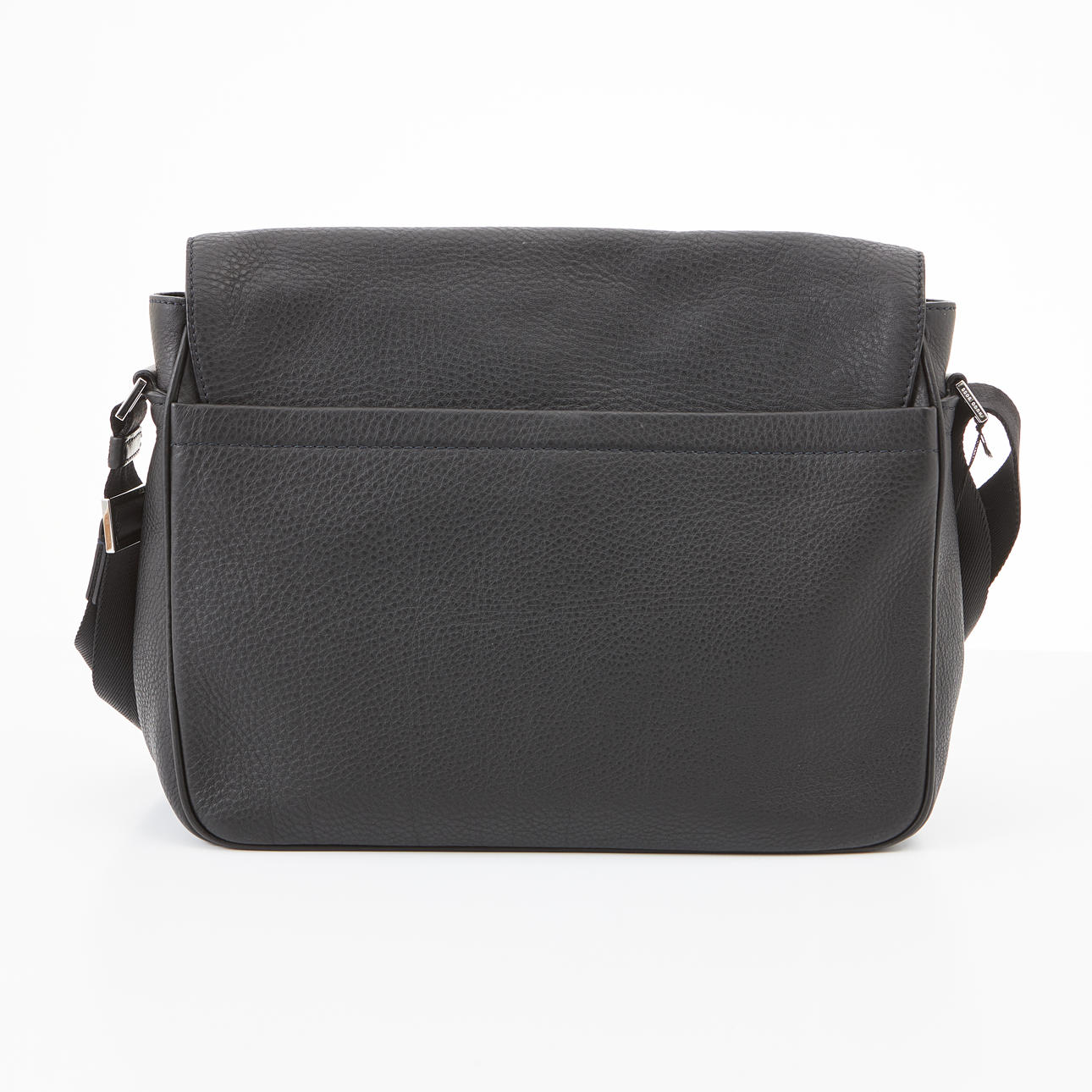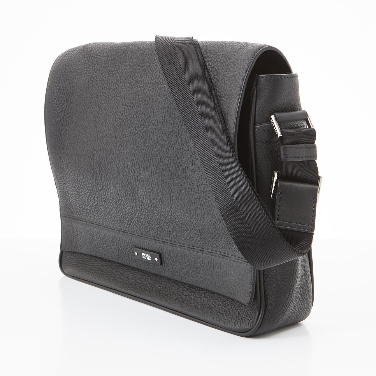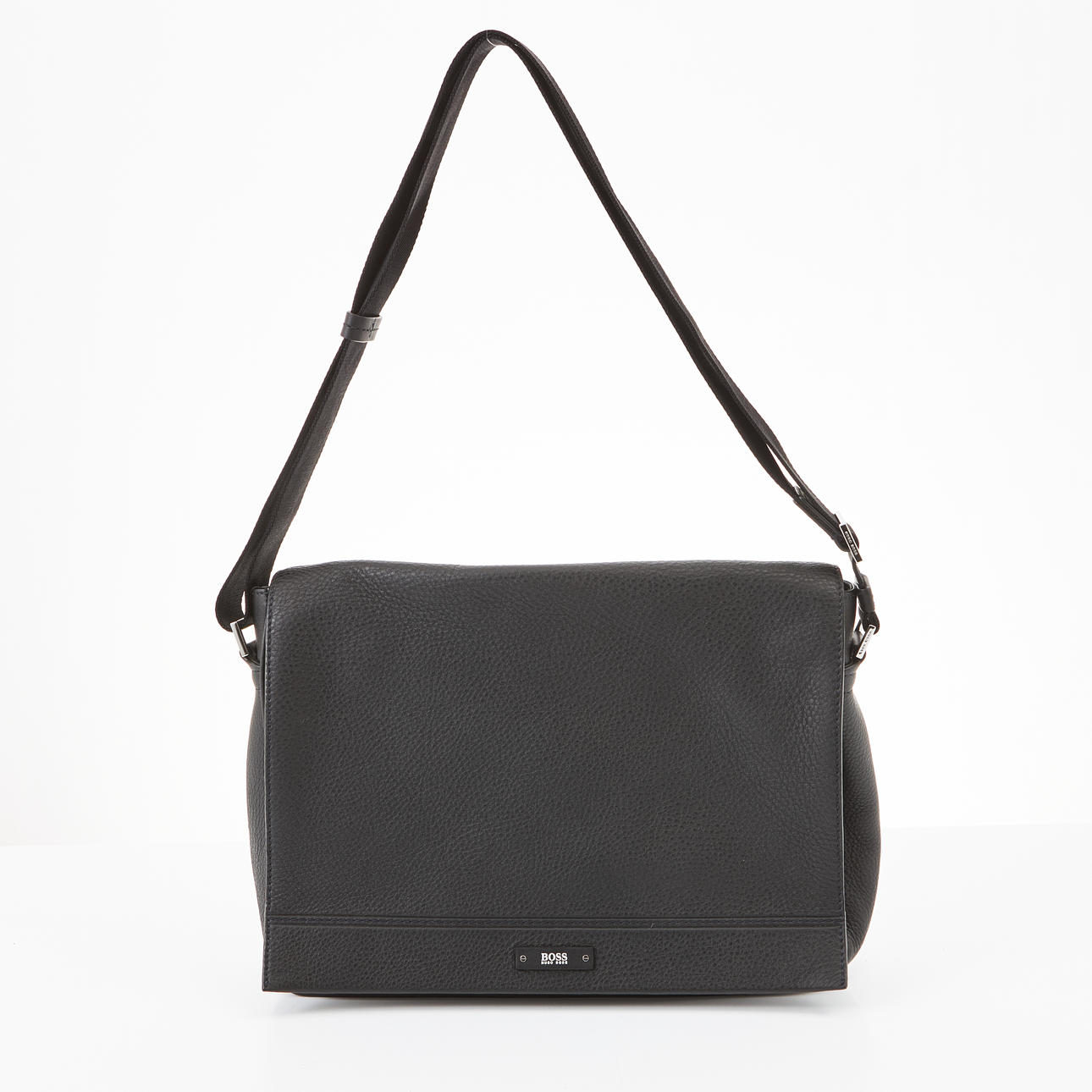 Svart väska i präglat mjukt skinn, crossbodymodell med justerbart axelband, detaljer i vitmetall, magnetstängning, invändigt med fack och ficka med dragkedja, framtill märkt "Boss Hugo Boss", mått ca 36x28x9cm.
